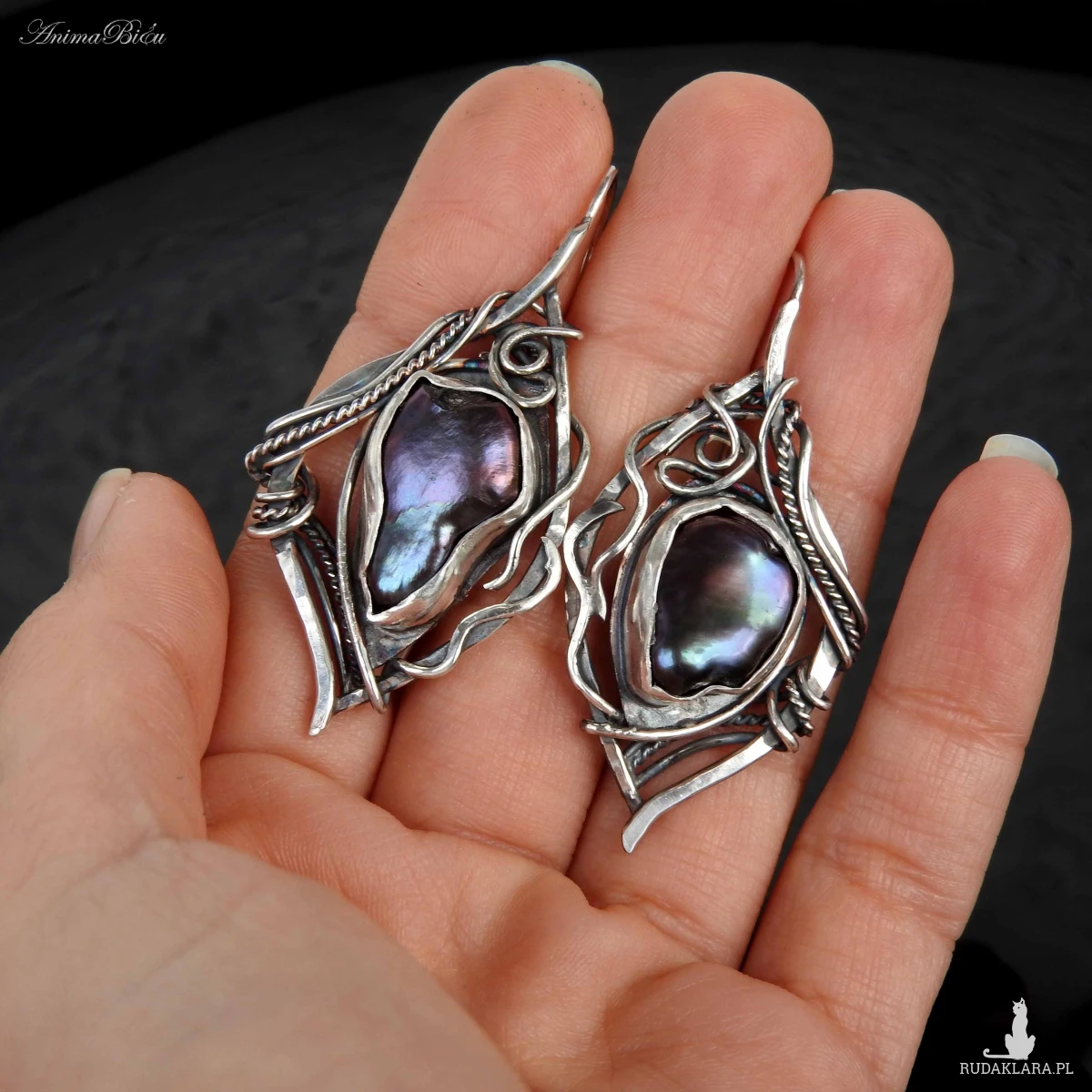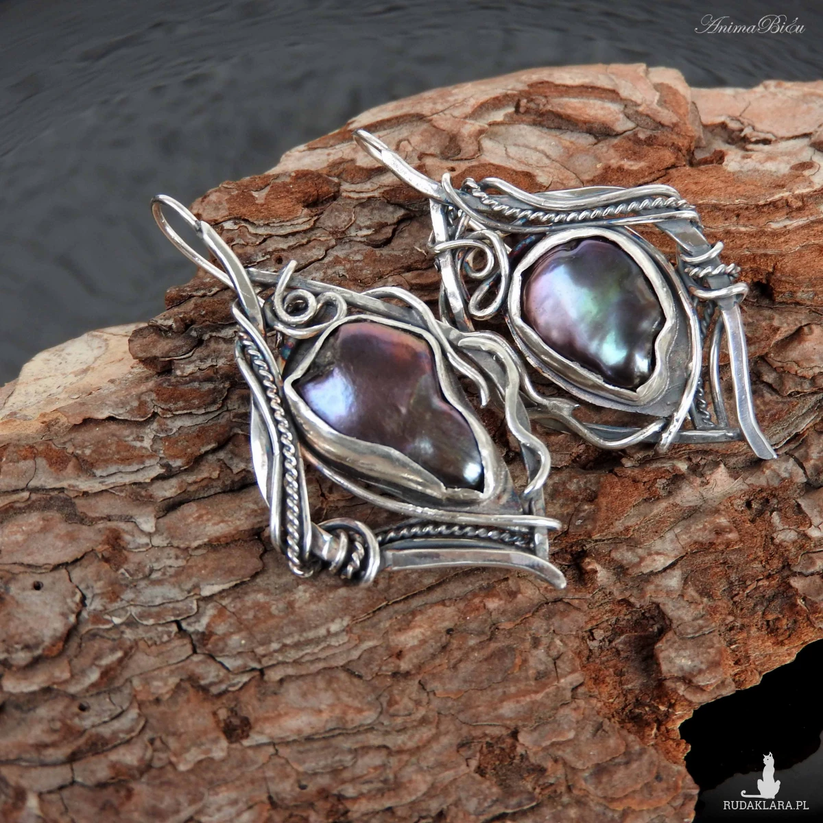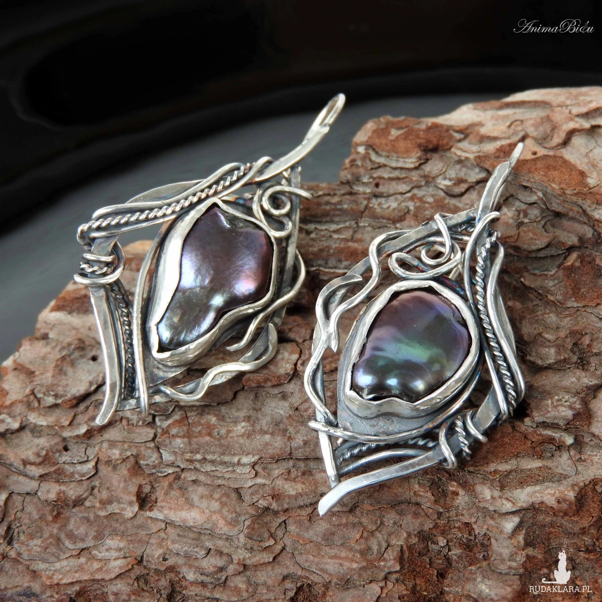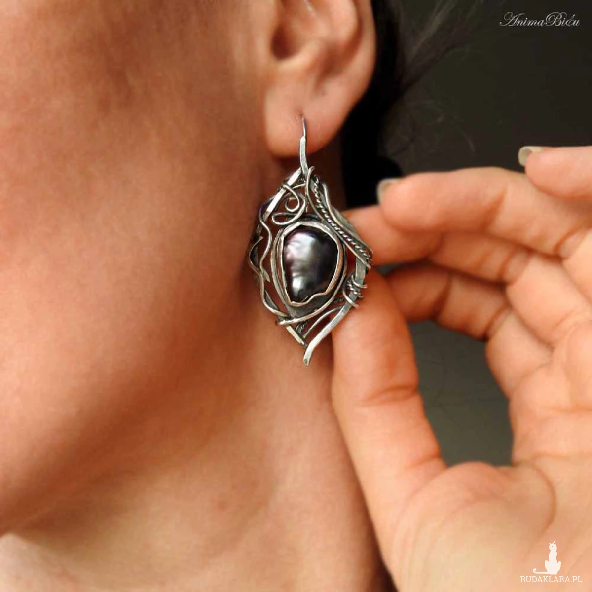 Kolczyki srebrne z barokową czarną perłą. Wykonane od