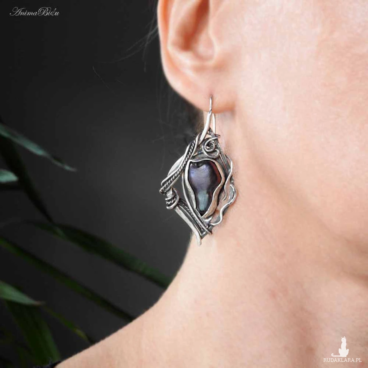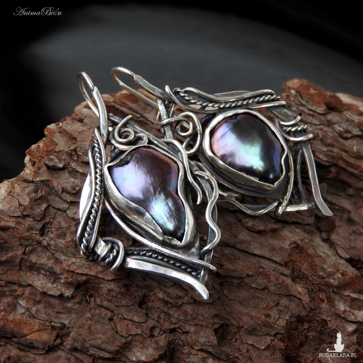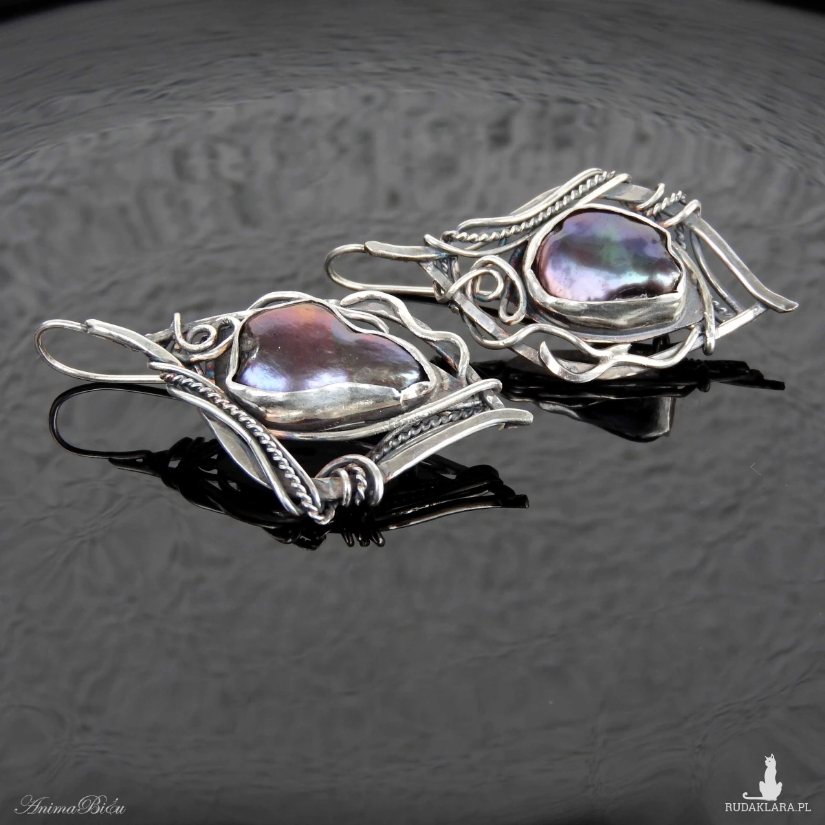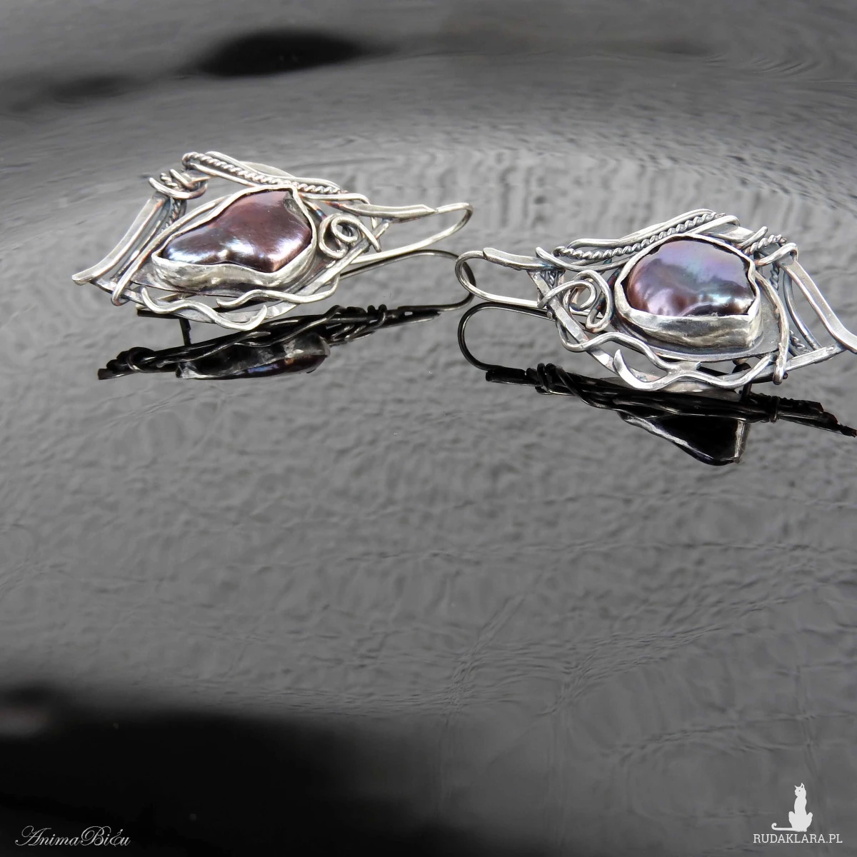 Kolczyki srebrne z barokową czarną perłą. Wykonane od