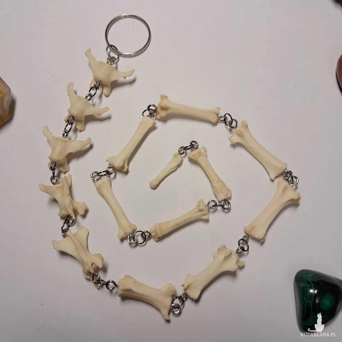 Ten unikatowy brelok został wykonany z autentycznych kości ogonowych lisa, tworząc niezwykłą biżuterię użytkową dla osób ceniących dzikość natury i mistyczną symbolikę. Kości są połączone solidnymi metalowymi ogniwami w srebrzystym odcieniu, które dodają całości surowego, ale jednocześnie eleganckiego charakteru.