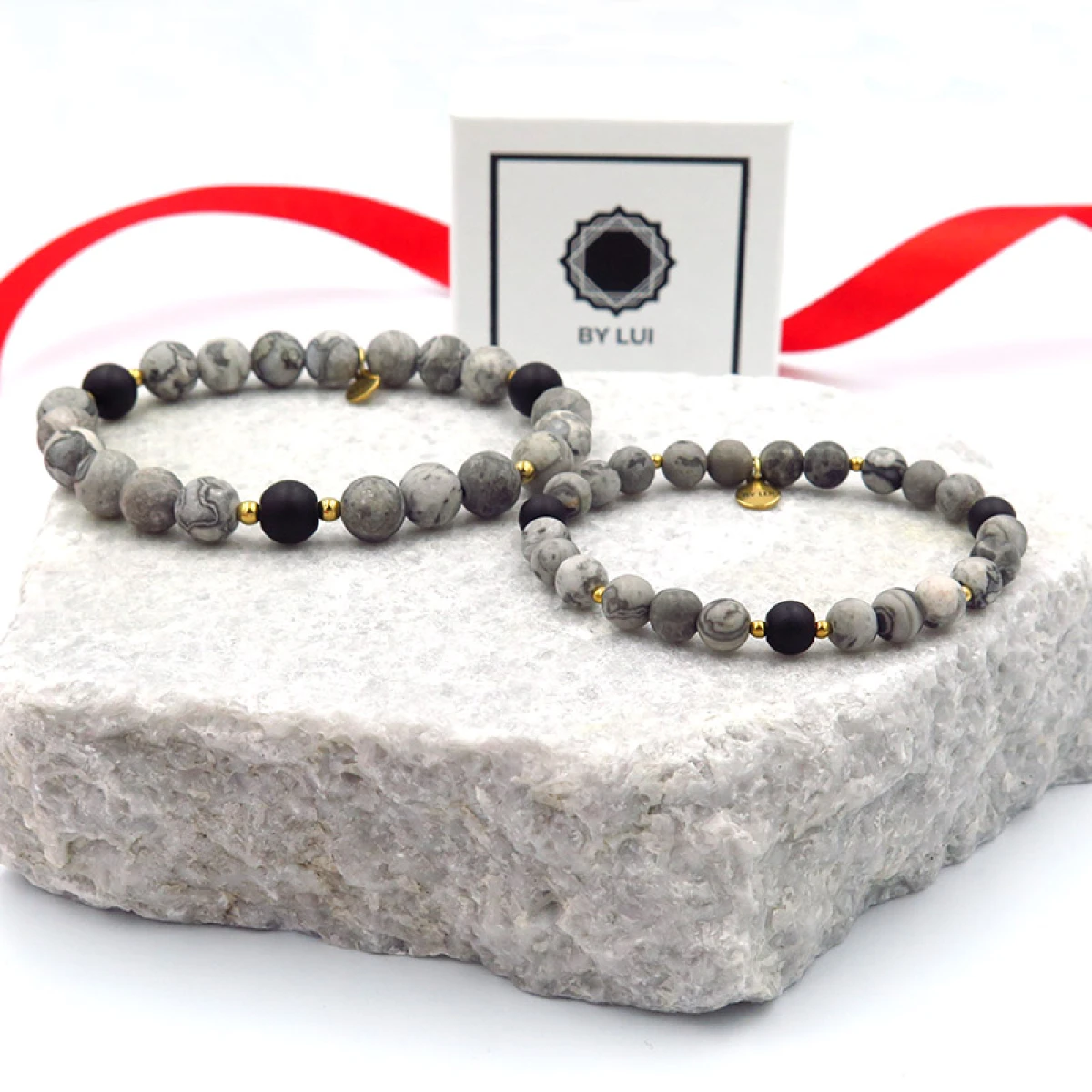 Stockholm to kompozycja szarych, matowych kamieni jaspisu przeplecionych kontrastowymi czarnymi onyksami i małymi złotymi kuleczkami hematytu.