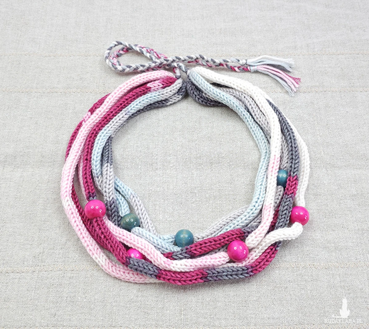 Materiały: włóczka, drewniane koraliki.