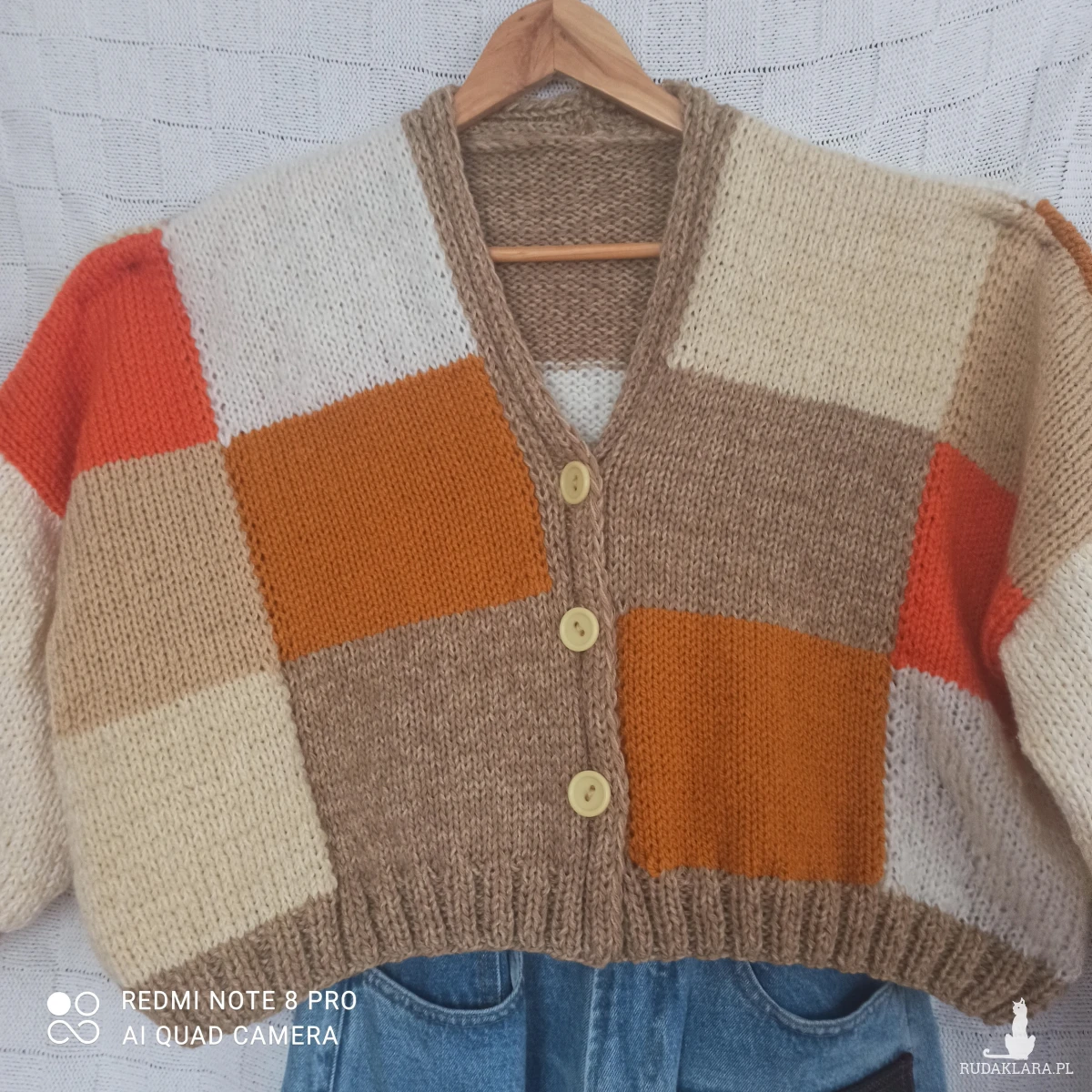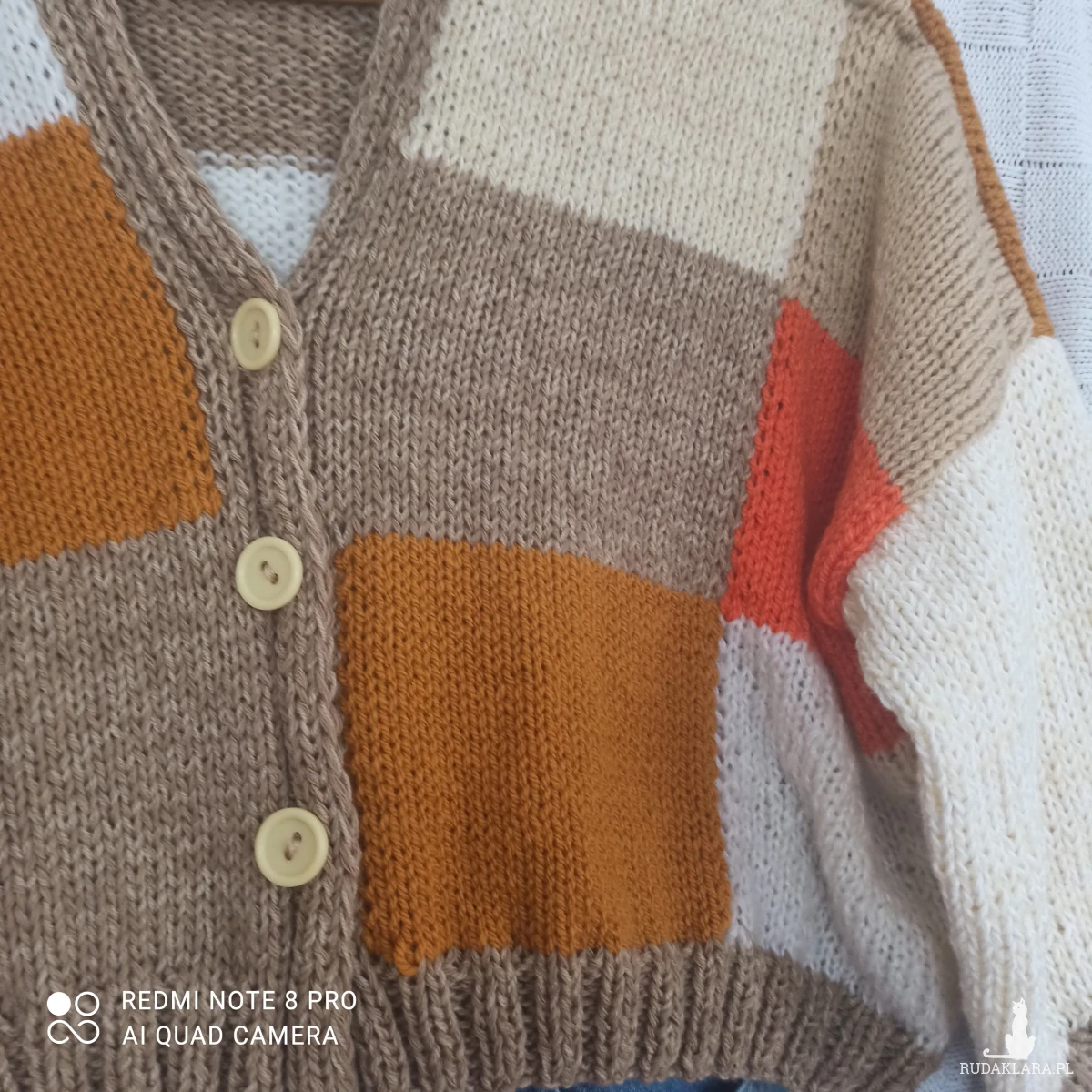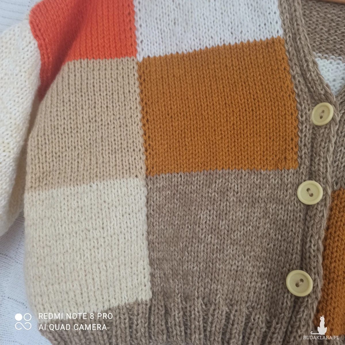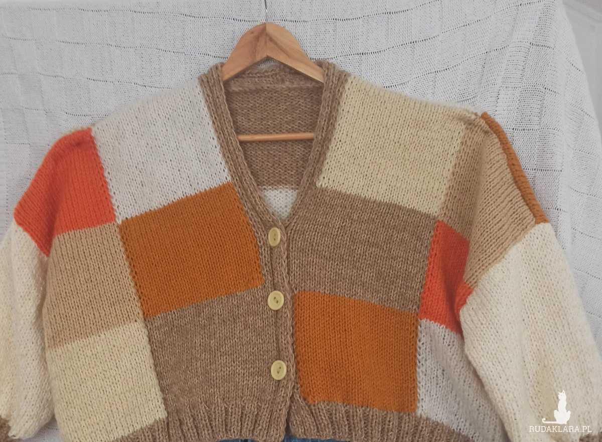 Obszerny kolorowy kardigan w kratkę z tych krótkich zapinany na 3 guziki, raczej młodzieżowy chociaż kto wie...U dołu pliska /nie doszywana/ szeroka na 4,5 cm, przy rękawach mankiet o długości 9,5 cm, od nich rękaw przechodzi w bufkę. Wykonany z nici Woll Butt 25% wełny, 65% akrylu, 10 % poliamid. Kolory znakomite na wiosnę i letnie wieczory: główny kolor to beż połączony z pomarańczowym, białym, ecru, musztardowym. Kolory bardzo modne w tym sezonie. Sweter wykonany ręcznie na drutach nr 6. Przód i tył w kratkę ułożoną niesymetrycznie kolorami. Pliska i mankiety wykonane ściegiem ściągaczowym 2 oczka lewe, dwa oczka prawe. Ciepły, obszerny, opadające ramiona, na topie ze spodniami wygląda super. Dobrze przepuszcza powietrze i trzyma temperaturę ze względu na zastosowane nici i ich strukturę. Z gwarancją, że jest tylko jeden taki.