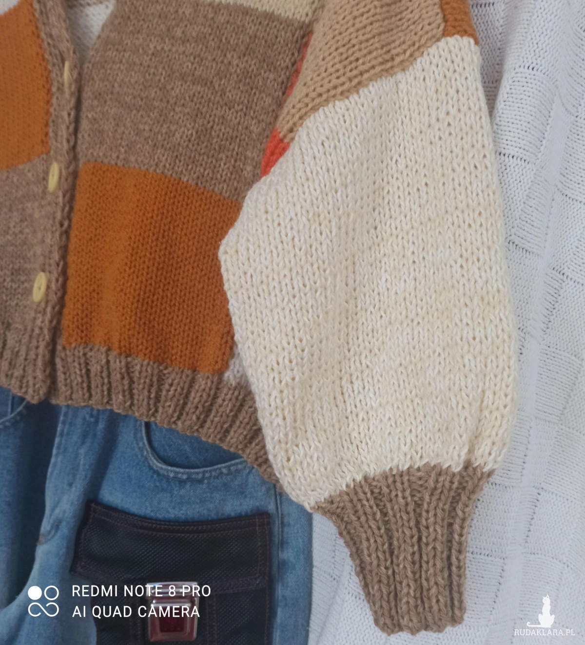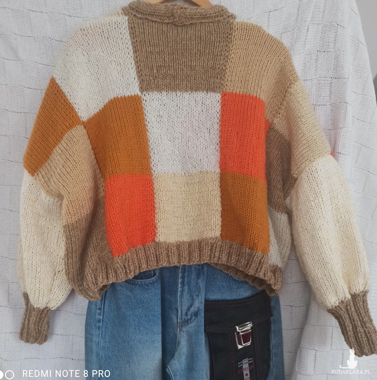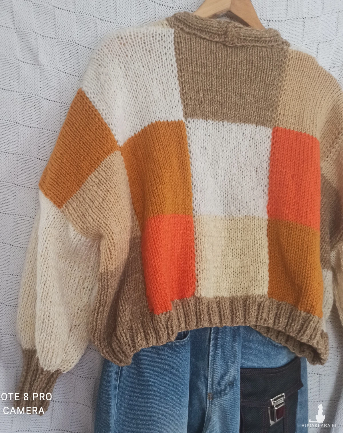 Obszerny kolorowy kardigan w kratkę z tych krótkich zapinany na 3 guziki, raczej młodzieżowy chociaż kto wie...U dołu pliska /nie doszywana/ szeroka na 4,5 cm, przy rękawach mankiet o długości 9,5 cm, od nich rękaw przechodzi w bufkę. Wykonany z nici Woll Butt 25% wełny, 65% akrylu, 10 % poliamid. Kolory znakomite na wiosnę i letnie wieczory: główny kolor to beż połączony z pomarańczowym, białym, ecru, musztardowym. Kolory bardzo modne w tym sezonie. Sweter wykonany ręcznie na drutach nr 6. Przód i tył w kratkę ułożoną niesymetrycznie kolorami. Pliska i mankiety wykonane ściegiem ściągaczowym 2 oczka lewe, dwa oczka prawe. Ciepły, obszerny, opadające ramiona, na topie ze spodniami wygląda super. Dobrze przepuszcza powietrze i trzyma temperaturę ze względu na zastosowane nici i ich strukturę. Z gwarancją, że jest tylko jeden taki.
