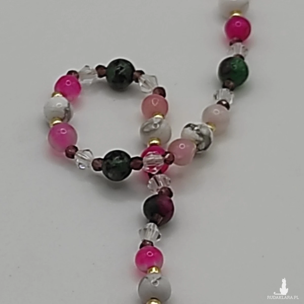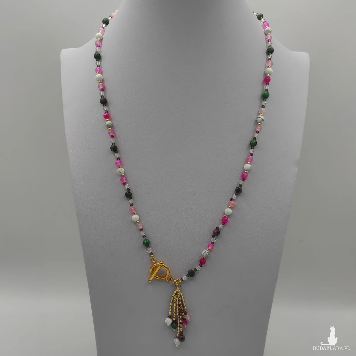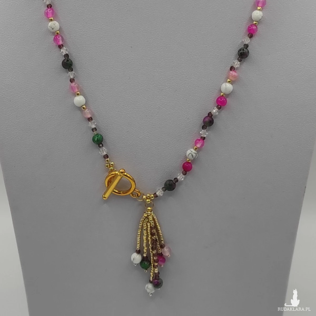 Delikatny naszyjnik zrobiłam z kamieni naturalnych na przemian : agat różowy, biały turkus, kwarc rubinowy 4mm , szlifowane kryształki i koraliki toho. Zawieszka z koralików .Wszystkie elementy wykończeniowe ze stali szlachetnej w kolorze złotym . Długość 50 cm