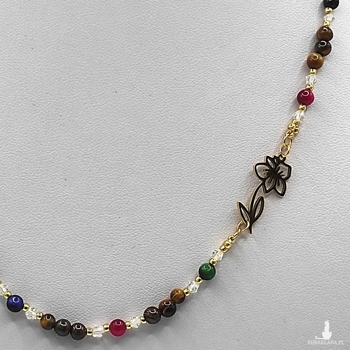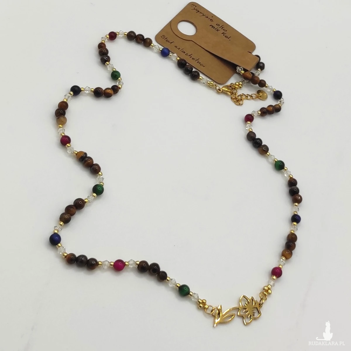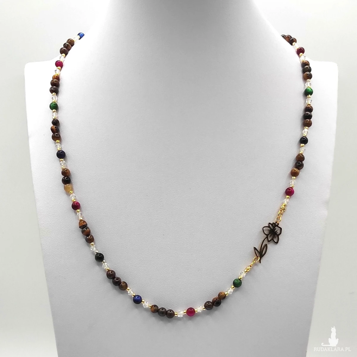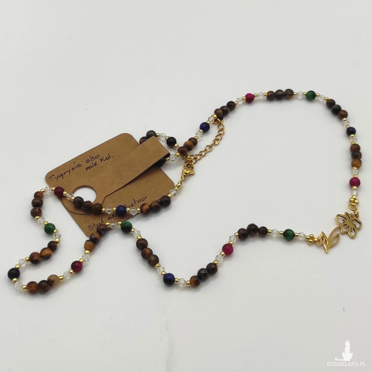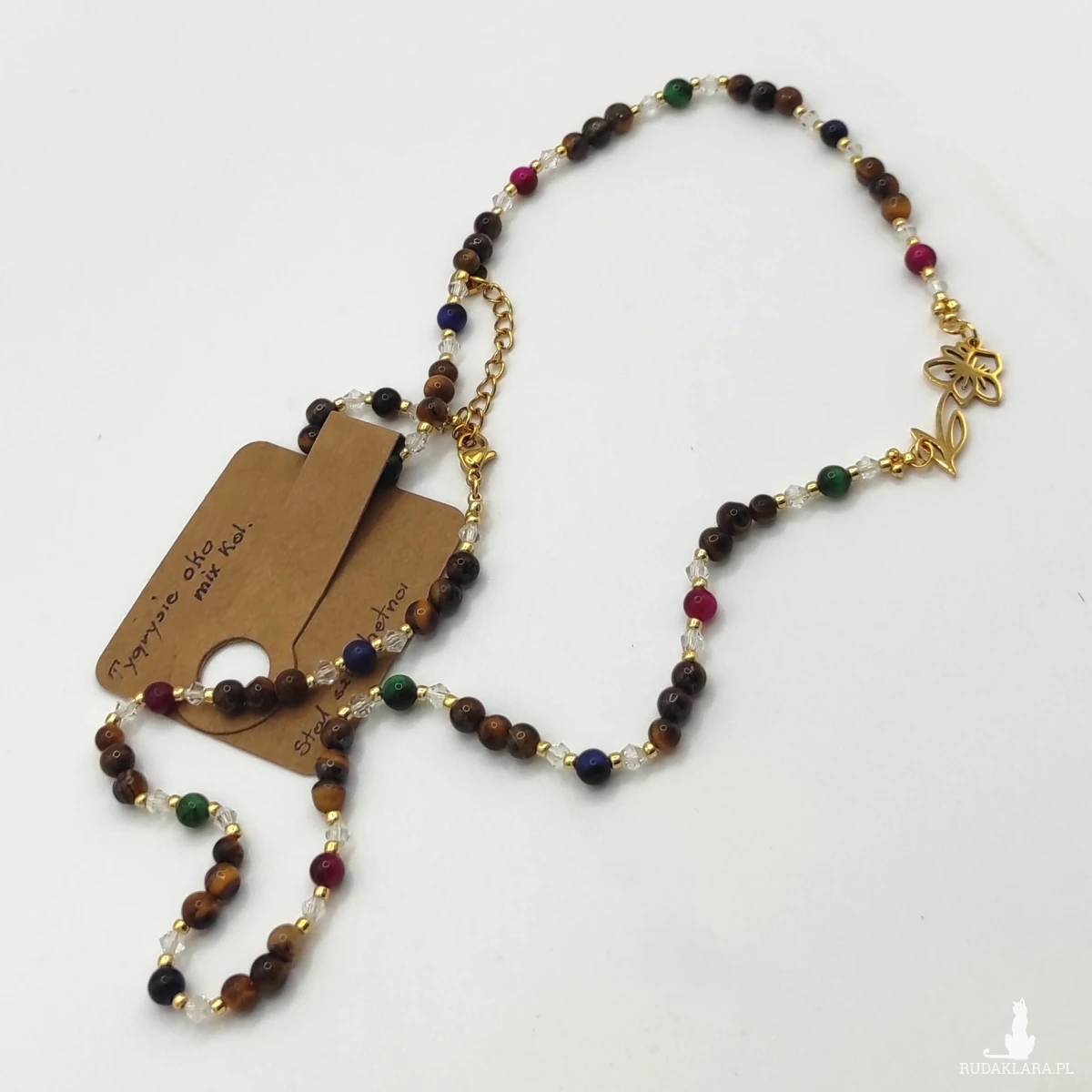 Delikatny naszyjnik zrobiłam z kamieni naturalnych na przemian : tygrysie oko mix kolorów 4mm , szlifowane kryształki i koraliki toho. Łącznik stal chirurgiczna .Wszystkie elementy wykończeniowe ze stali szlachetnej w kolorze złotym . Długość 48 cm