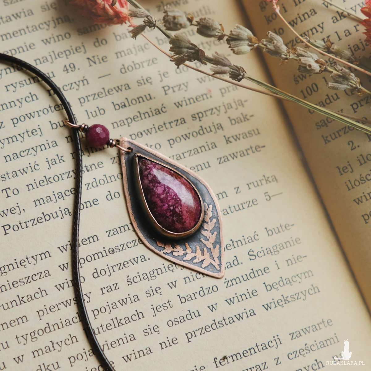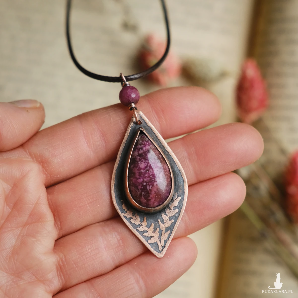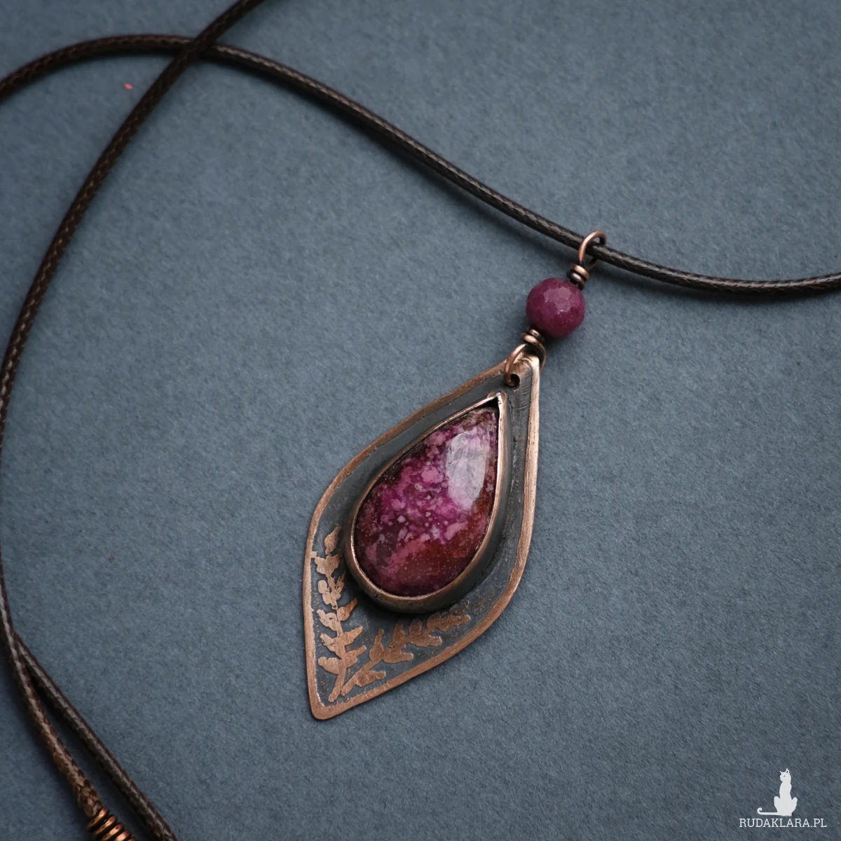 Ręcznie stworzony wisiorek mieści w sobie piękny kamień kalcytu kobaltowego, któremu towarzyszy koralik rubinu. Wisiorek ozdobiony jest delikatnym rysunkiem z roślinnym motywem.