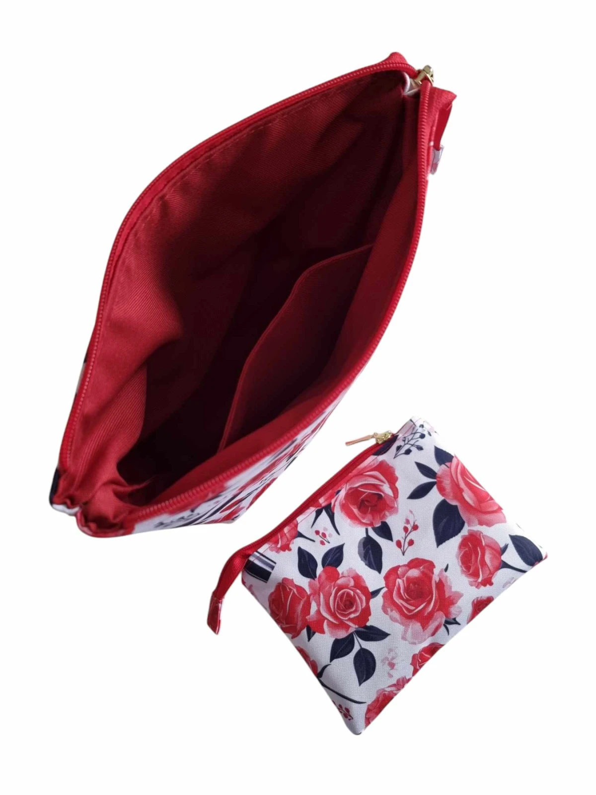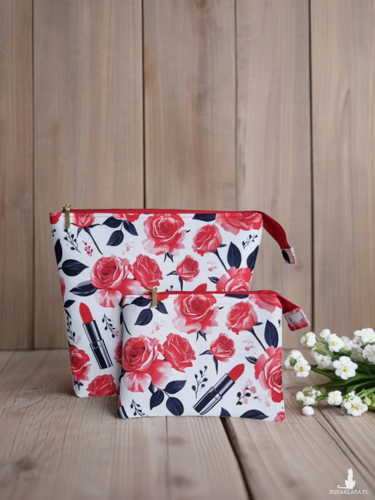 Przedstawiam wyjątkowy zestaw kosmetyczek „Czerwone Róże”, który łączy styl, praktyczność i najwyższą jakość wykonania. Obie kosmetyczki zostały uszyte z wodoodpornej tkaniny, dzięki czemu Twoje ulubione kosmetyki i drobiazgi pozostaną bezpieczne w każdych warunkach.