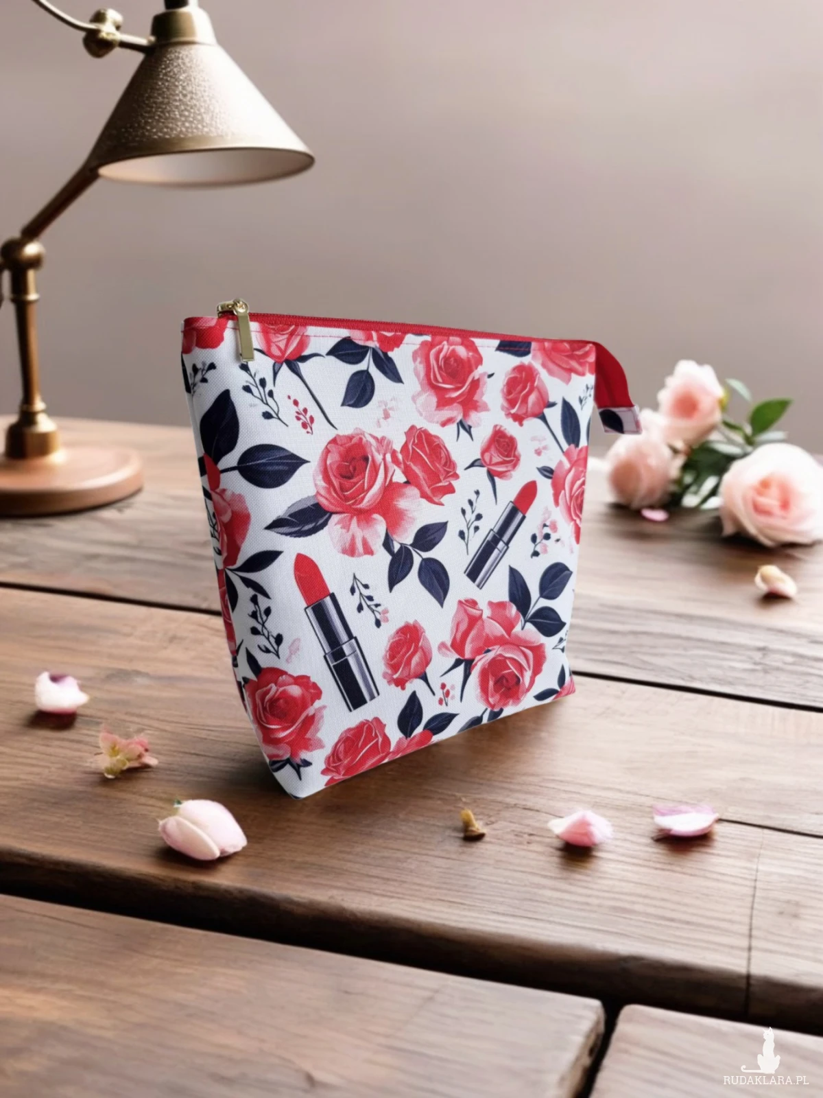 Duża kosmetyczka - idealna na wyższe kosmetyki, wygodnie otwierana na czerwony zamek ze złotym suwakiem, który dodaje całości elegancji. W środku znajduje się praktyczna otwarta kieszonka, ułatwiająca organizację.