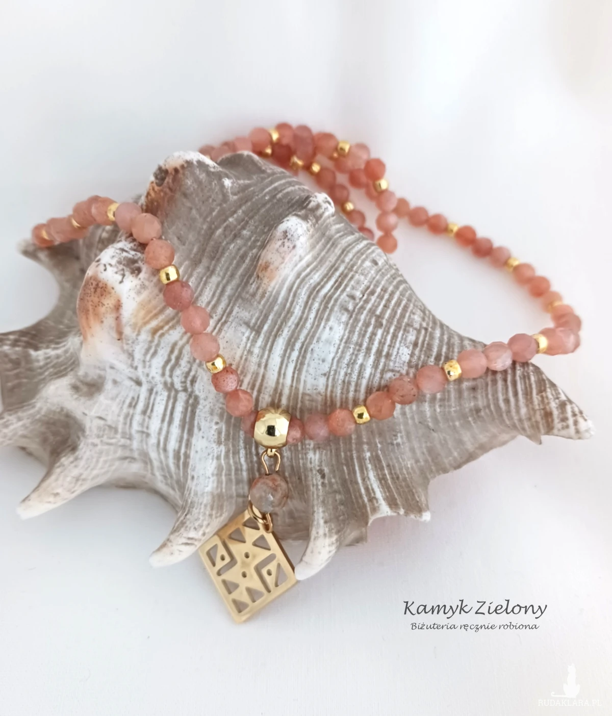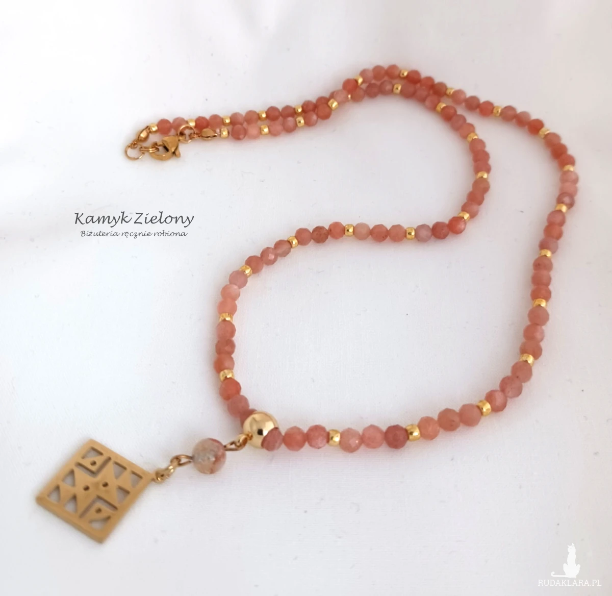 Został zrobiony ręcznie z kuleczek fasetowanych kamienia słonecznego o średnicy 4 mm, między którymi umieszczono złote koraliki Toho. Przód naszyjnika zdobi większa kuleczka cytrynu oraz przywieszka z motywem azteckiego rombu wykonana ze stali chirurgicznej w złotym kolorze. Naszyjnik ma zapięcie typu karabińczyk, bez regulacji długości.