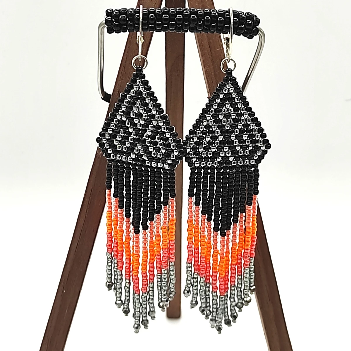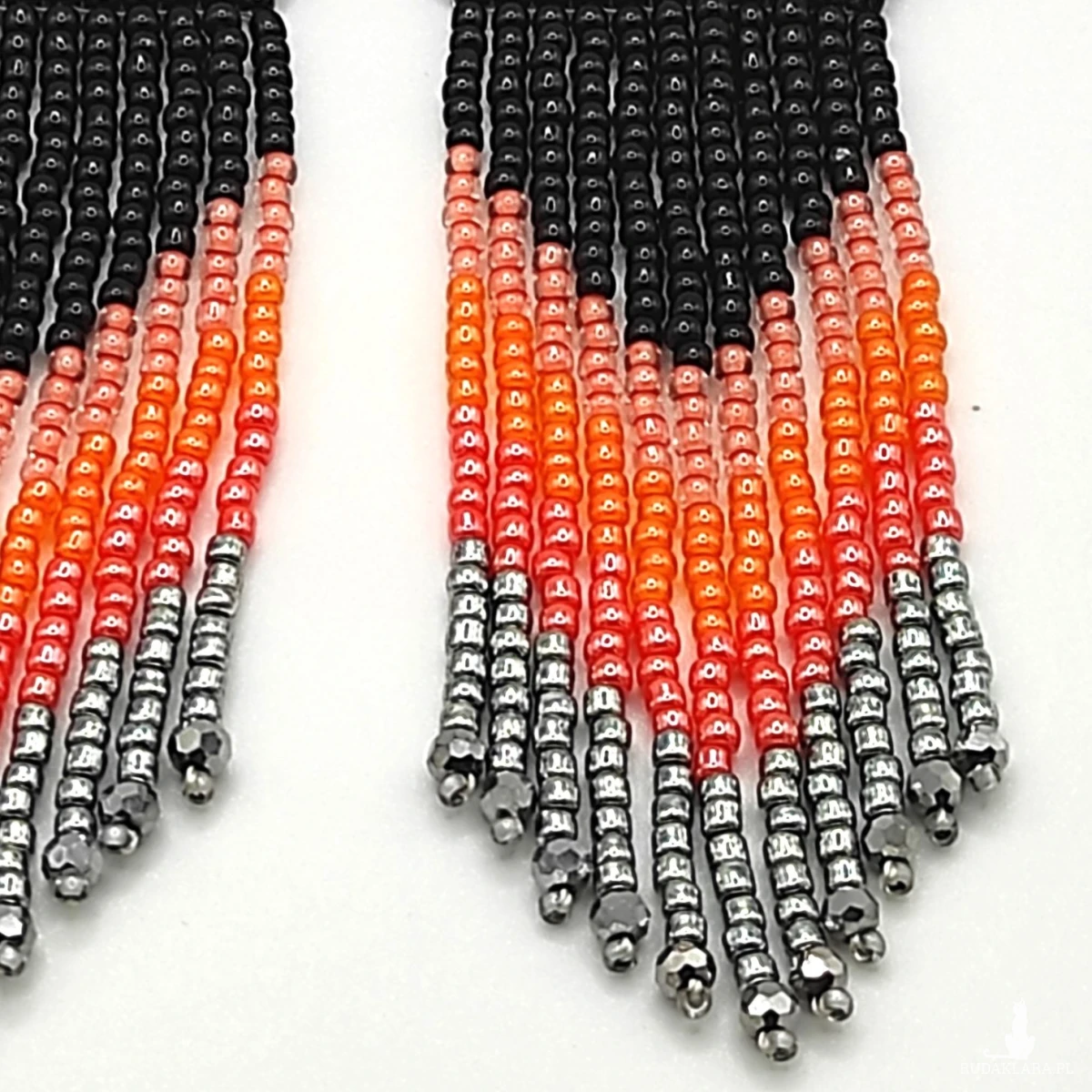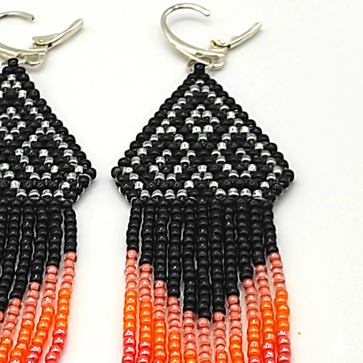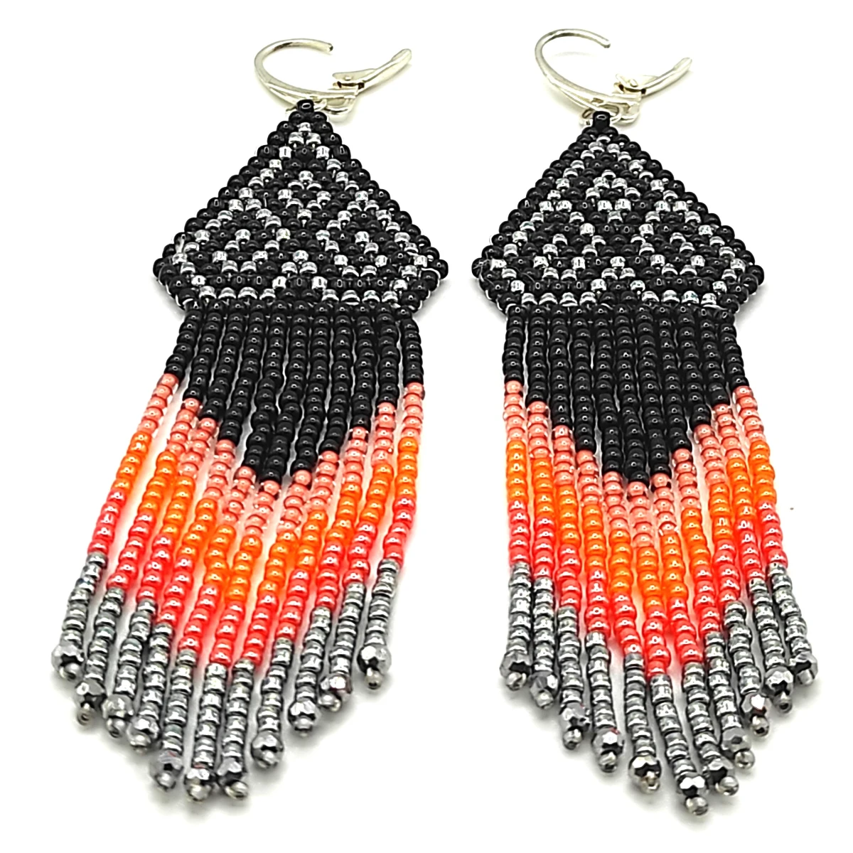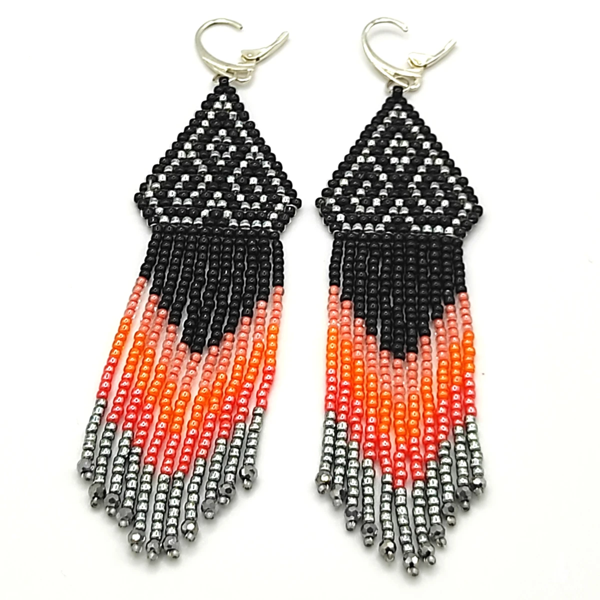 Kolczyki wykonane ręcznie z koralików toho 2mm kolory : czarny, stebrny, trzy odcienie pomarańczowego. Całkowita długość razem z biglem 11 cm +/- , szerokość w najszerszym miejscu 3 cm Bigle srebro 925