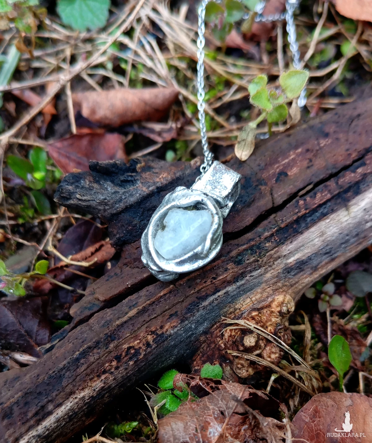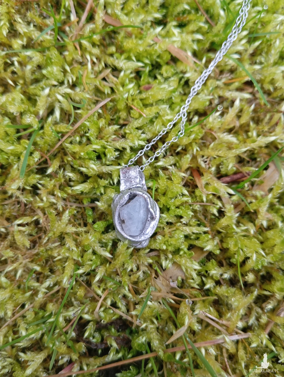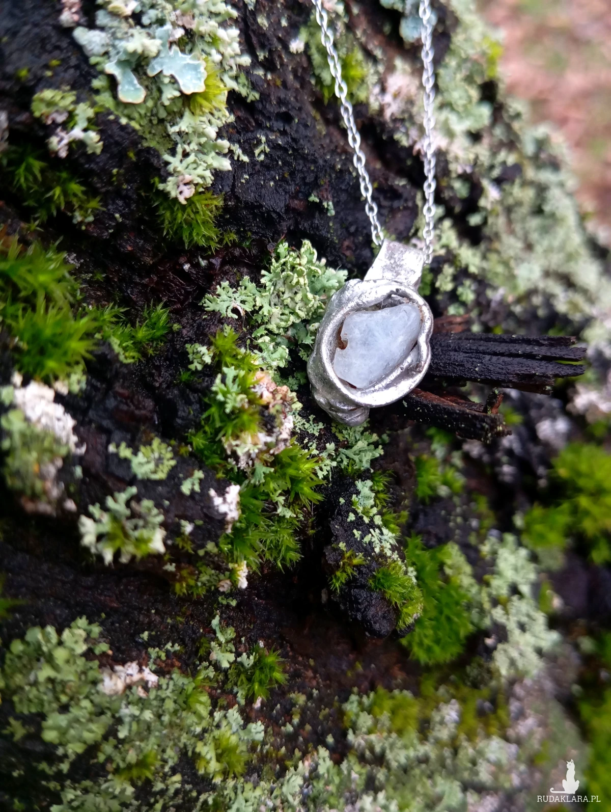 Akwamaryn subtelnie łączy ze sobą toń wody i odbity w niej kolor spokojnego nieba. Niebo z ciekawością zerka w stronę nieuchwytnej wody, a ta, żartując sobie z niego, pokazuje mu lustro. Niebo nie poznało siebie, ale odczuło wielką sympatię do tajemniczej wody, która ma taki sam kolor, jak ono. Przysunęło się bliżej, miękko ułożyło na poduszkach z szarych chmur. Błękit wody nieco pobladł, niebo pomyślało, że jest ona nieśmiała i podeszło jeszcze bliżej. Zbliżało się tak mocno, że wpadło do wody. Woda roześmiała się. Niebo było bardzo zaskoczone, kolory wymieszały się, zrozumiało swoje lustro. Nasze lustra nas przyciągają. Poruszone swoim odkryciem niebo, postanowiło spędzić z wodą tyle czasu, ile to tylko możliwe. Z tego połączenia nieba i wody, narodził się akwamaryn. Zintegrował w sobie dary swoich rodziców i wyruszył w świat, żeby dzielić się nimi z innymi. Uczy ludzi komunikacji, wyrażania emocji, osiągania wewnętrznego spokoju i odczuwania radości. Wspomaga również asertywność, pewność siebie i zachęca do spontaniczności. Długość zawieszki 2 cm.