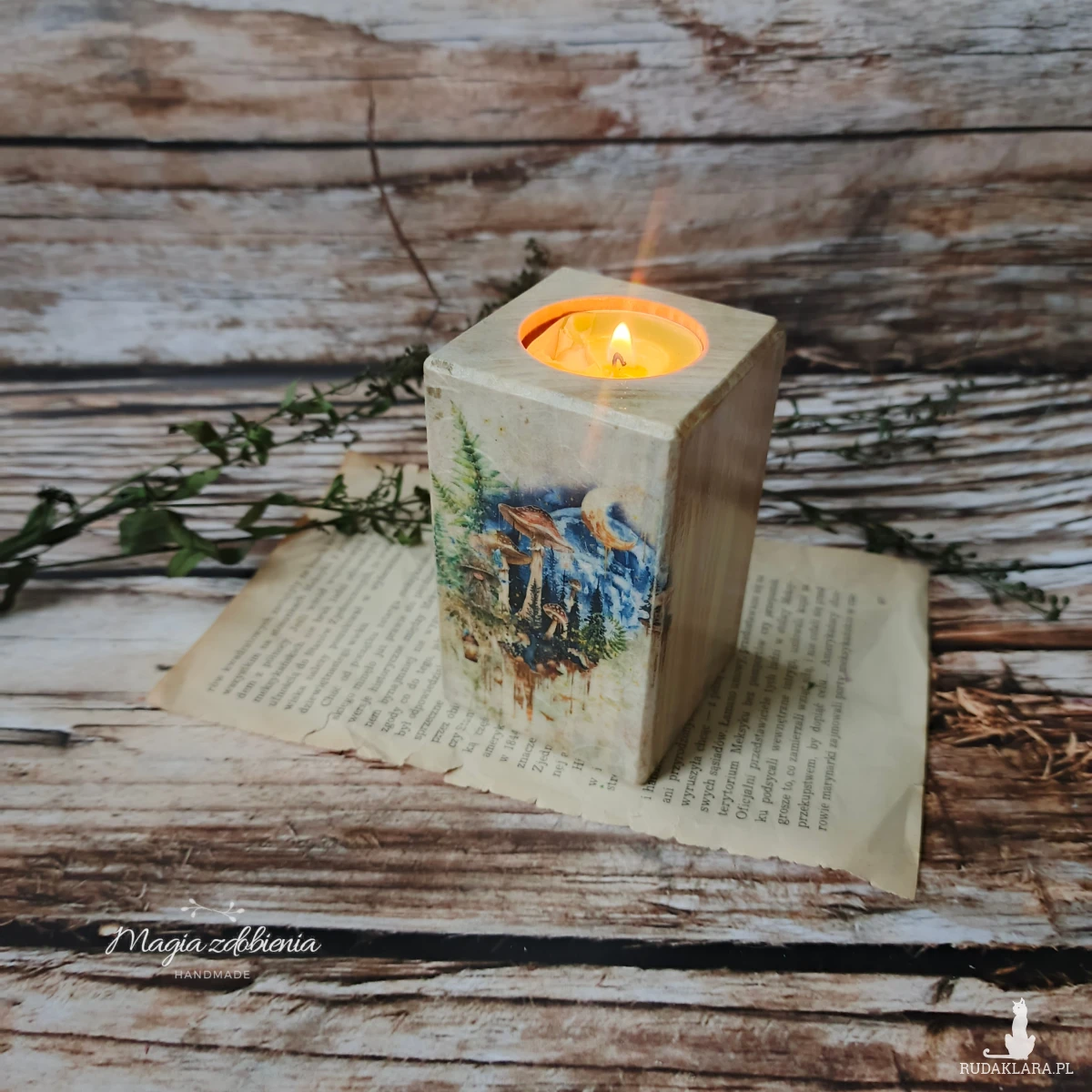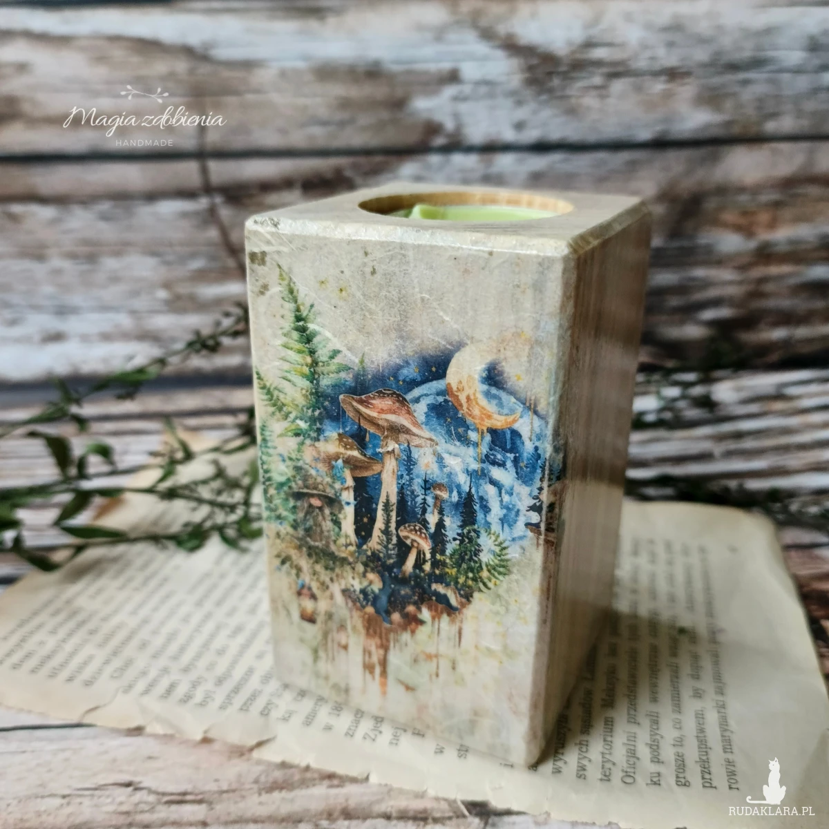 Drewniany świecznik zdobiony ręcznie techniką decoupage. Pomalowany bejcami, delikatnie bielony. Bajkowa grafika - papier ryżowy. Kilkakrotnie lakierowany ( mat ).