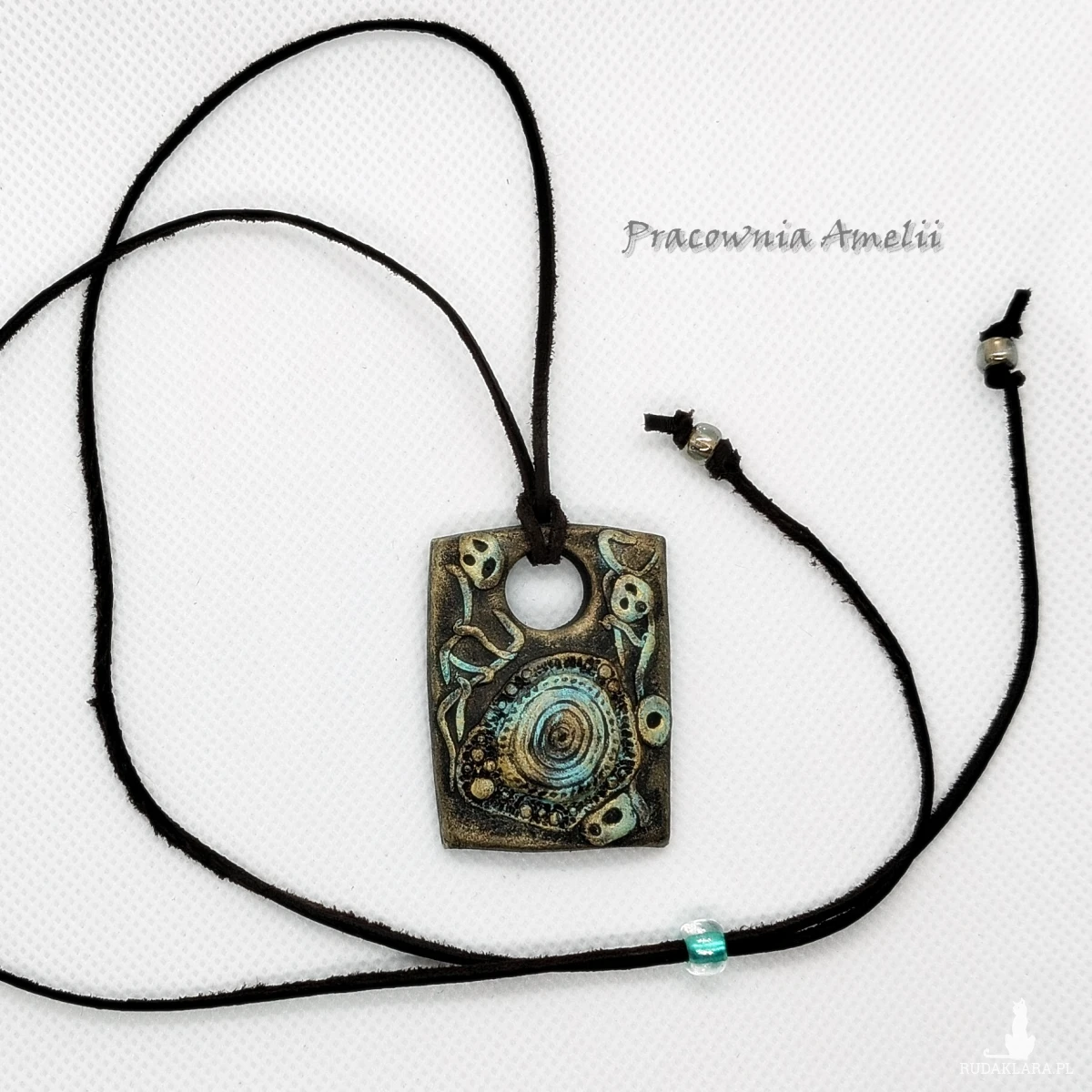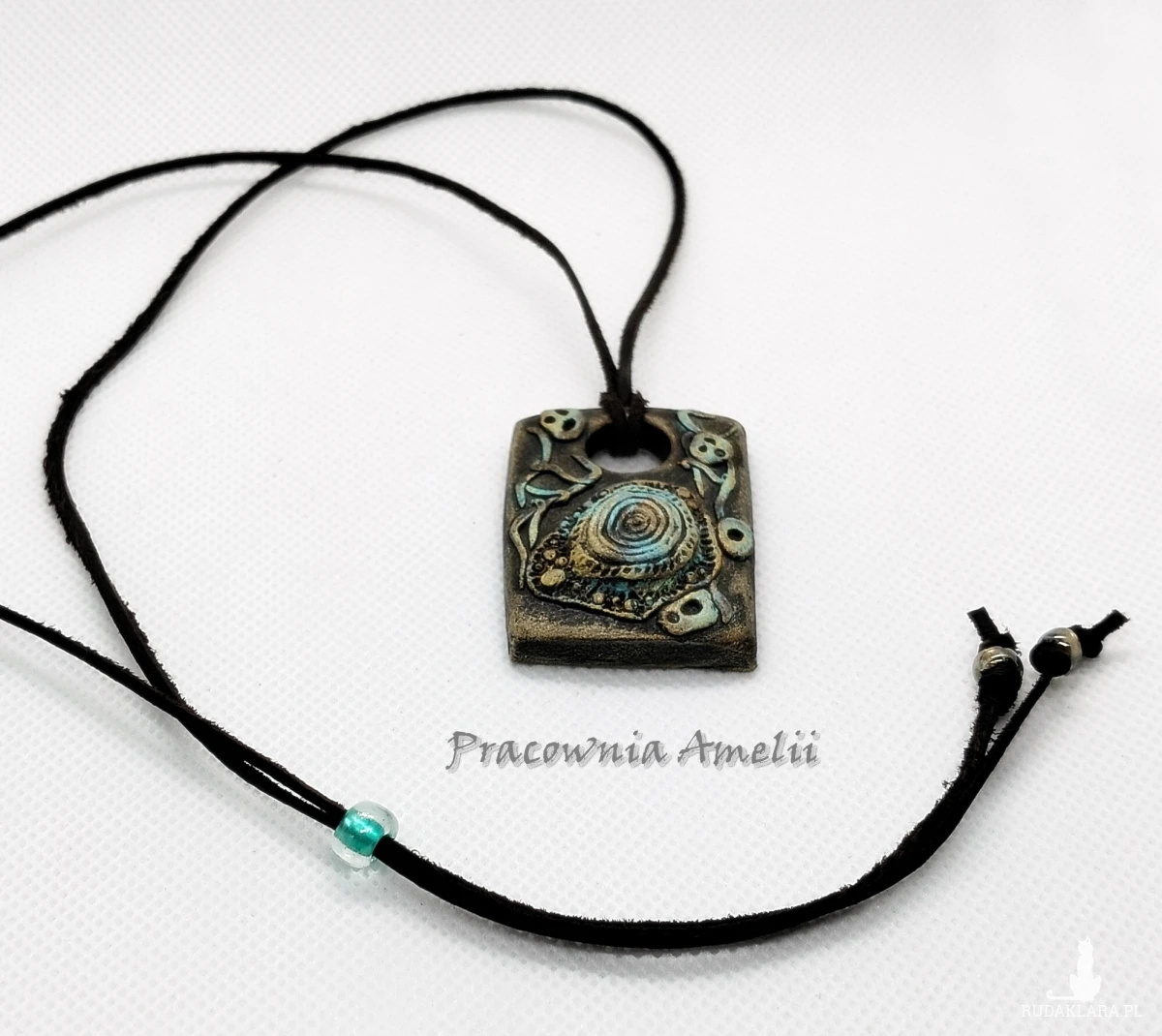 Wymiary: szerokość: do 3,1 cm, wysokość: ok. 4,2 cm + ozdobny koralik z gliny polimerowej. Rzemyk o długości ok. 80 cm