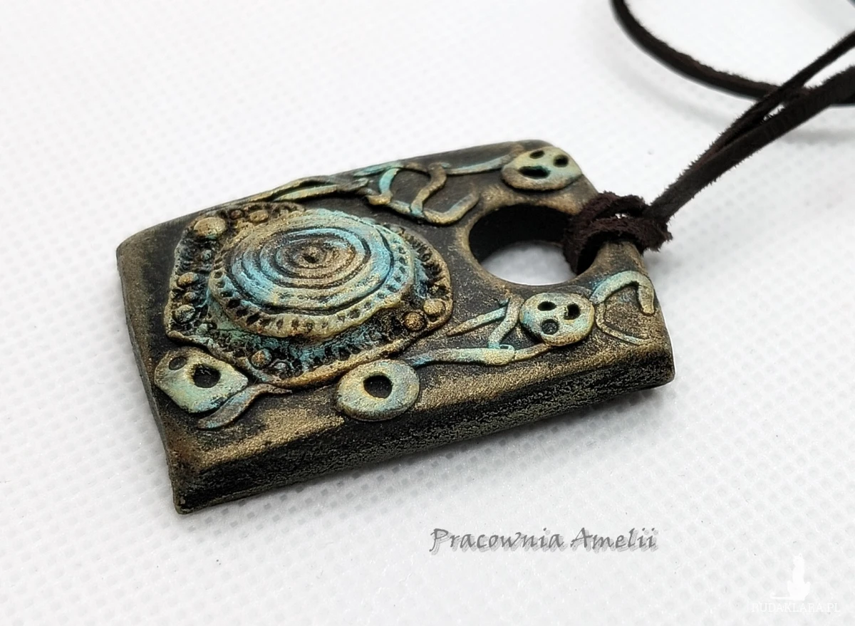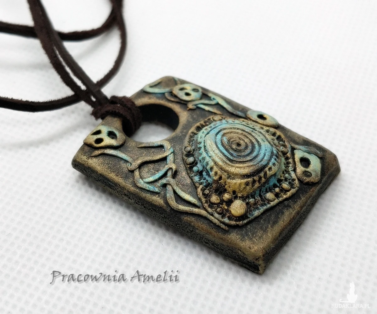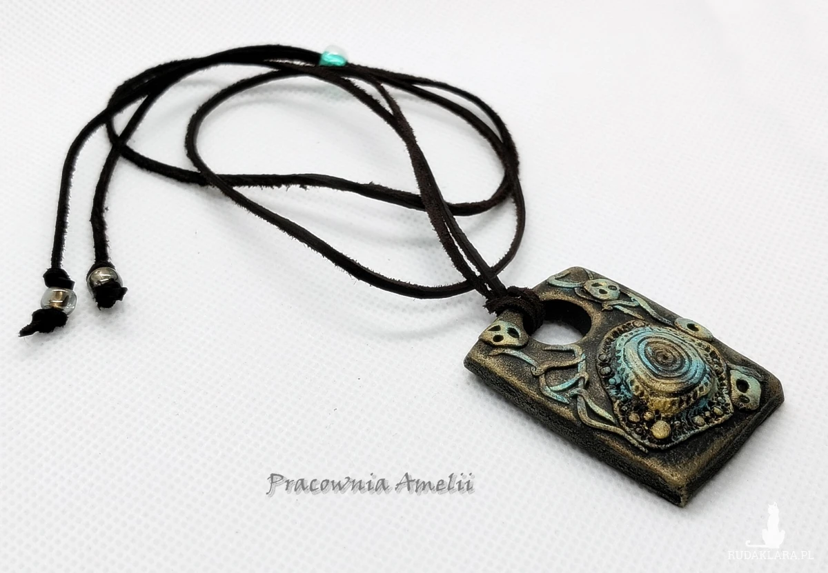Wisior wykonany z gliny polimerowej. Zawieszony na brązowym rzemyku skórzanym, zakładany przez głowę, z regulacją długości. Projekt własny, wykonany tylko w jednym egzemplarzu. Biżuteria z gliny polimerowej jest trwała i uniwersalna. Idealna na oryginalny prezent w atrakcyjnej cenie ;)