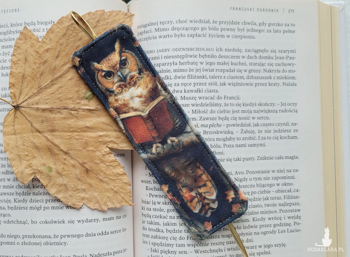 Zakładka do książki z jesiennym motywem zaczytanej sowy. Wykonana z mięciutkiej tkaniny welurowej oraz grubej bawełny ozdobiona dopasowaną kolorystycznie wstążką. Spełni oczekiwania wszystkich wielbicieli fantastycznych książek.