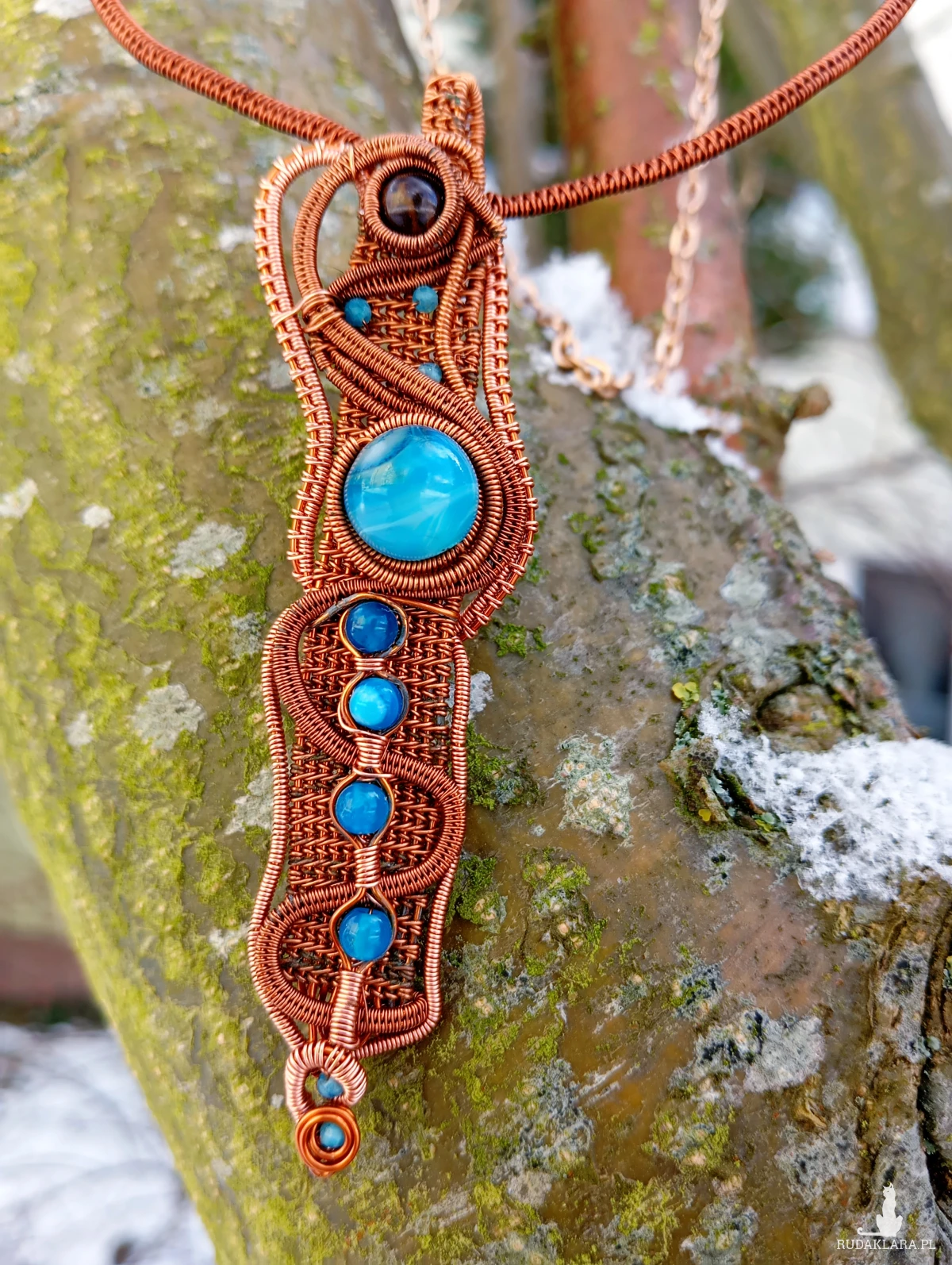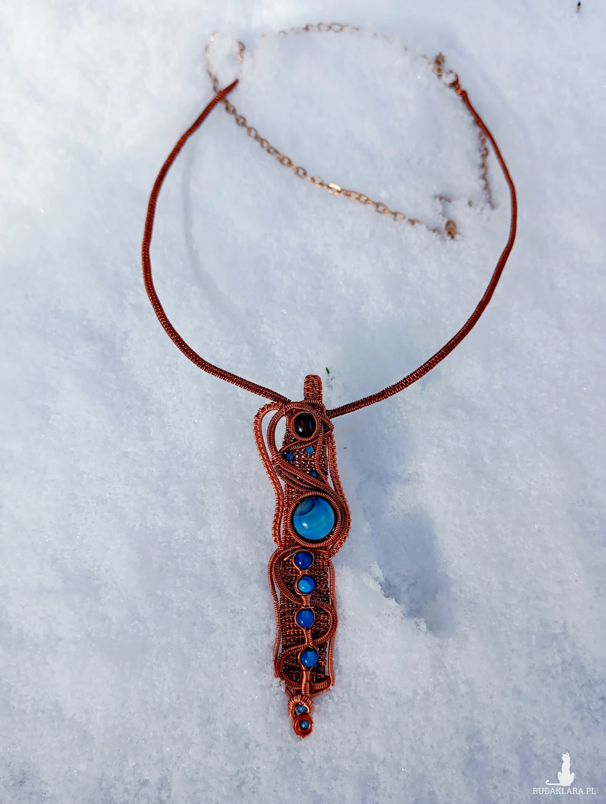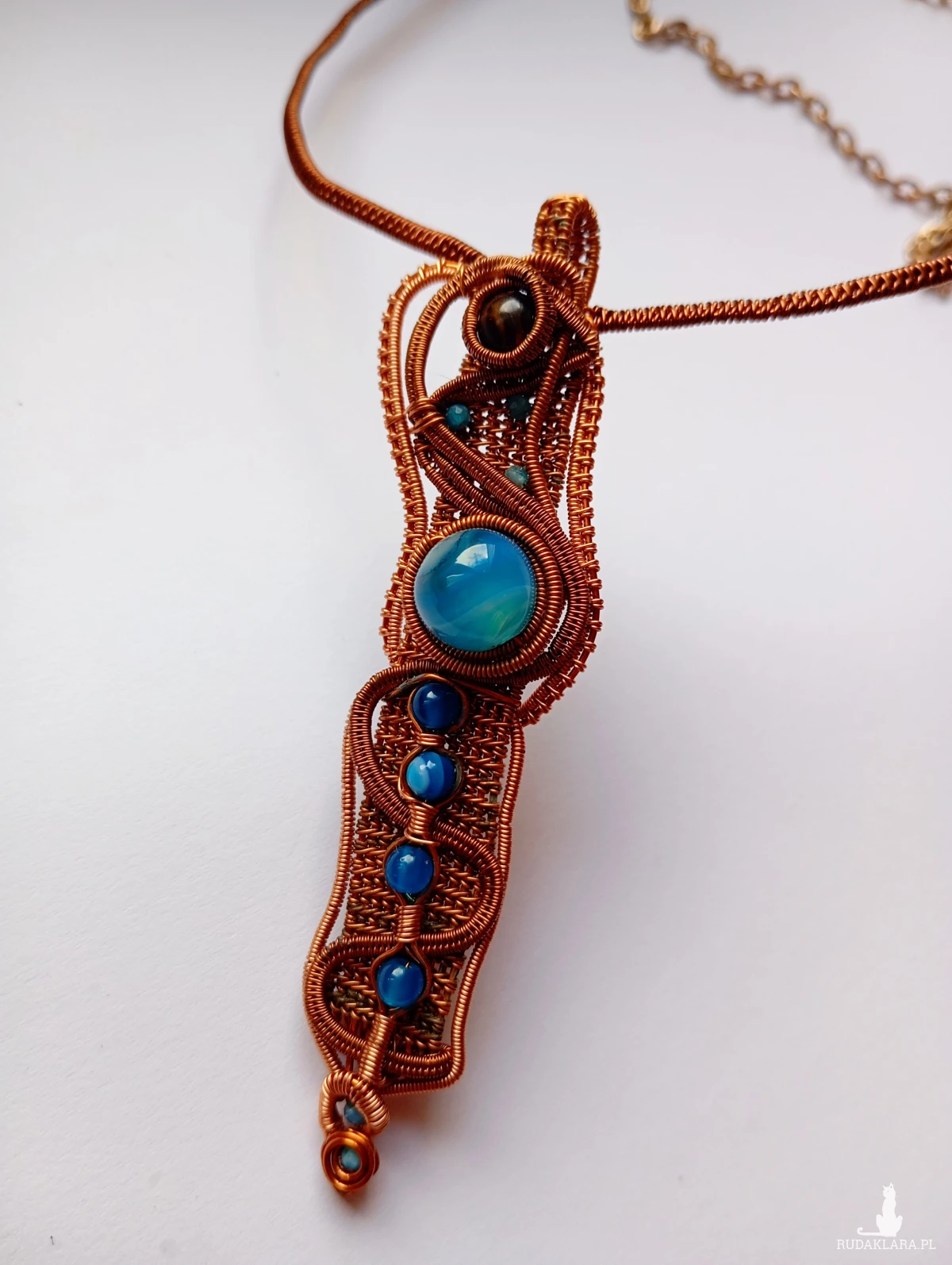 Kolia z łańcuszkiem, będąca, miedziano złotą ziemią, nowym domem dla mieszkających na niej kamieniach. W jej sercu ułożył się duży, niebieski agat. Zwinięty w kulkę, owinięty miedzianym boa. Jest studnią możliwości. W jego błękitnych oczach dostrzeżesz ocean równowagi i spokoju. Poczujesz na ciele krople agatowej harmonii, które spływają w dół i wsiąkają w Twoją skórę, napełniając Cię radością, wsparciem i powodzeniem. Kilka mniejszych apatytowych kropli, wesoło rozprysło się dalej. One niczego się nie boją, pomagają spełniać marzenia. Nad wodną zabawą czuwa tygrysie oko. Przynosi szczęście, dodaje odwagi, pewności siebie i sprawczości. Czas wypłynąć w rejs po życiu!