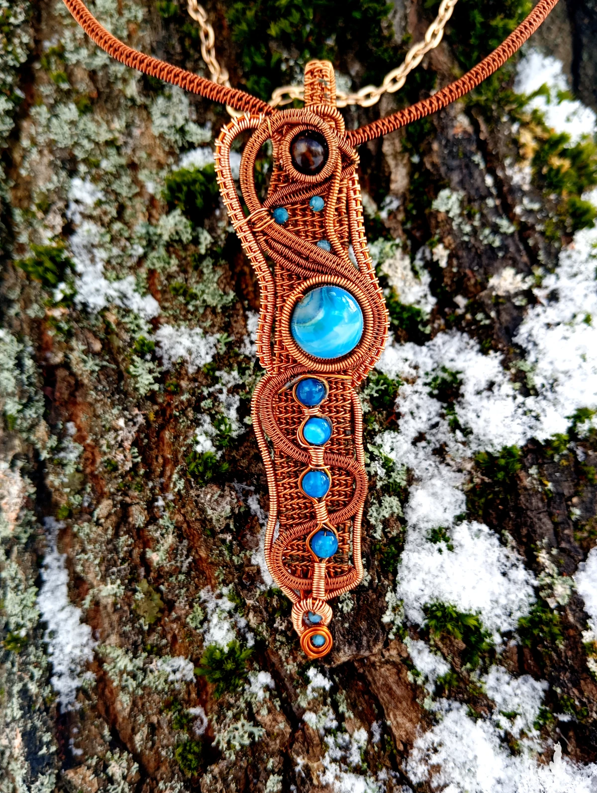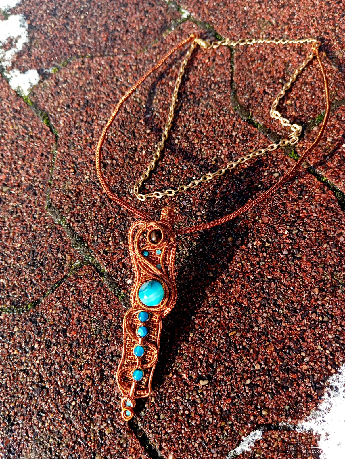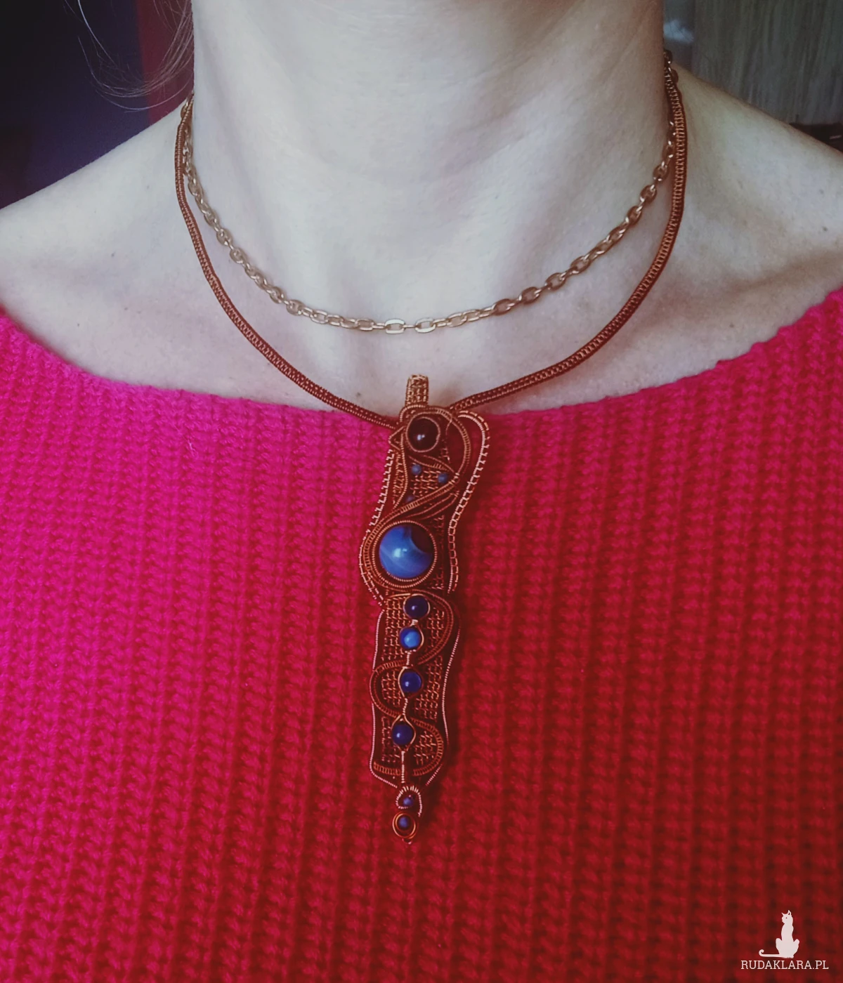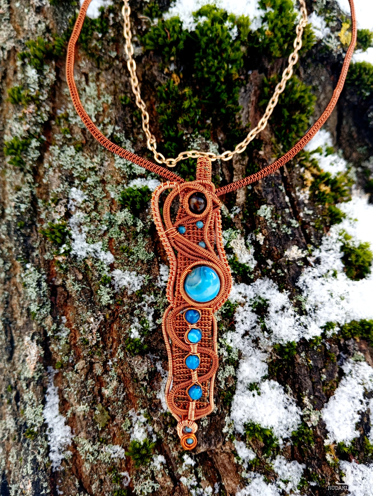 Kolia z łańcuszkiem, będąca, miedziano złotą ziemią, nowym domem dla mieszkających na niej kamieniach. W jej sercu ułożył się duży, niebieski agat. Zwinięty w kulkę, owinięty miedzianym boa. Jest studnią możliwości. W jego błękitnych oczach dostrzeżesz ocean równowagi i spokoju. Poczujesz na ciele krople agatowej harmonii, które spływają w dół i wsiąkają w Twoją skórę, napełniając Cię radością, wsparciem i powodzeniem. Kilka mniejszych apatytowych kropli, wesoło rozprysło się dalej. One niczego się nie boją, pomagają spełniać marzenia. Nad wodną zabawą czuwa tygrysie oko. Przynosi szczęście, dodaje odwagi, pewności siebie i sprawczości. Czas wypłynąć w rejs po życiu!