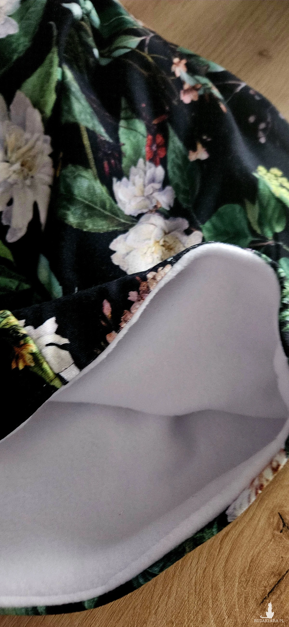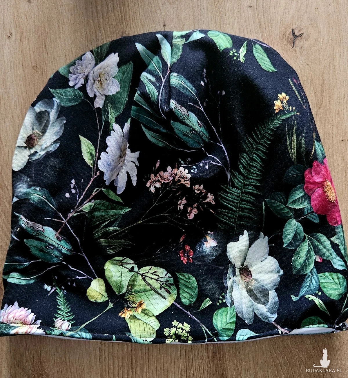 Czapka model: wzór w kwiaty i liście na czarnym tle ocieplana