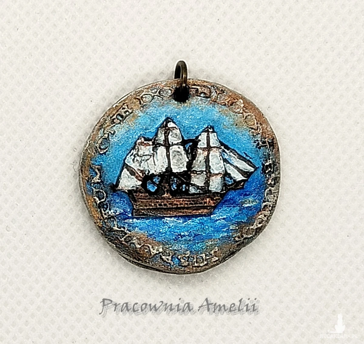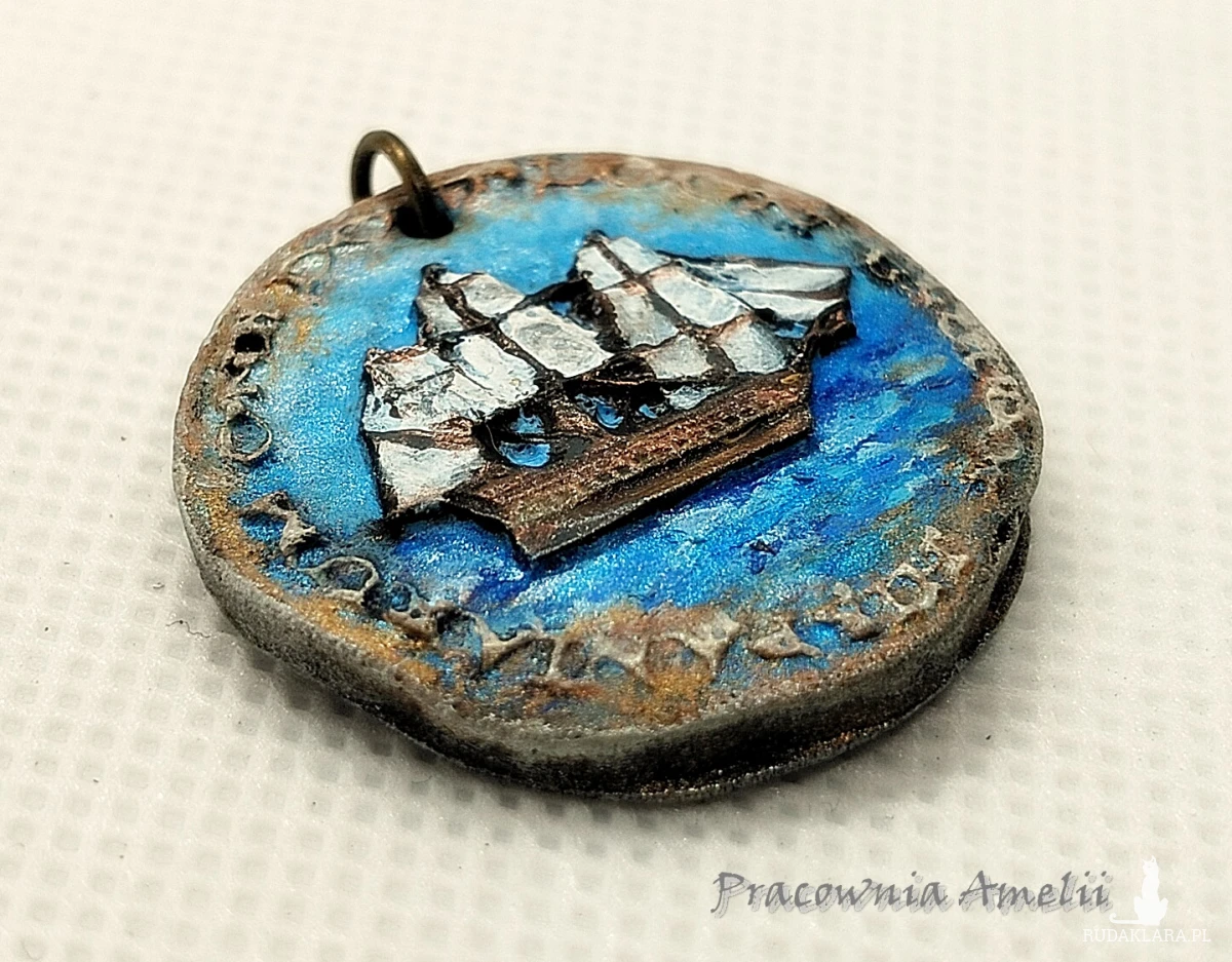 Nieduży wisior wykonany z gliny polimerowej, kolorowy. Można zawiesić na rzemyku lub łańcuszku. Średnica ok.: 3 cm.