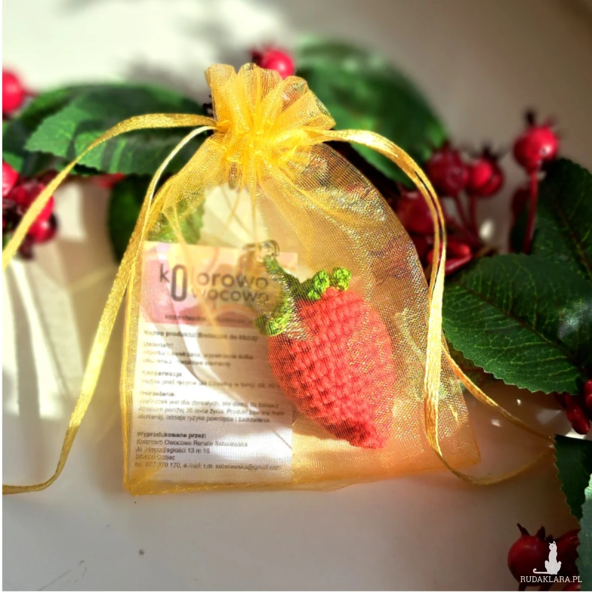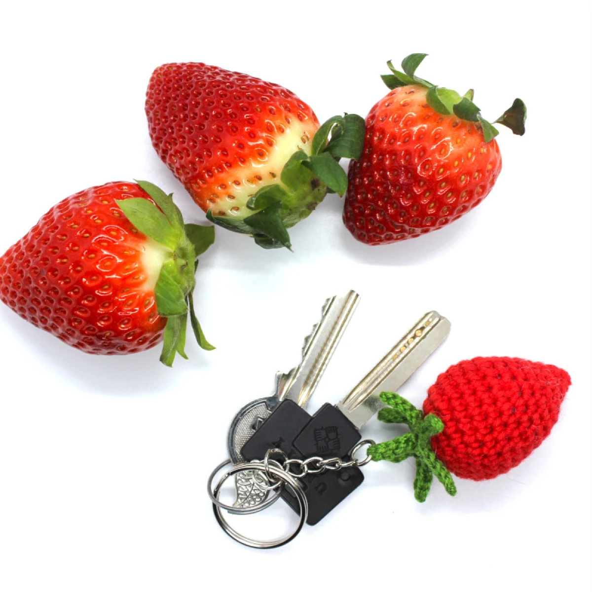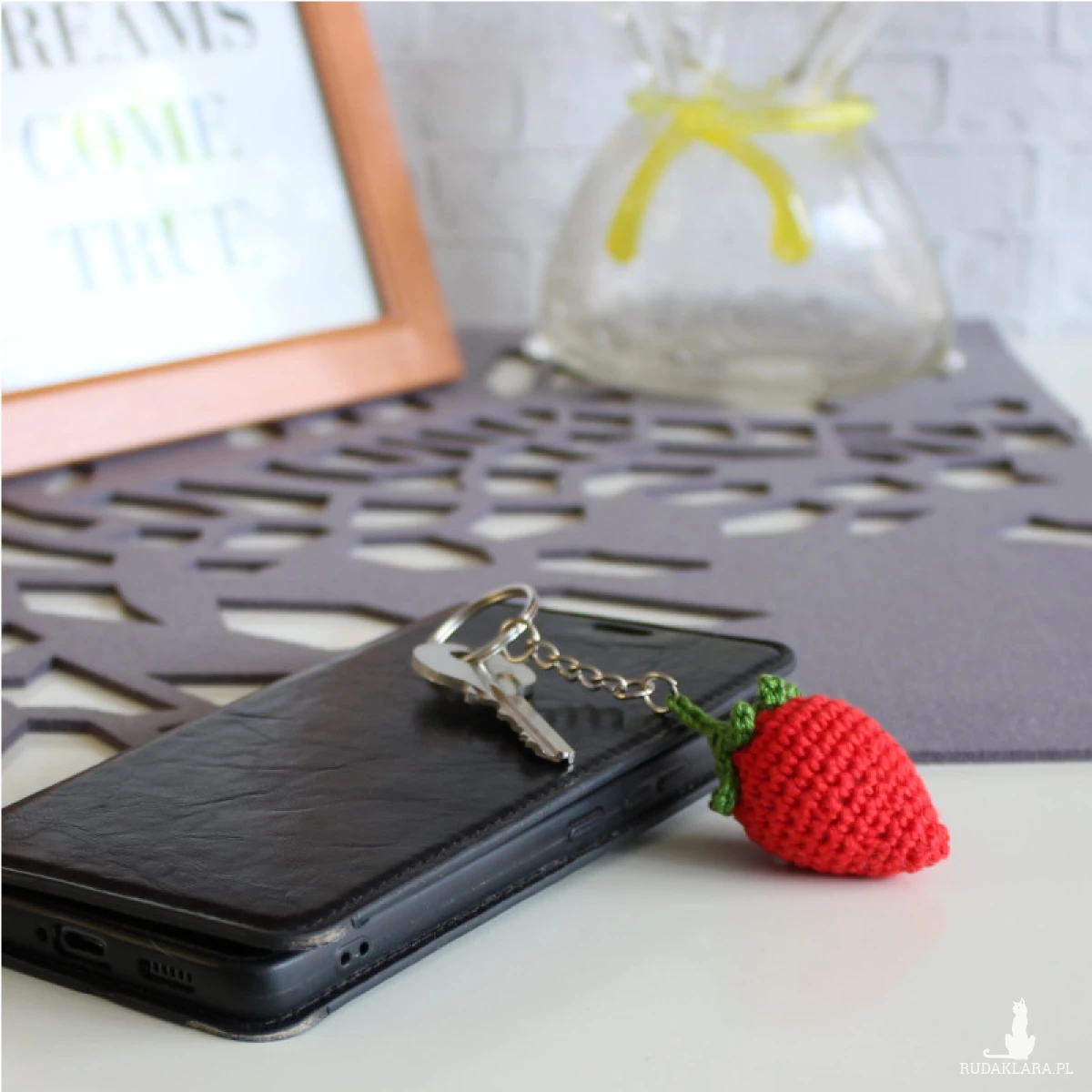 Brelok na szydełku Truskawka – uroczy dodatek do kluczy, torebki lub plecaka w stylu amigurumi.