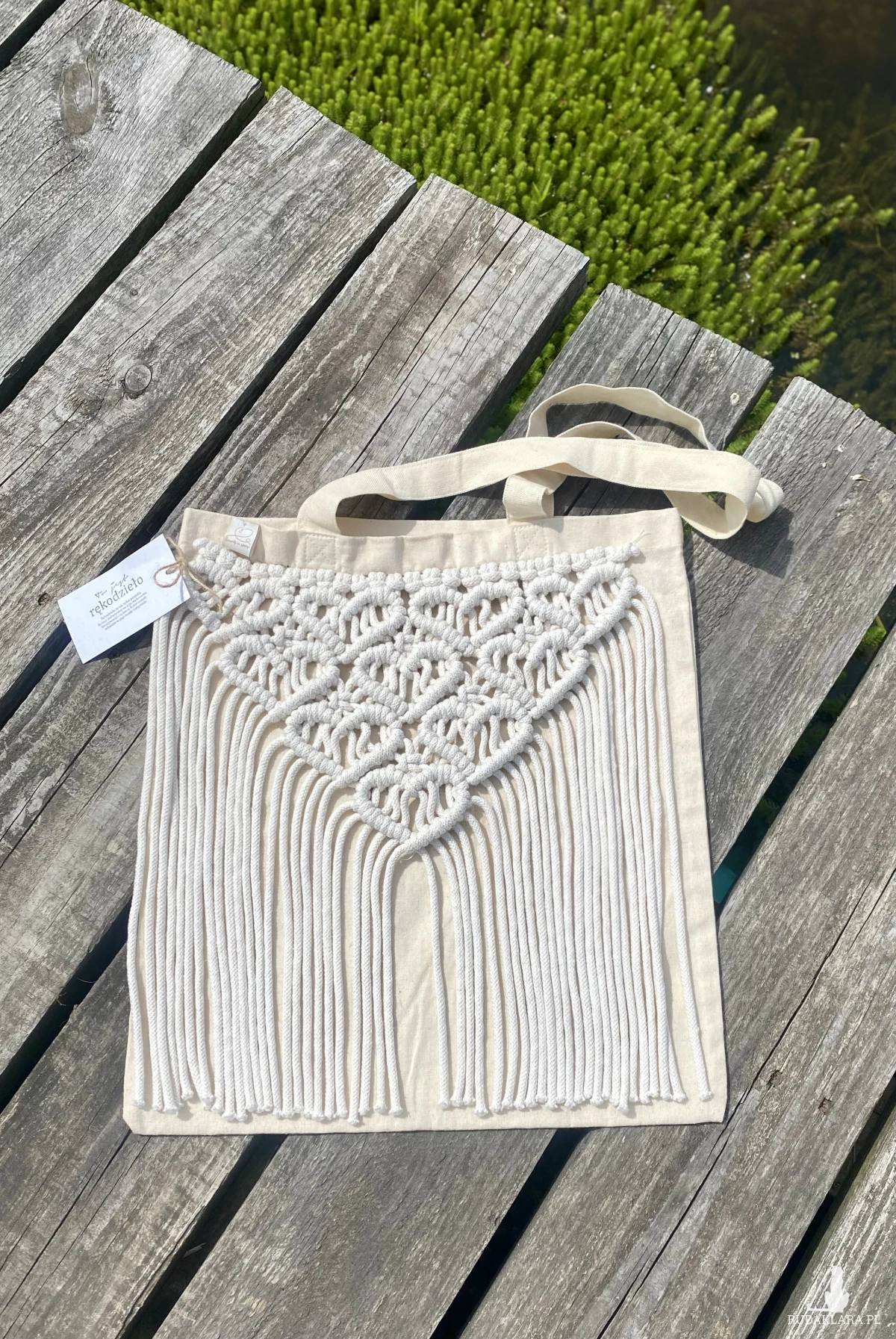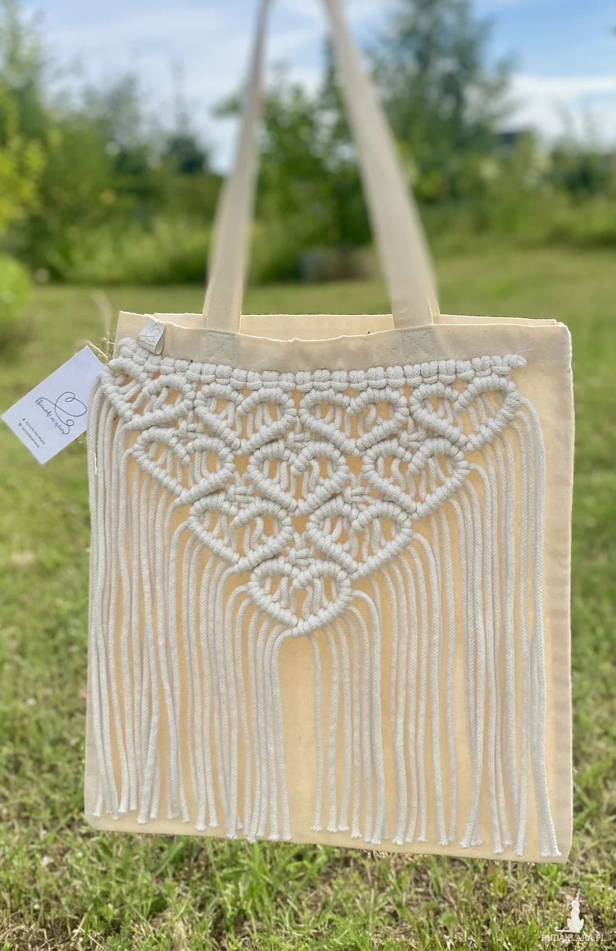 Opleciona wzorem serc wykonanych ręcznie technika makramy, ze sznurka bawełnianego w kolorze naturalnym oraz długie uszy pozwalające zarzucić torbę na ramię sprawi że każde zakupy będą sama przyjemnością!