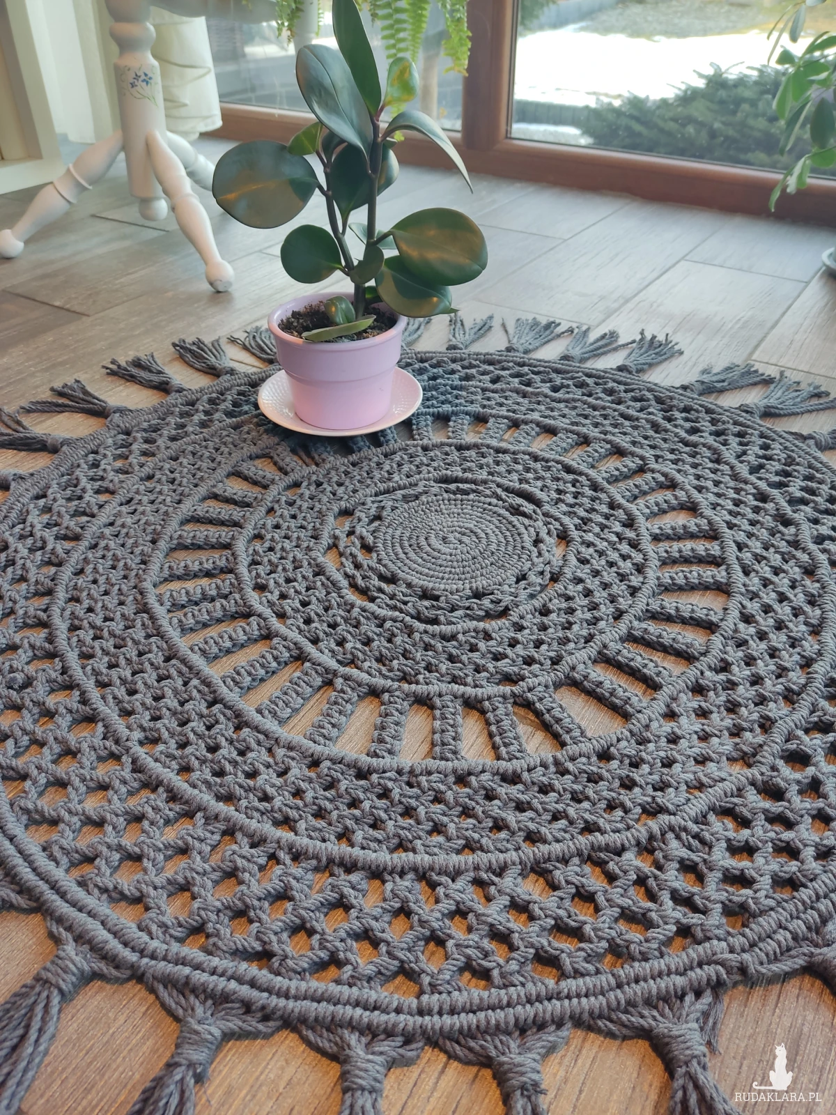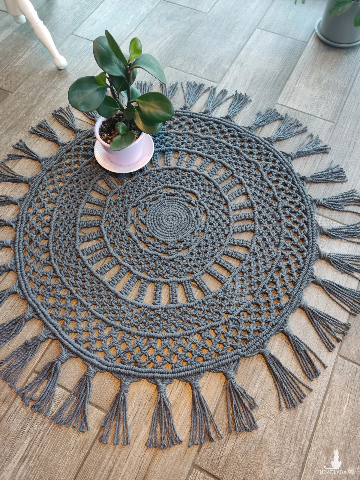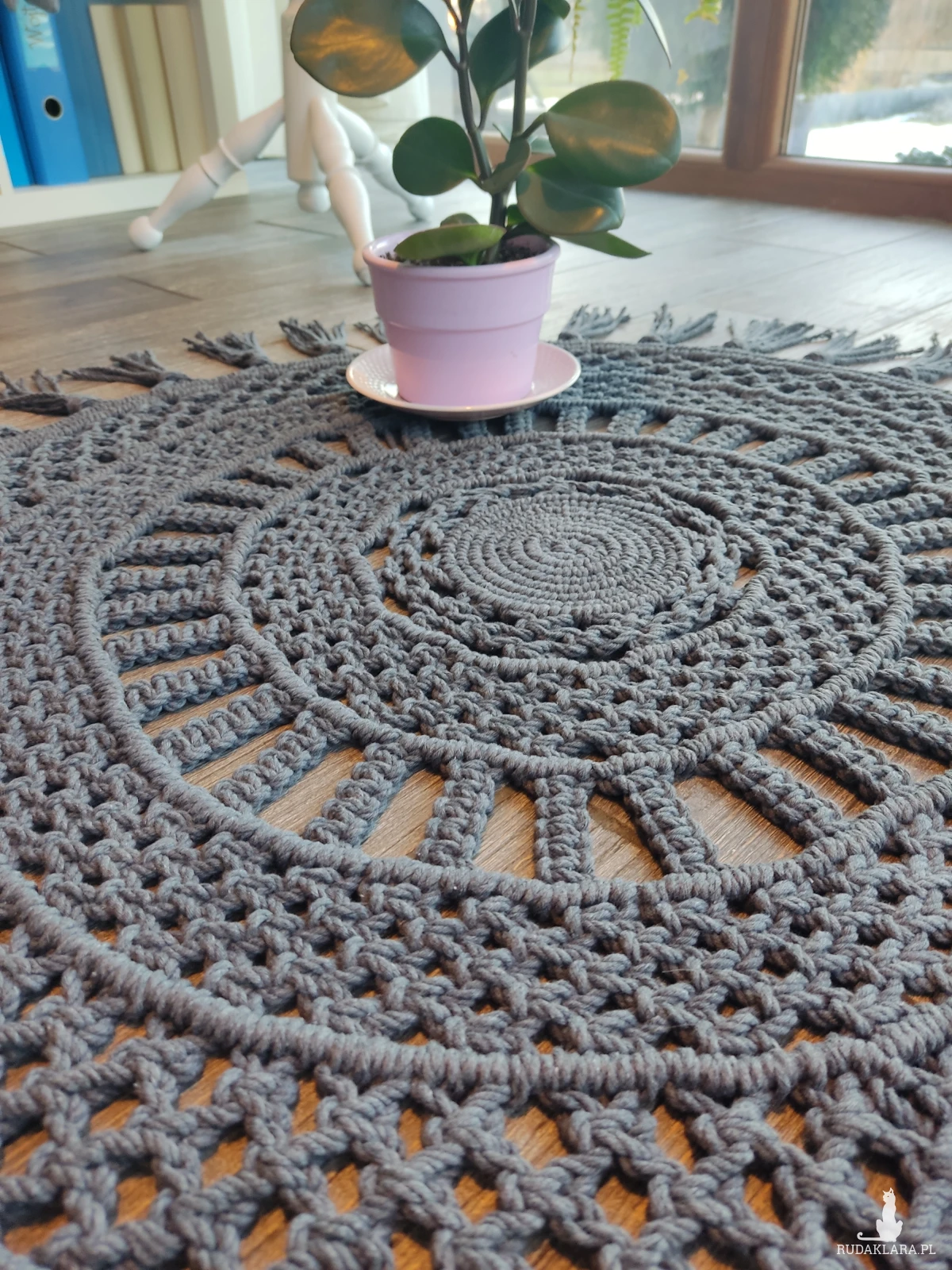 Dywanik został ręcznie wypleciony metodą makramy.