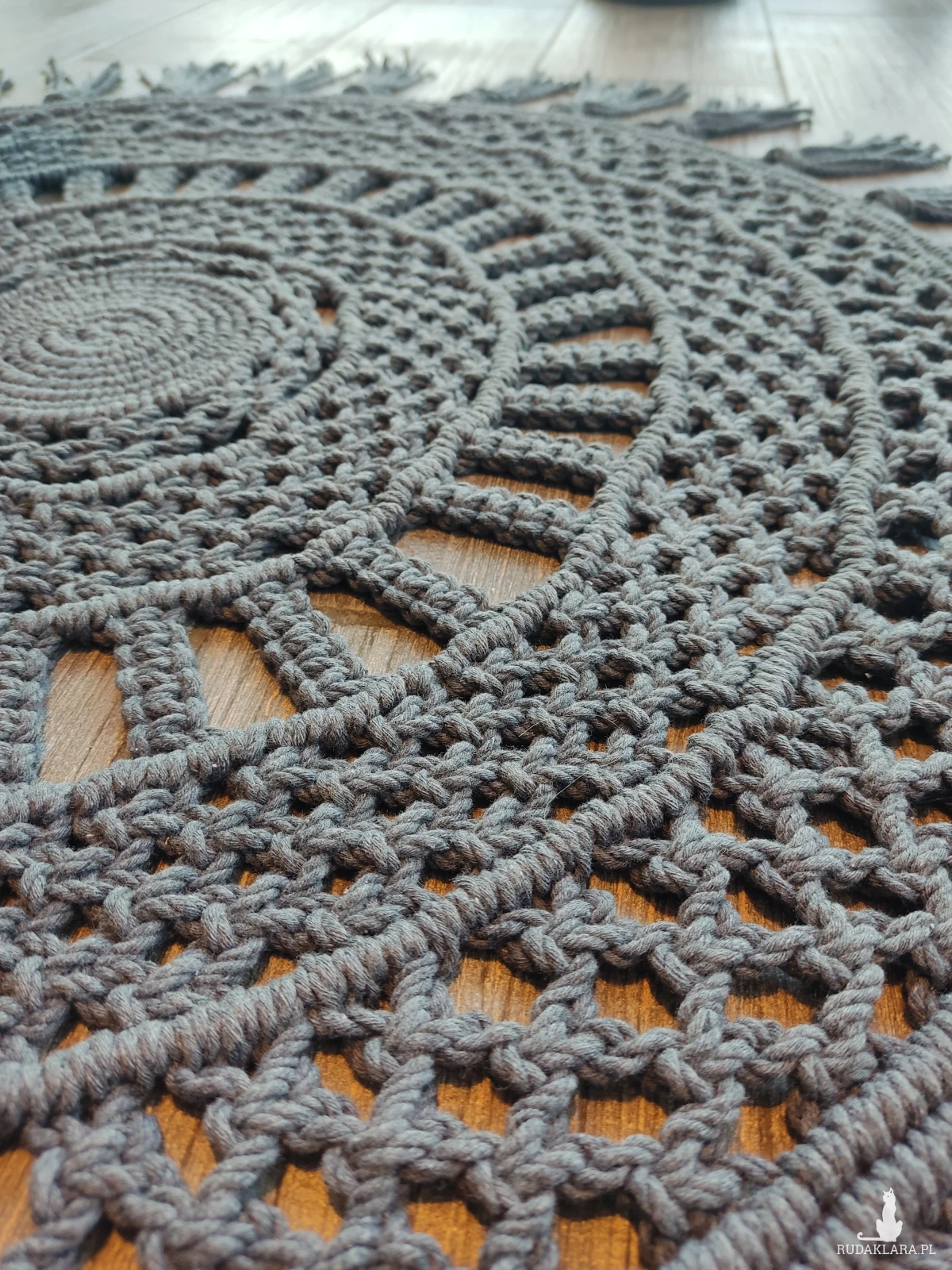 Sprzedam ręcznie wykonany ze sznurka 3 PLY w kolorze szarym okrągły dywanik o średnicy całkowitej 85 cm.