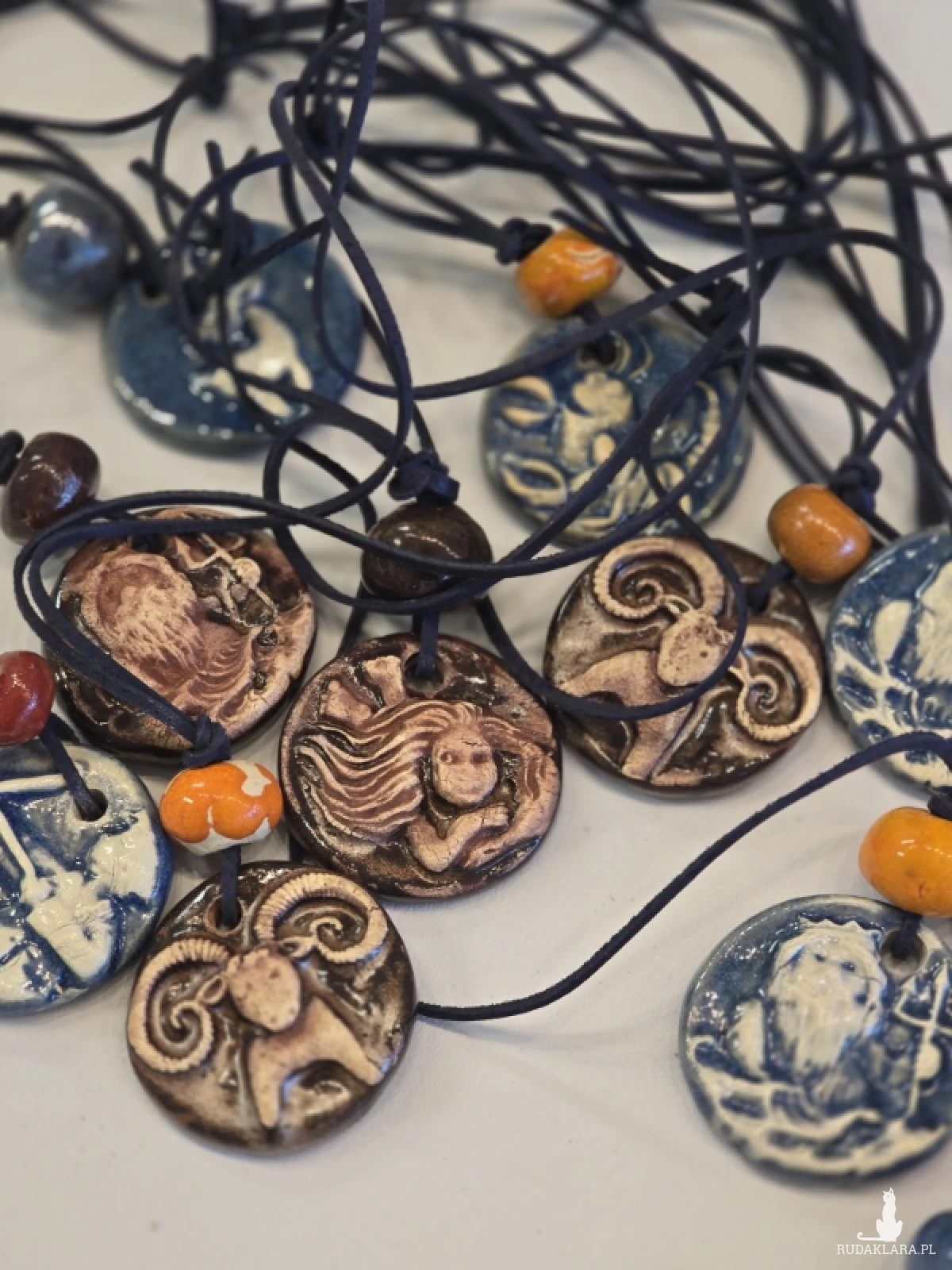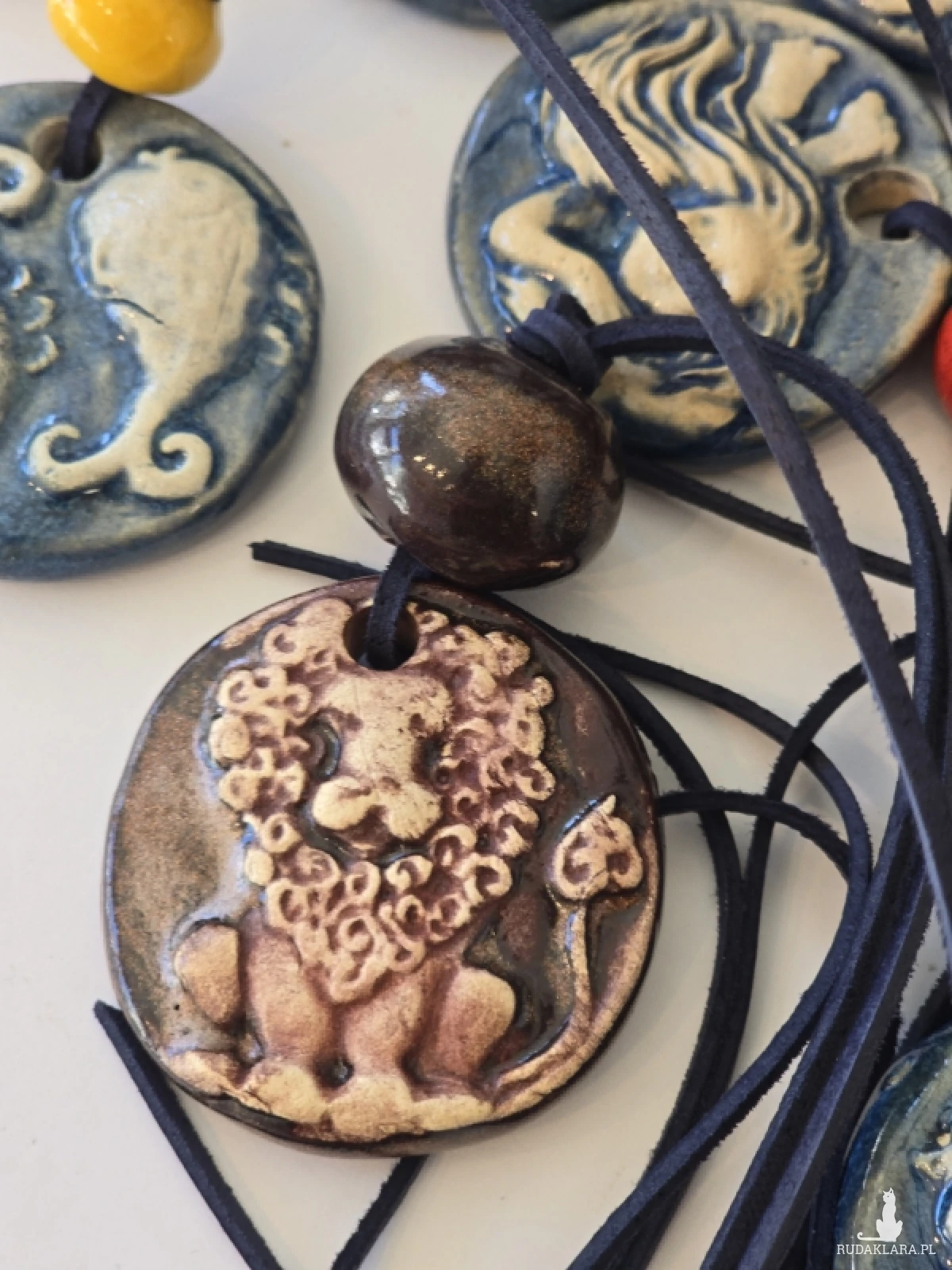 Naszyjnik, znak zodiaku LEW wykonany z gliny szkliwiony, wypalony dwukrotnie w temperaturze 950 oraz 1050 ze szkliwem, zawieszony na rzemyku ozdobiony ceramicznym koralem Doskonały na prezent, upominek. Wykonuję cały zestaw znaków zodiaku w różnych kolorach. Zdjęcie z wieloma naszyjnikami jest zdjęciem poglądowym. Sprzedaż dotyczy znaku z LWEM