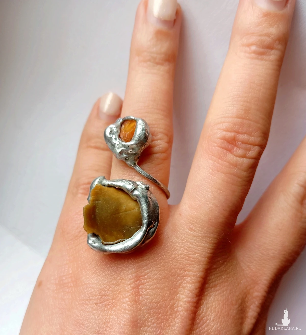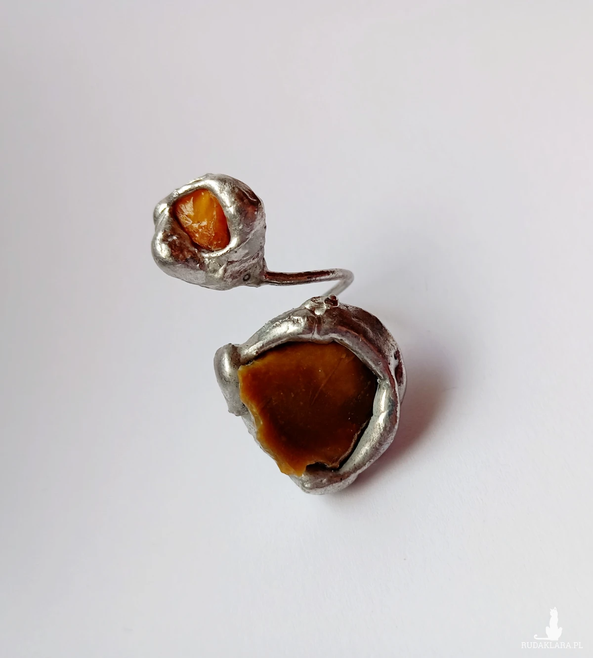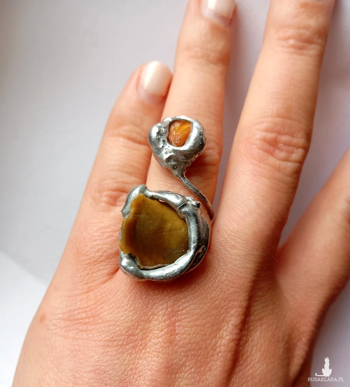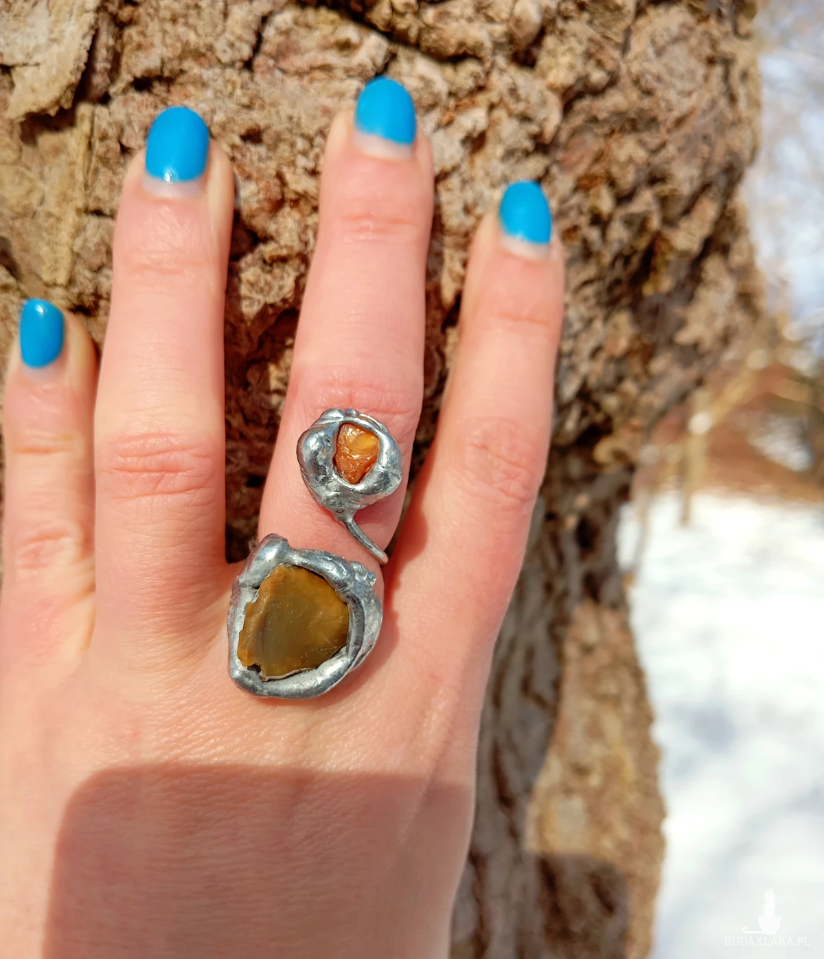 Pierścionek z bursztynem i brązowym krzemieniem, regulowany, oprawa cynowa