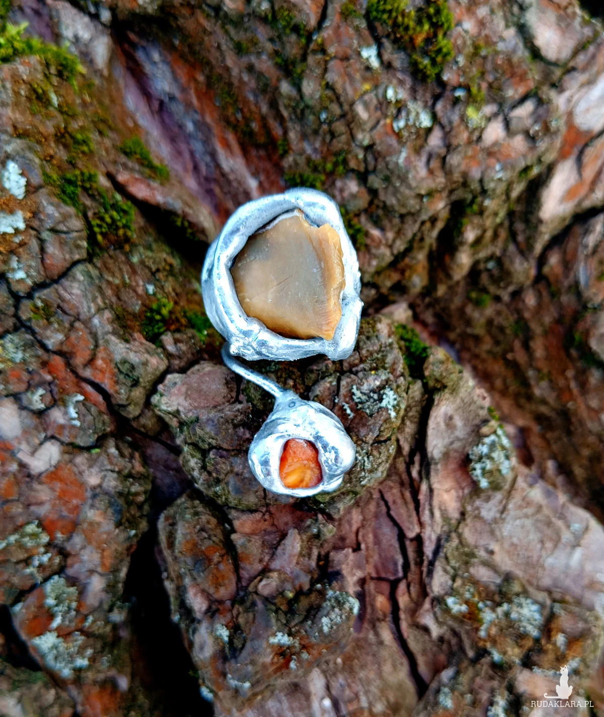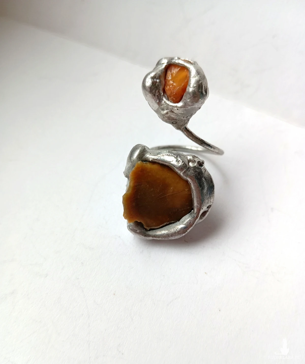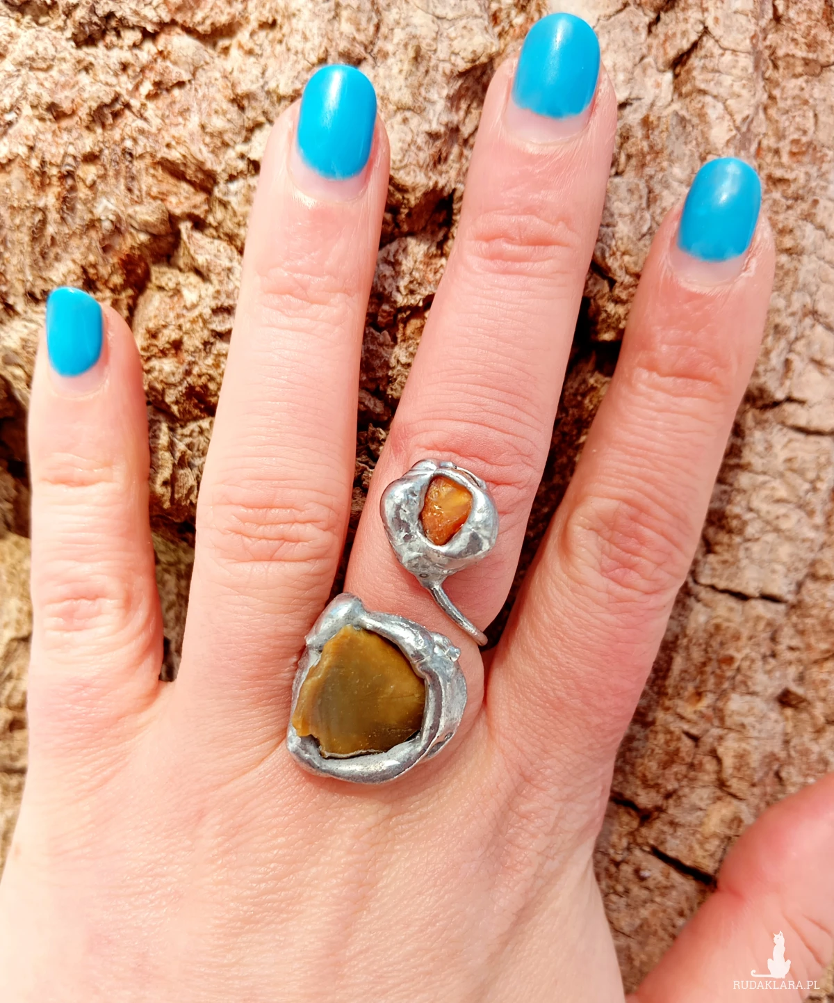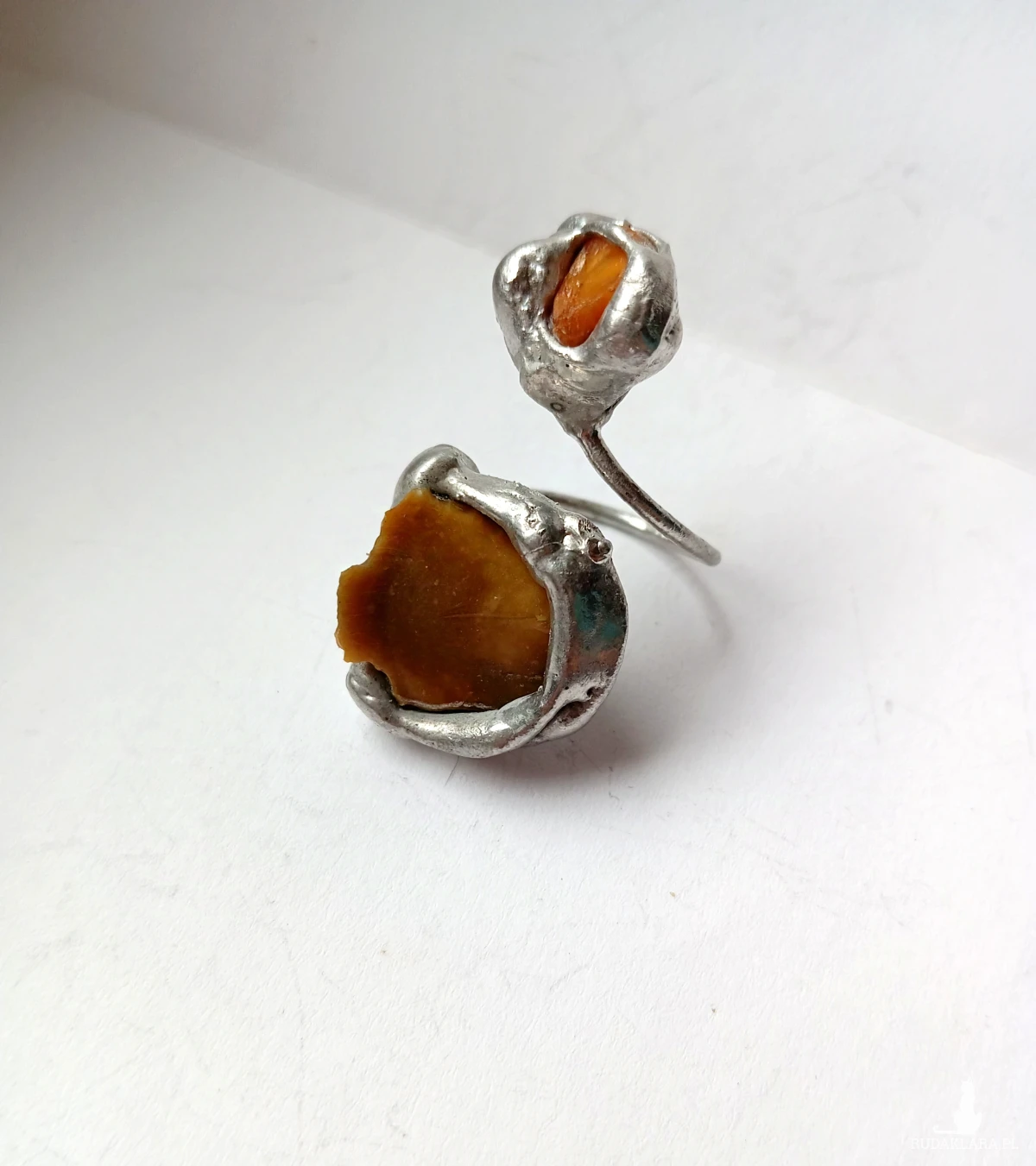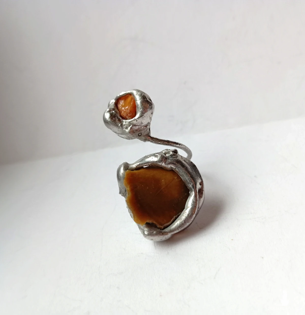 Pierścionek z bursztynem i brązowym krzemieniem, regulowany, oprawa cynowa