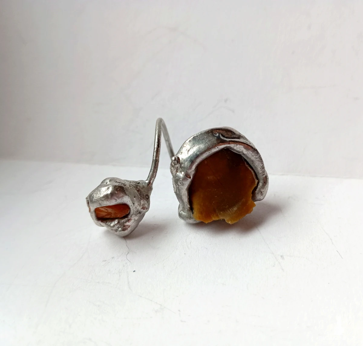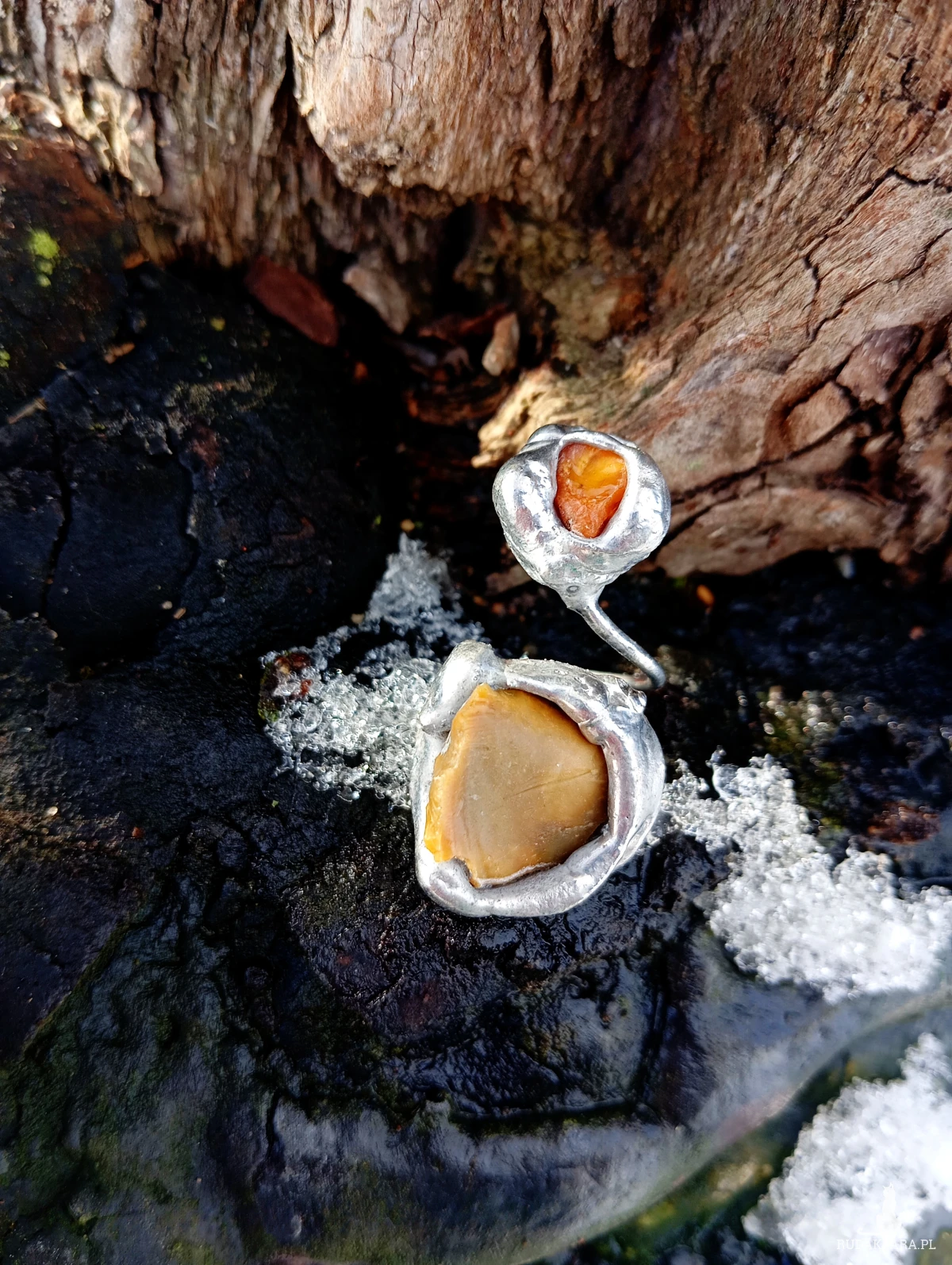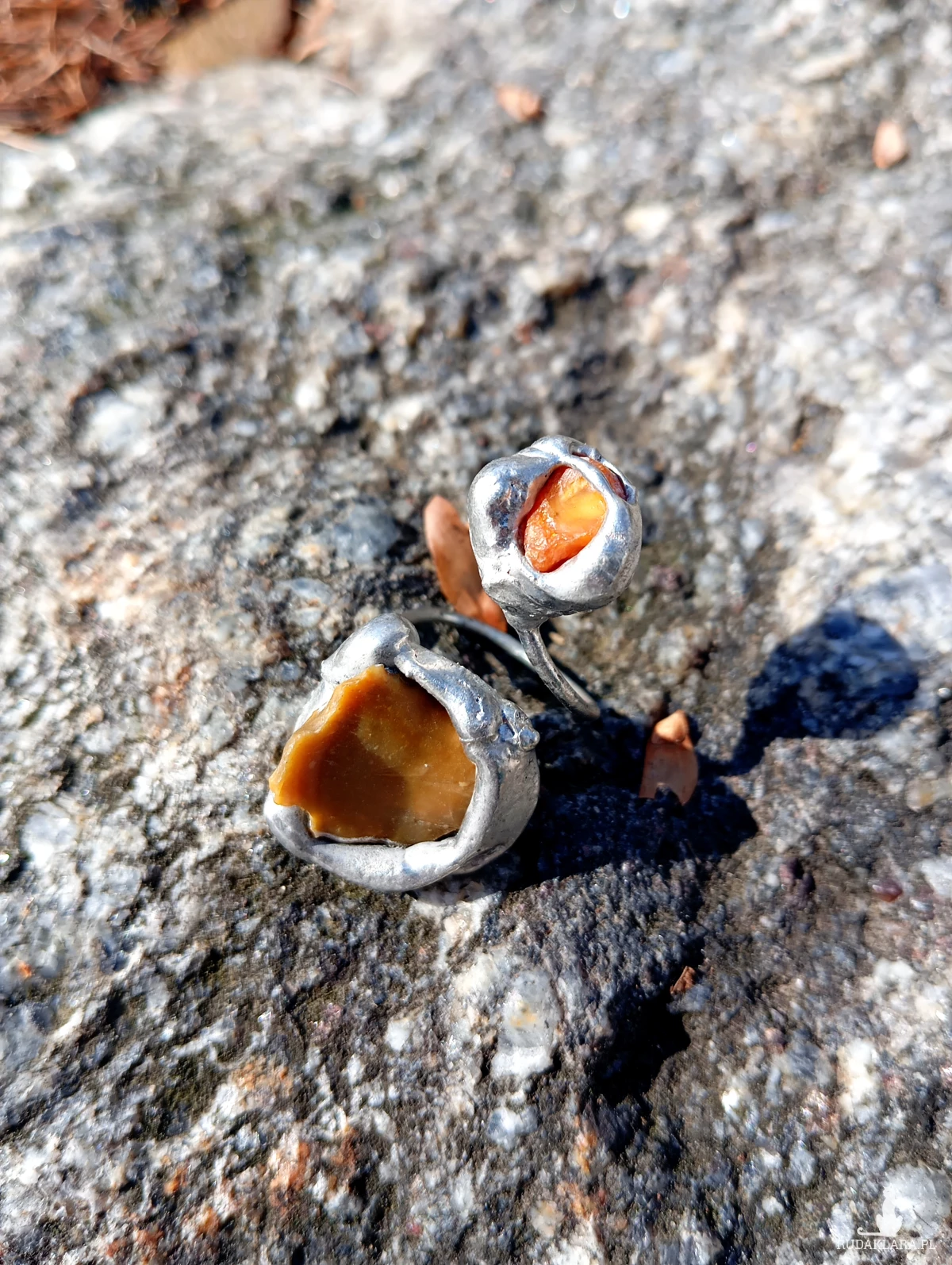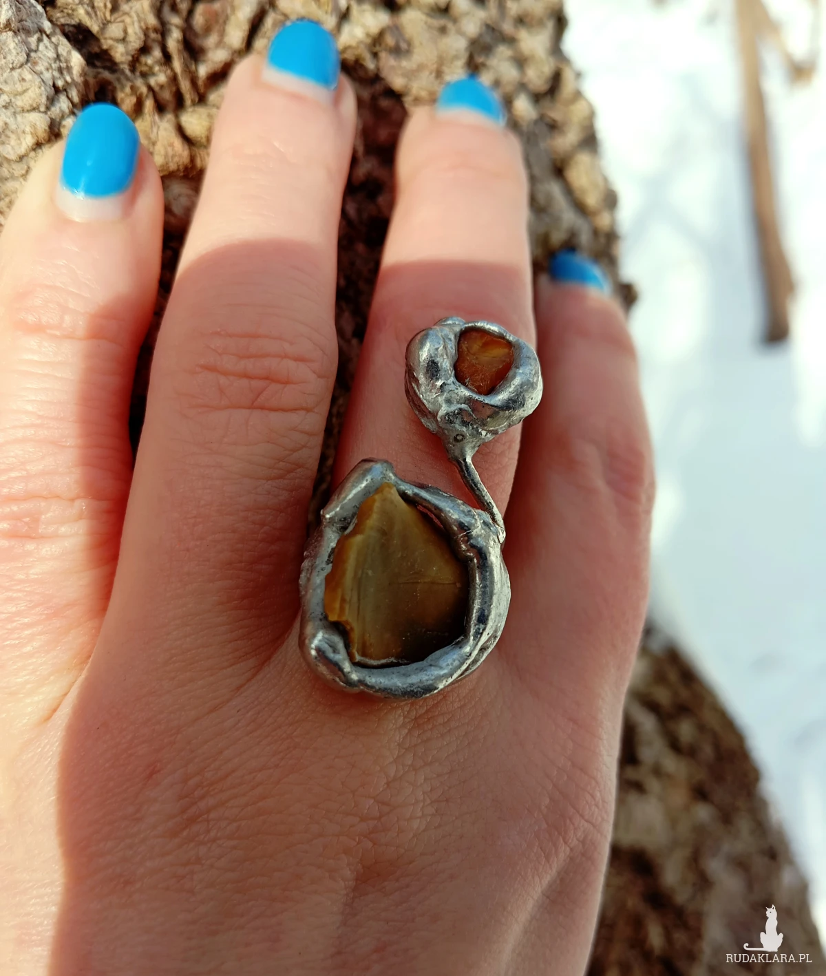 Pierścionek z bursztynem i brązowym krzemieniem, regulowany, oprawa cynowa