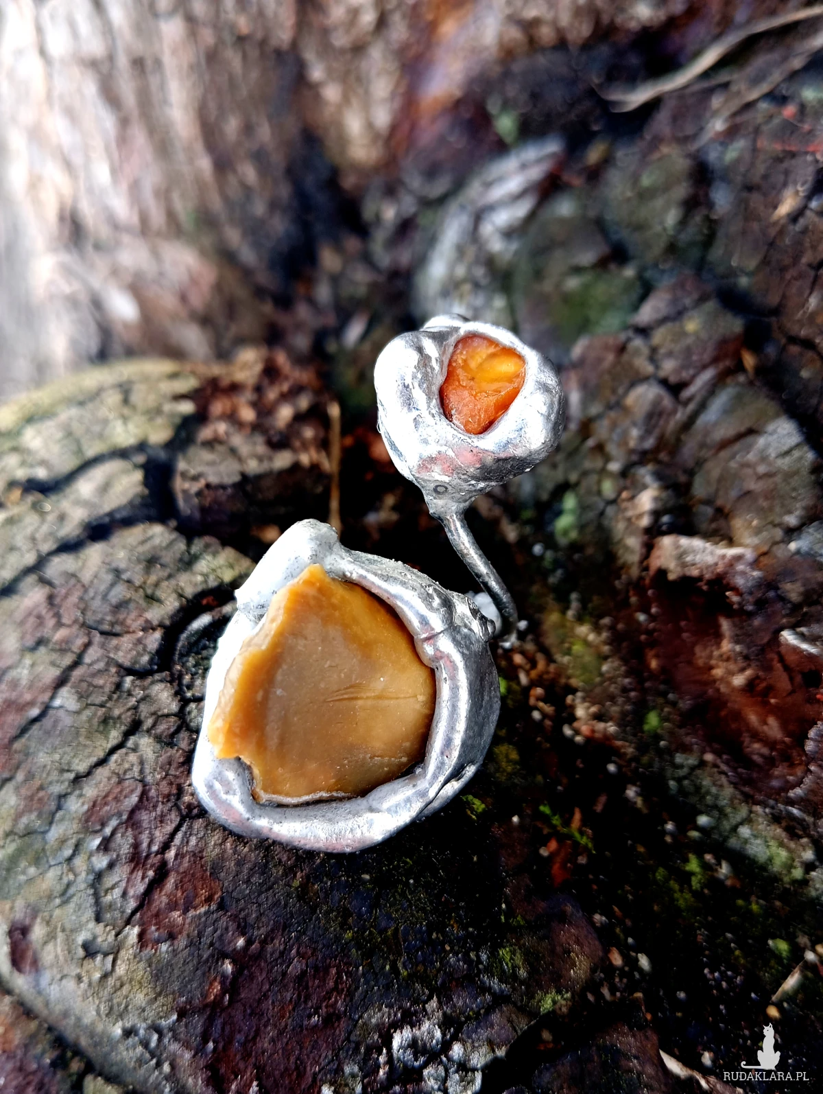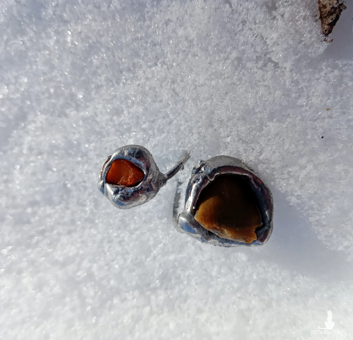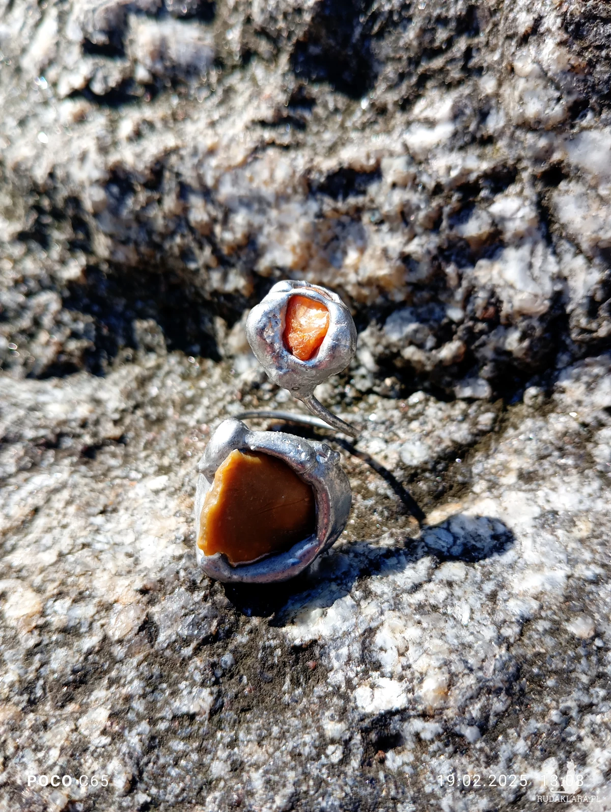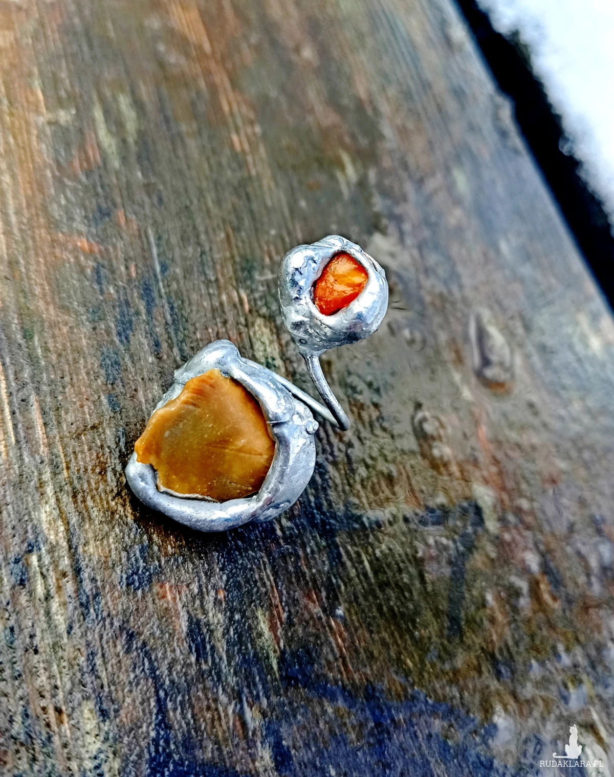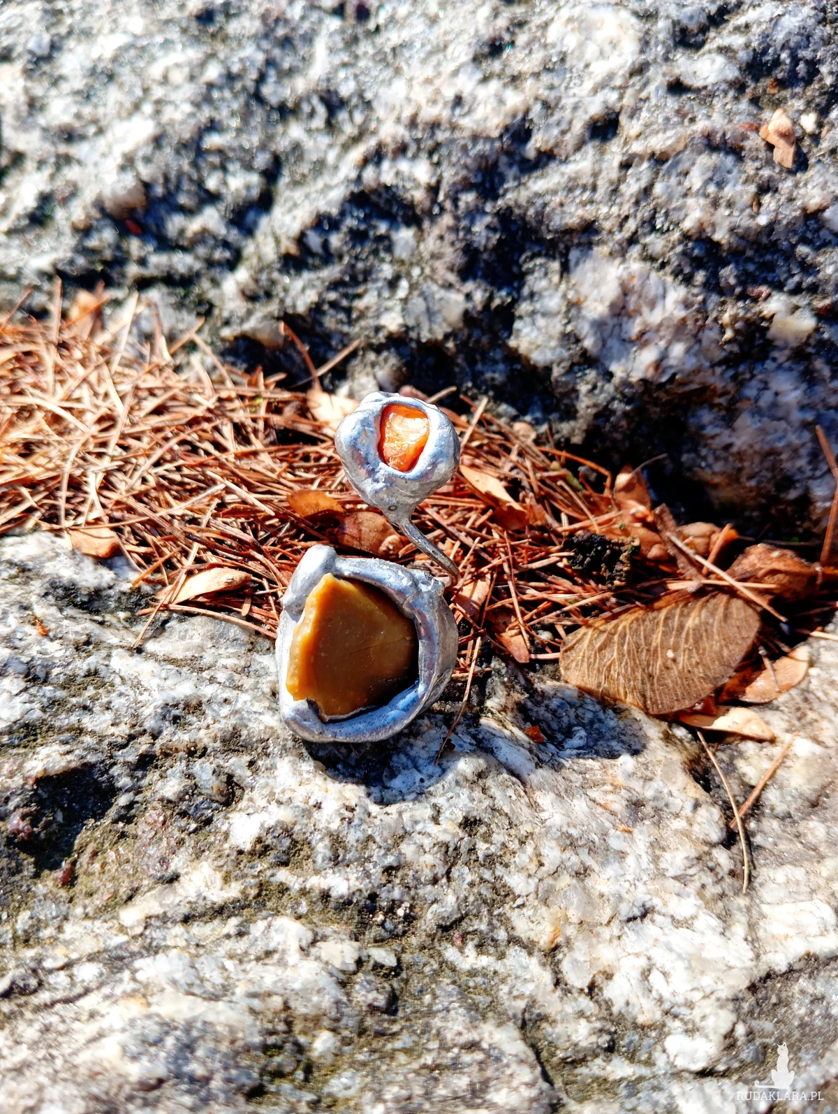 Pierścionek z bursztynem i brązowym krzemieniem, regulowany, oprawa cynowa