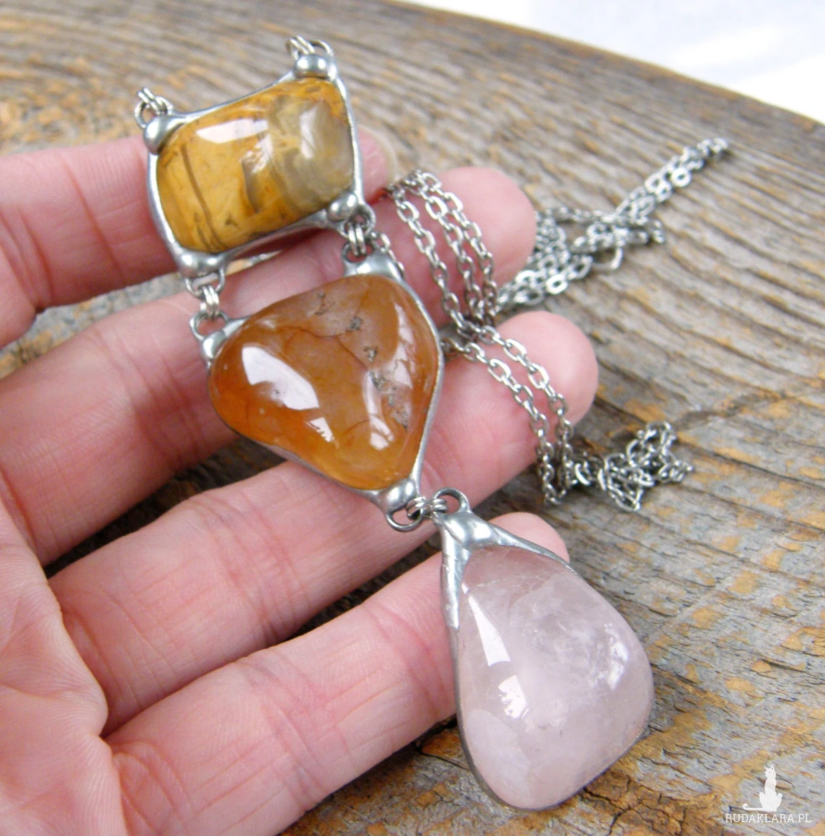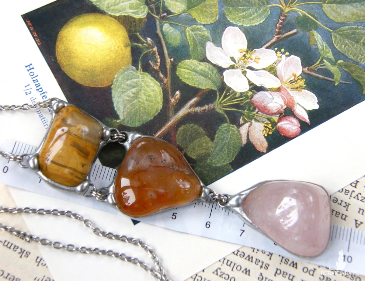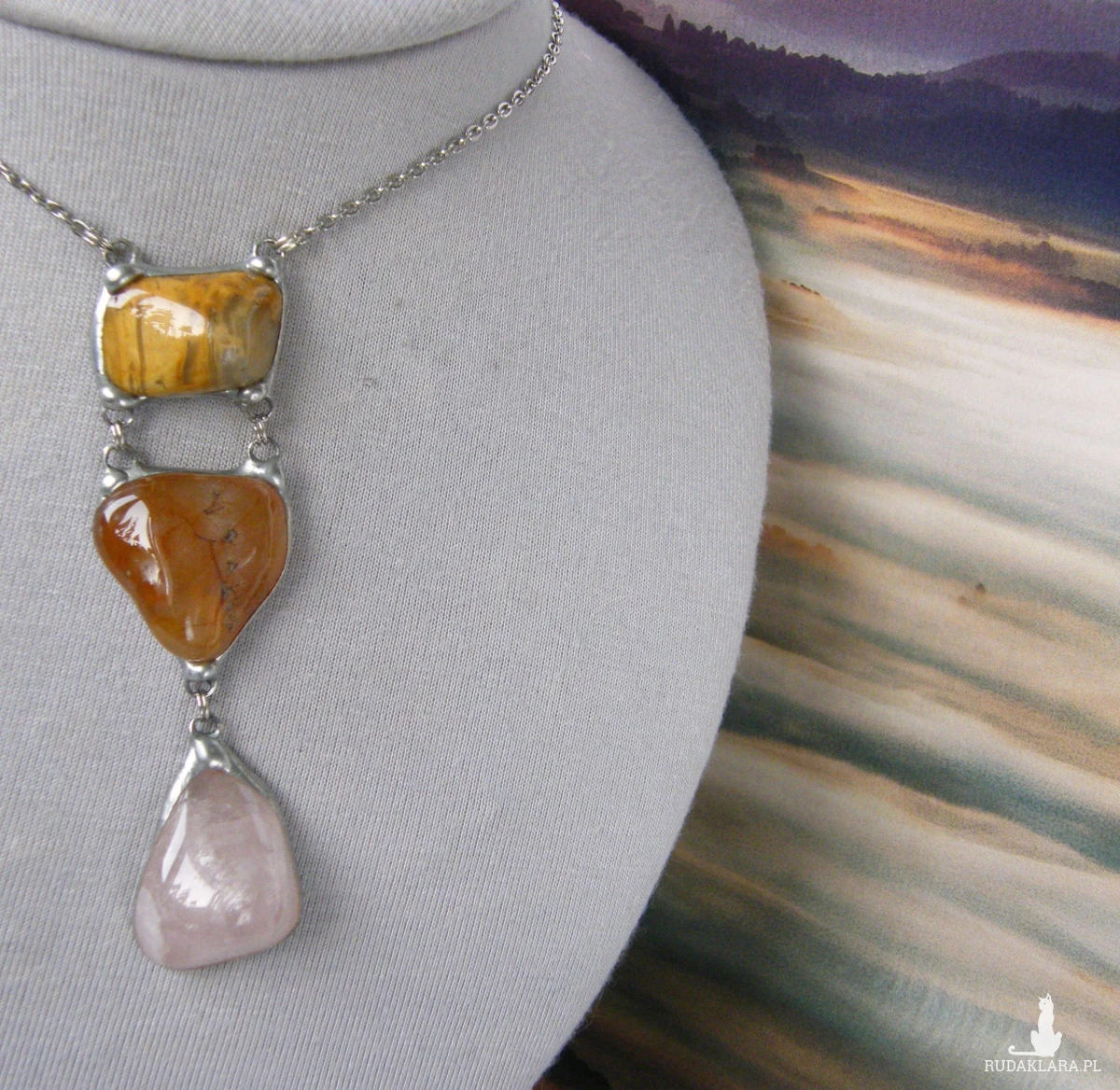 Unikatowy wisiorek wykonany ręcznie w technologii witrażowej Tiffany, z kamieni półszlachetnych: karneolu, kwarcu różowego i jaspisu, oprawionych w cynę.