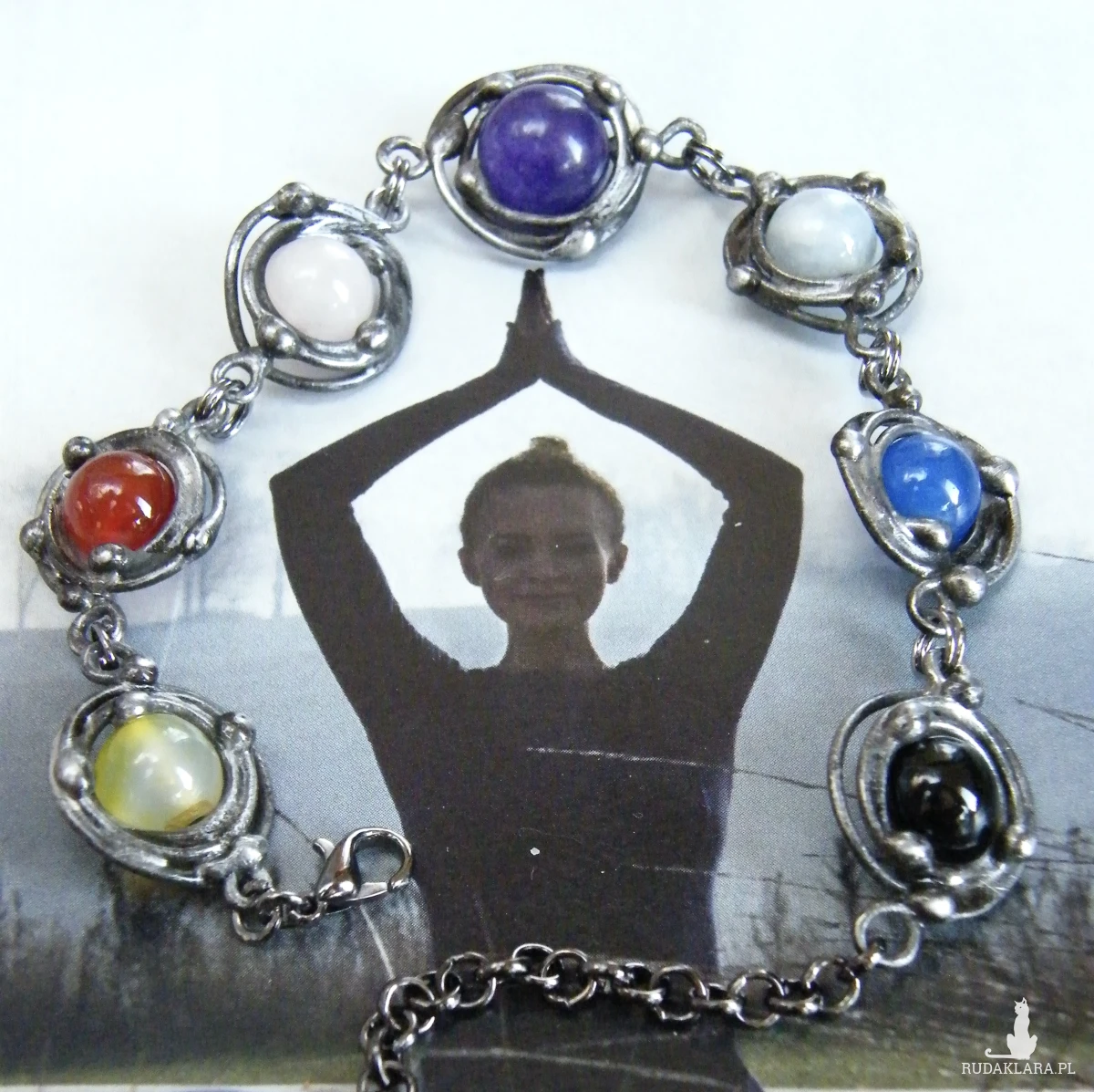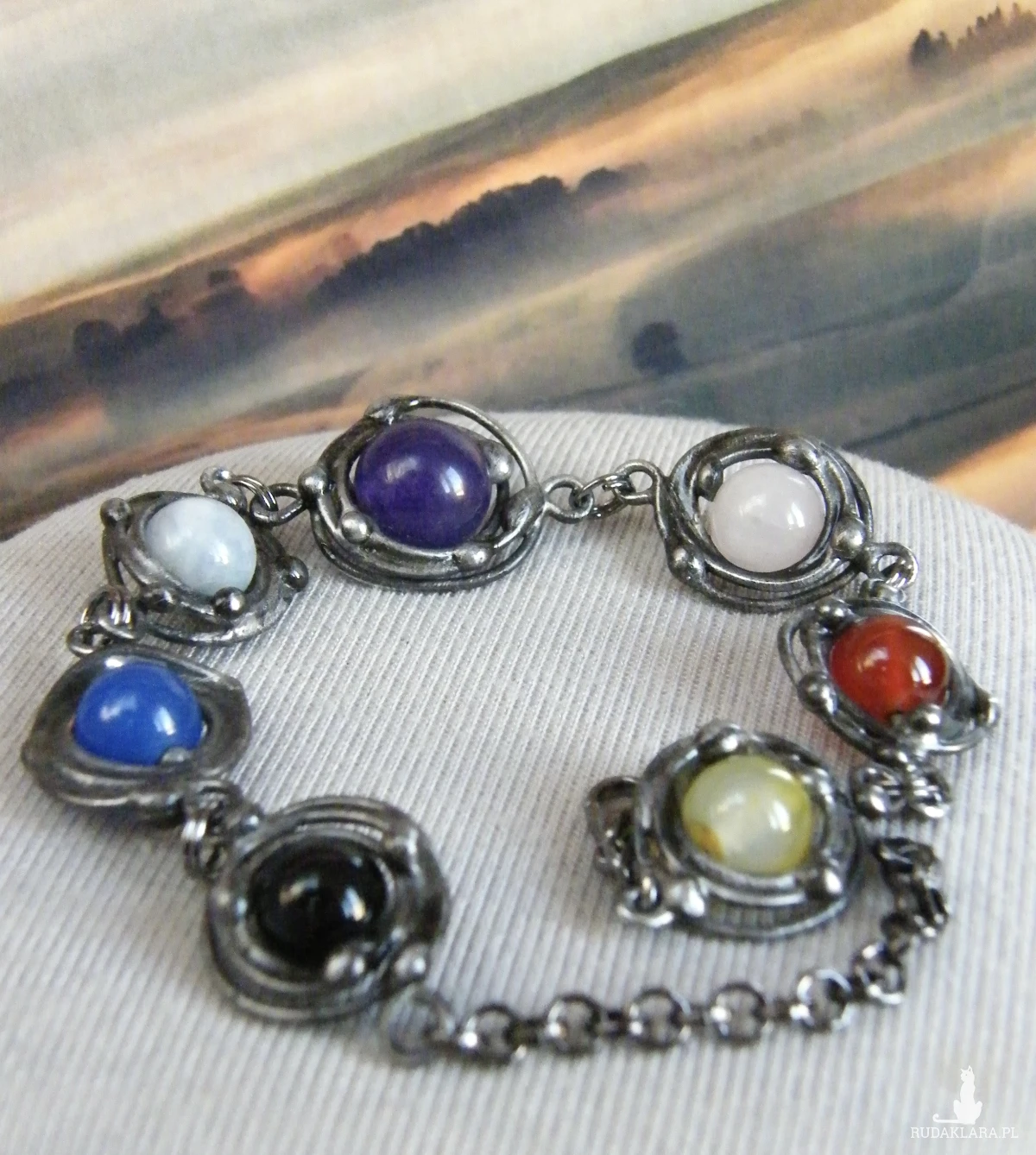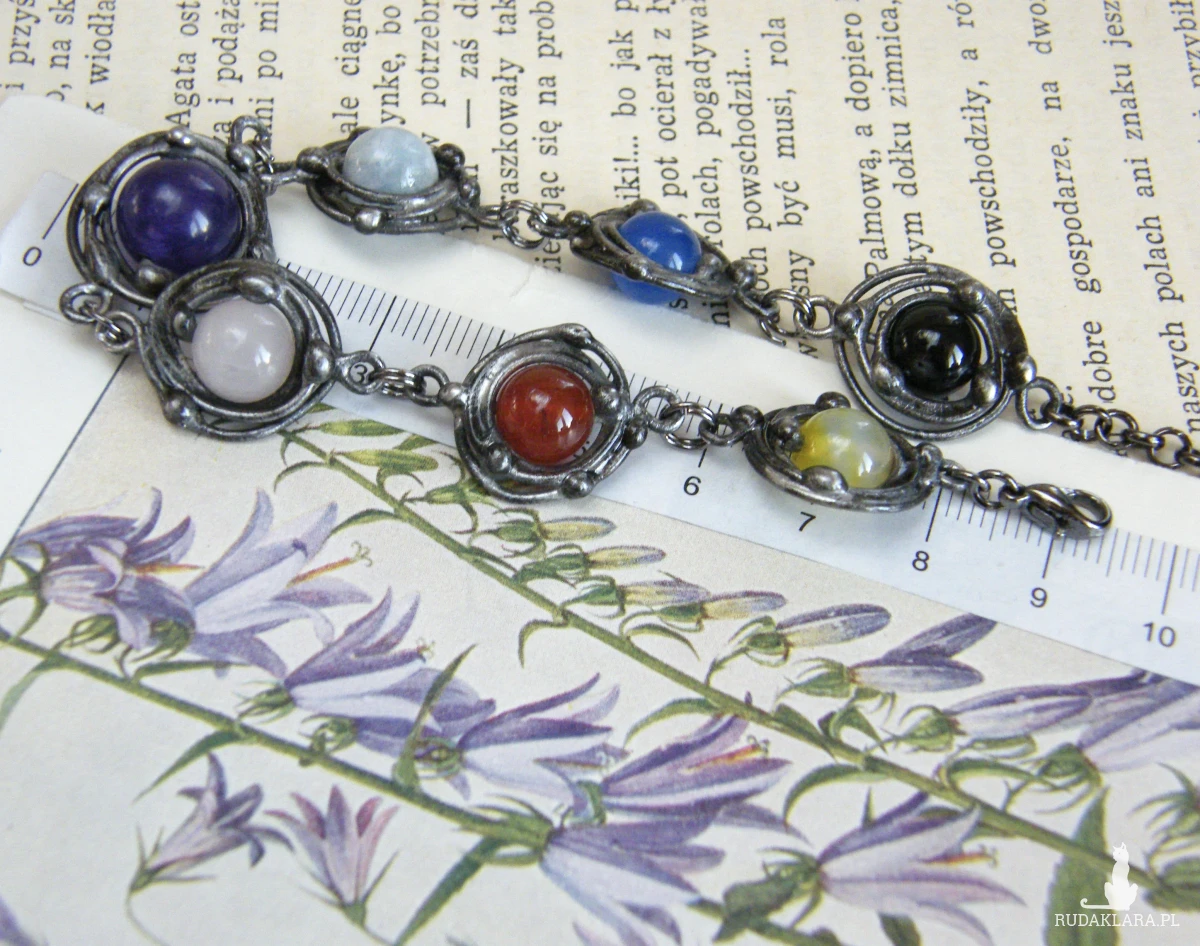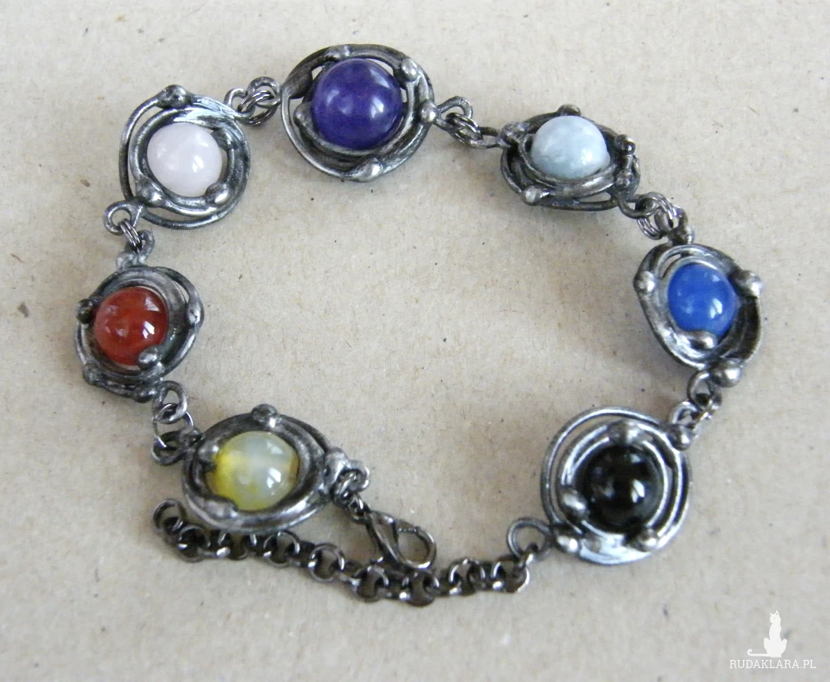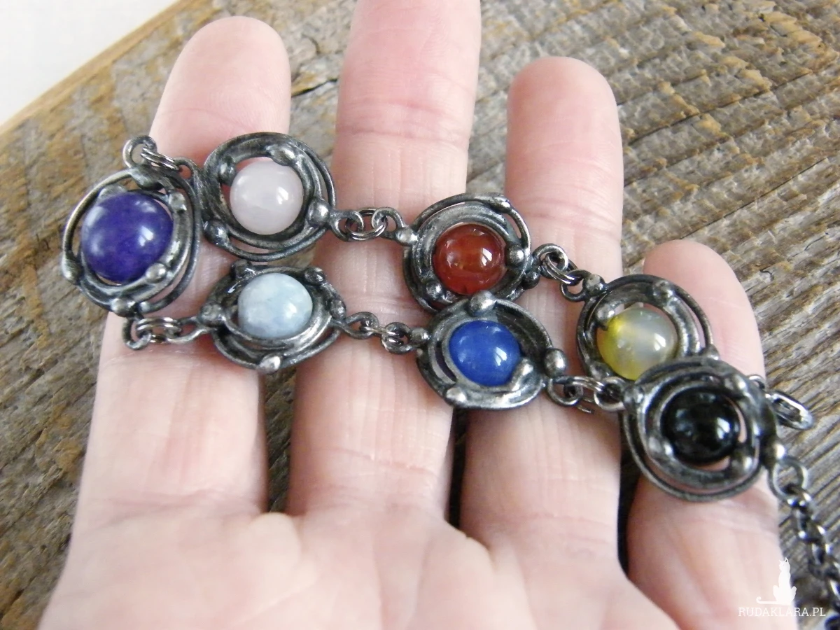 Oryginalna bransoletka, wykonana z naturalnych kamieni: agatu, karneolu, kwarcu różowego i niebieskiego, ametystu, jadeitu oraz onyksu, oprawionych techniką witrażową w cynowany, miedziany drucik.