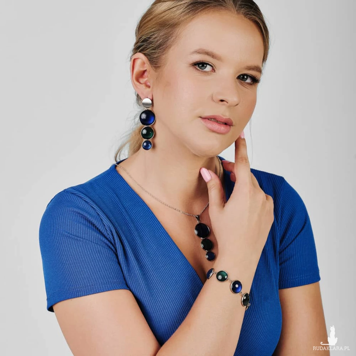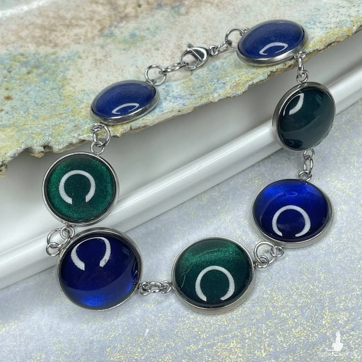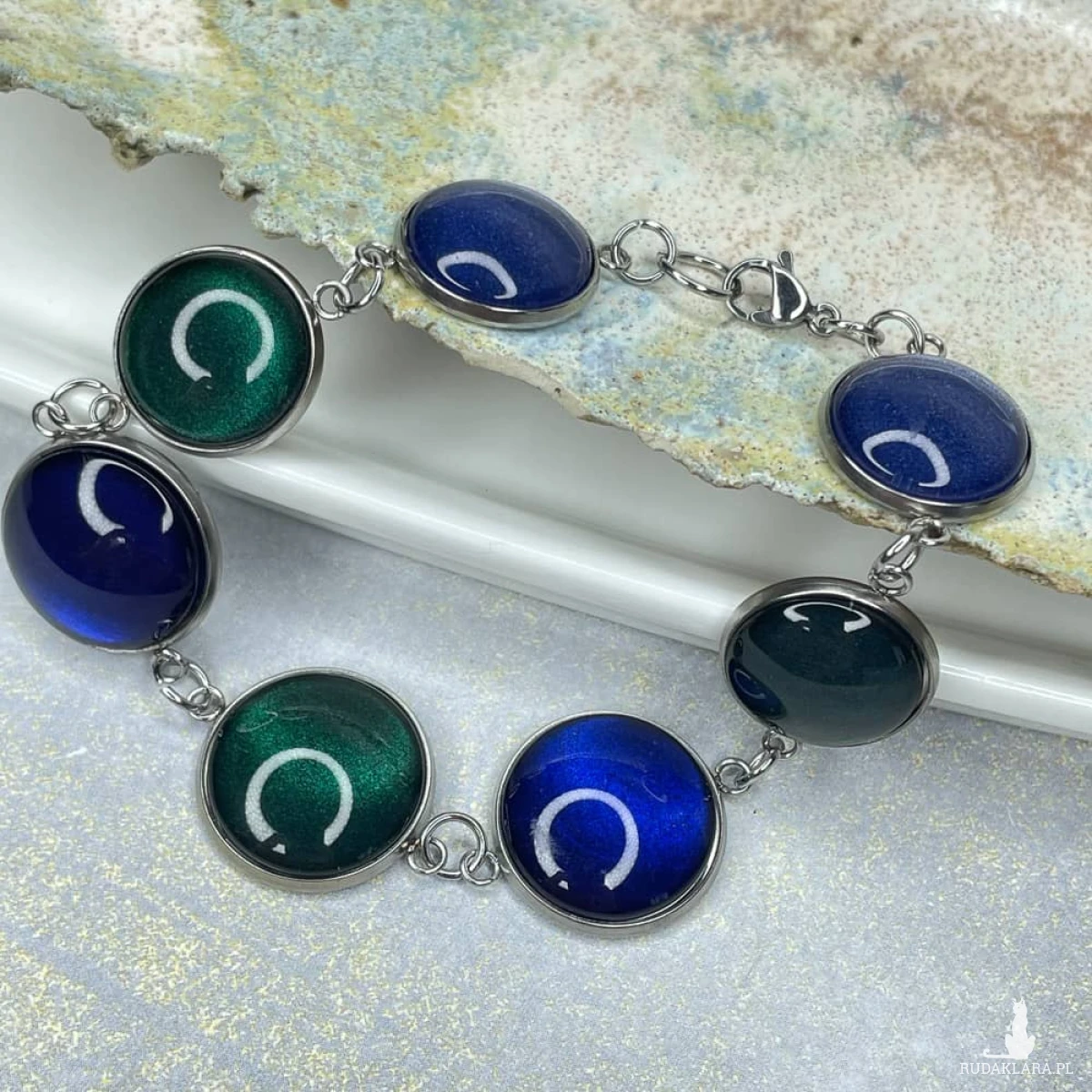 Ta pełna blasku bransoletka jest częścią kolekcji “W blasku perłowego księżyca”. Bransoletka wykonana jest z ręcznie malowanych kaboszonów umieszczonych w bazach ze stali szlachetnej. Szklane elementy zachwycają subtelnym, opalizującym blaskiem, który jest niczym odbicie księżyca na tafli wody. Bransoletka mieni się w świetle, przyciągając wzrok i dodając elegancji każdej stylizacji. Ten dodatek jest idealny dla osób ceniących sobie wyrafinowaną i ponadczasową biżuterię. Do kompletu możesz dobrać kolczyki Meyra e6/m28. Materiał: stal szlachetna, malowane ręcznie szkło Wykończenie: połysk Długość bransoletki: ok 19,5 cm Średnica kaboszonu: 12; 16 mm Waga pary kolczyków: ok 13 g SKU: e23/m28 Jak dobierać komplety? Kolory na zdjęciach mogą się różnić ze względów technicznych. Aby dobrać identyczny odcień, zwróć uwagę na numer SKU produktu. Pierwsza część to numer modelu, a numery po “/” to kolor, np. /17 oznacza morski perłowy. Produkty z tym samym SKU po "/" mają identyczny kolor. Dzięki temu możesz łatwo tworzyć komplety, mając pewność, że biżuteria jest w tym samym odcieniu. Stwórz własny komplet! Jeśli nie ma biżuterii w wybranym modelu lub kolorze którego szukasz, możesz ją zamówić indywidualnie. Wyślij do nas maila z nazwą, numerem modelu i kolorem, a my w miarę możliwości wykonamy biżuterię na zamówienie. Termin realizacji ustalamy indywidualnie.