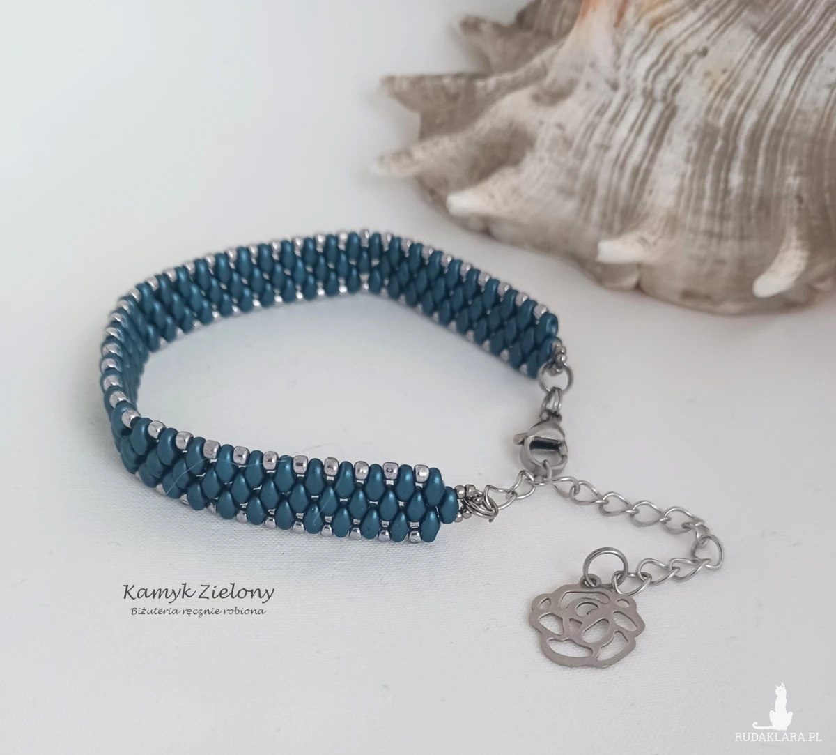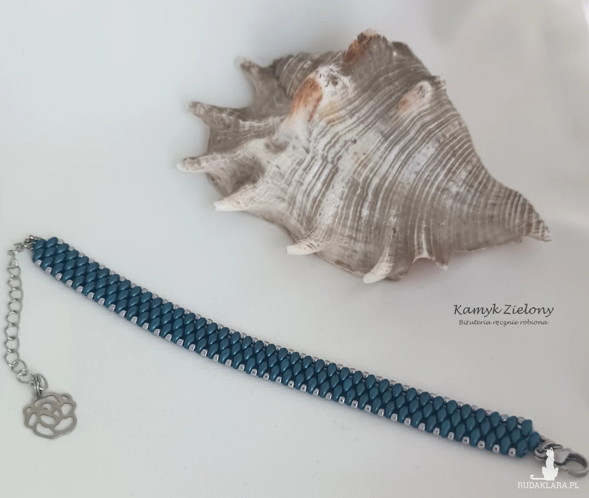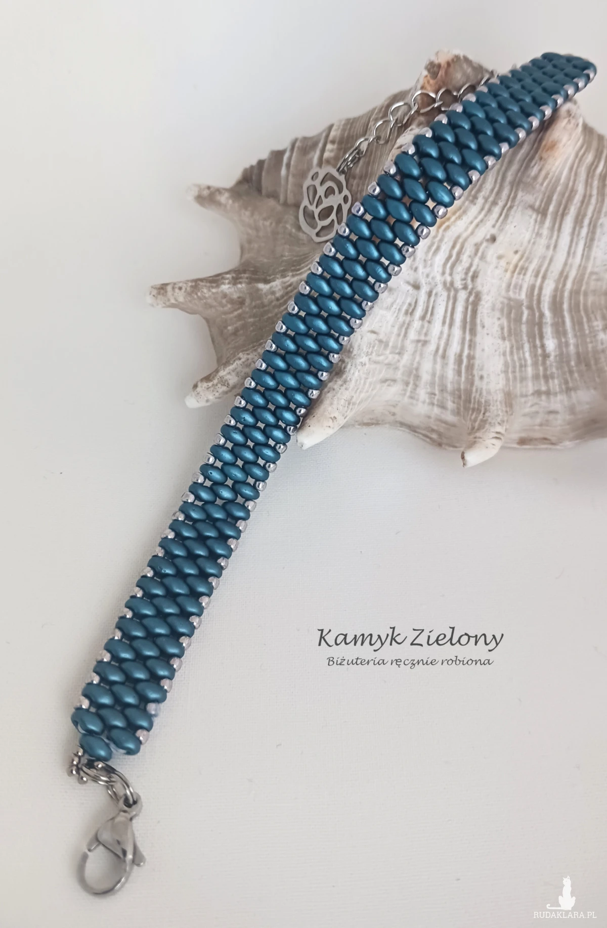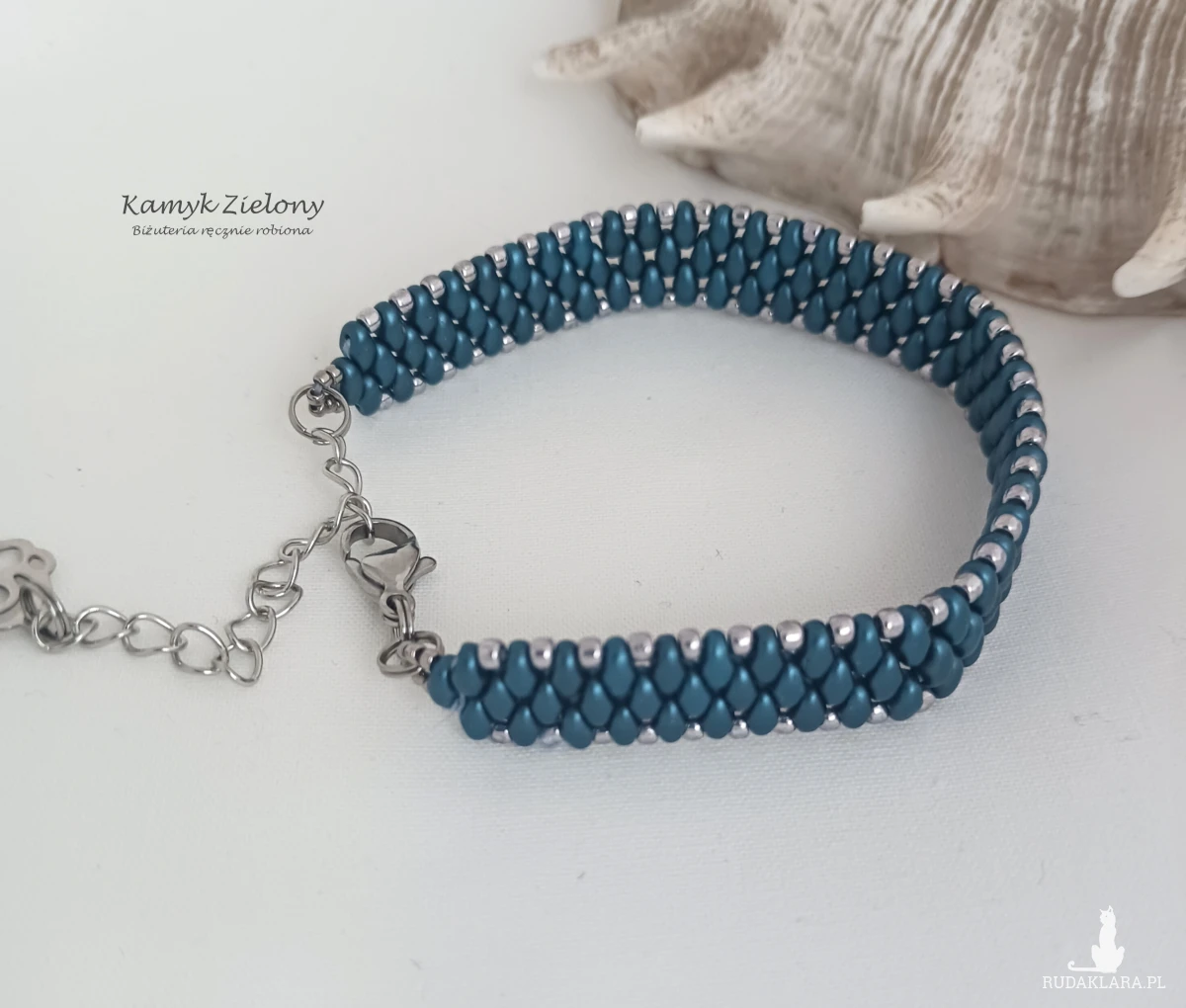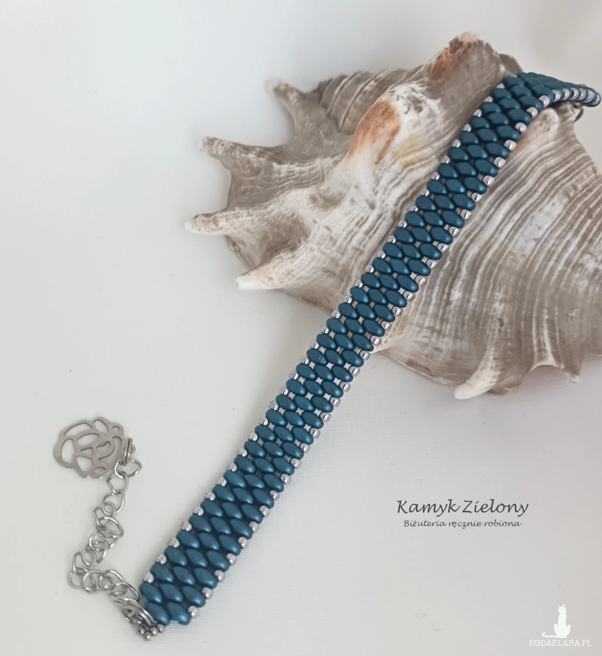 Wąska, ręcznie wykonana bransoletka ze szklanych koralików Miniduo oraz Toho. Do jej zrobienia wykorzystano koraliki w kolorze ciemnoniebieskim, o pięknym, satynowym wykończeniu oraz koraliki Toho w kolorze srebrnym o niebieskawym odcieniu.