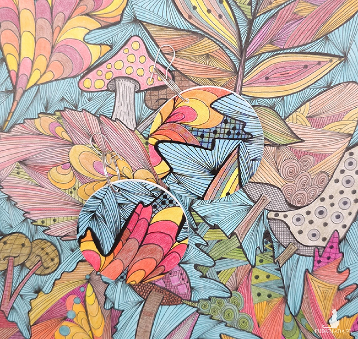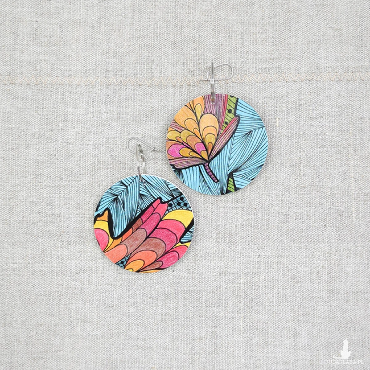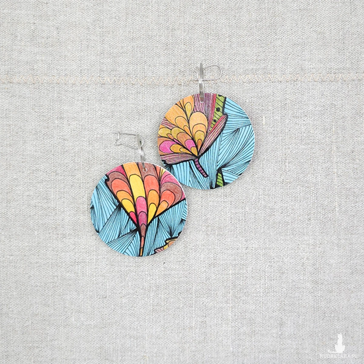 Kolczyki wykonane z drewnianej bazy oraz części mojego autorskiego rysunku "Jesień".