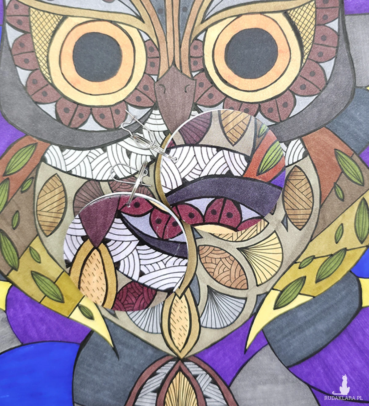 Kolczyki wykonane z drewnianej bazy oraz części mojego autorskiego rysunku "Sowa".