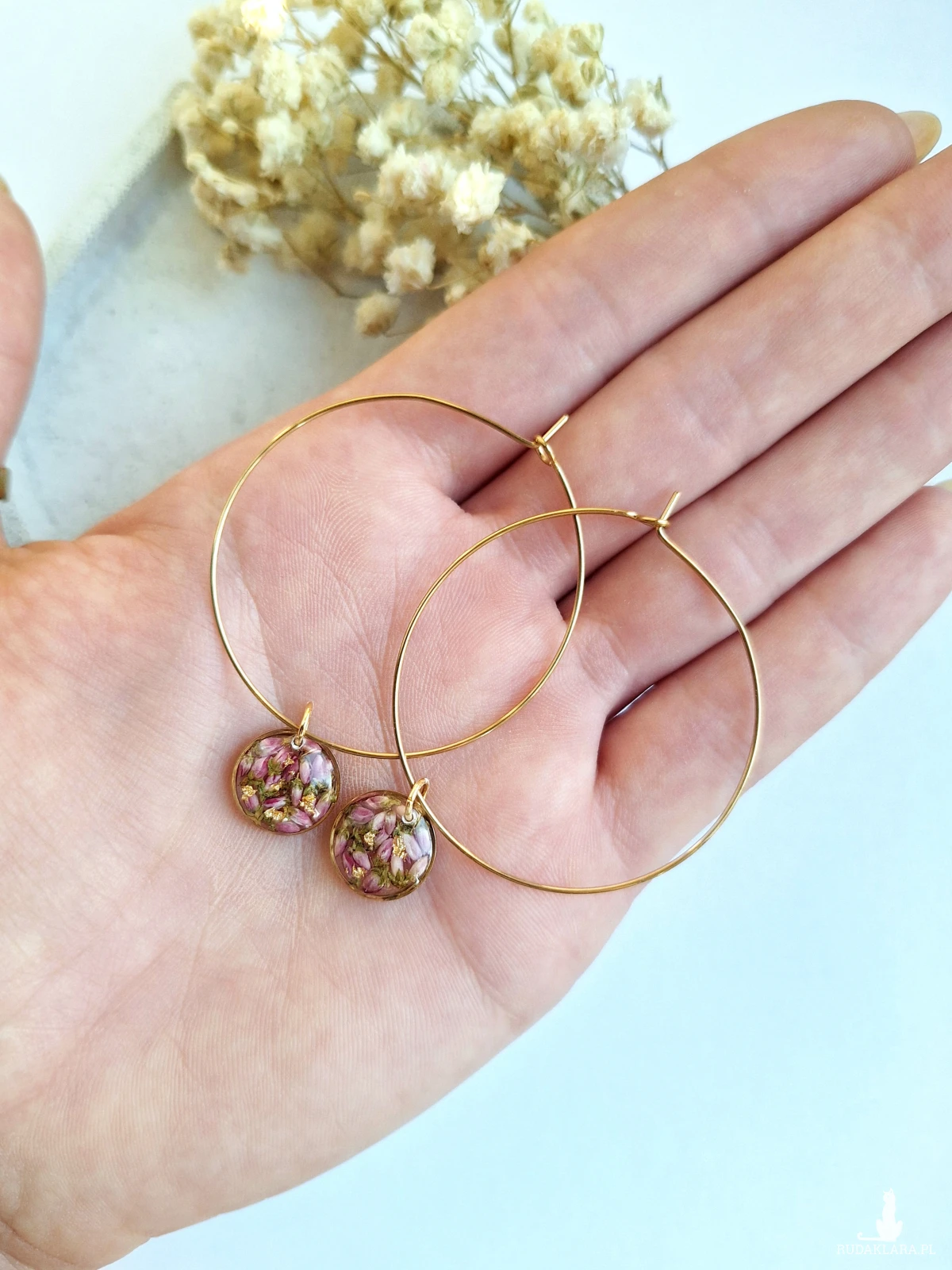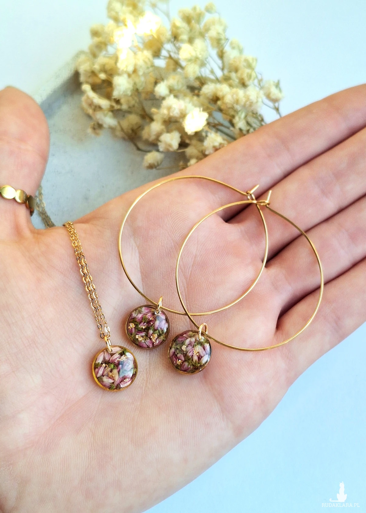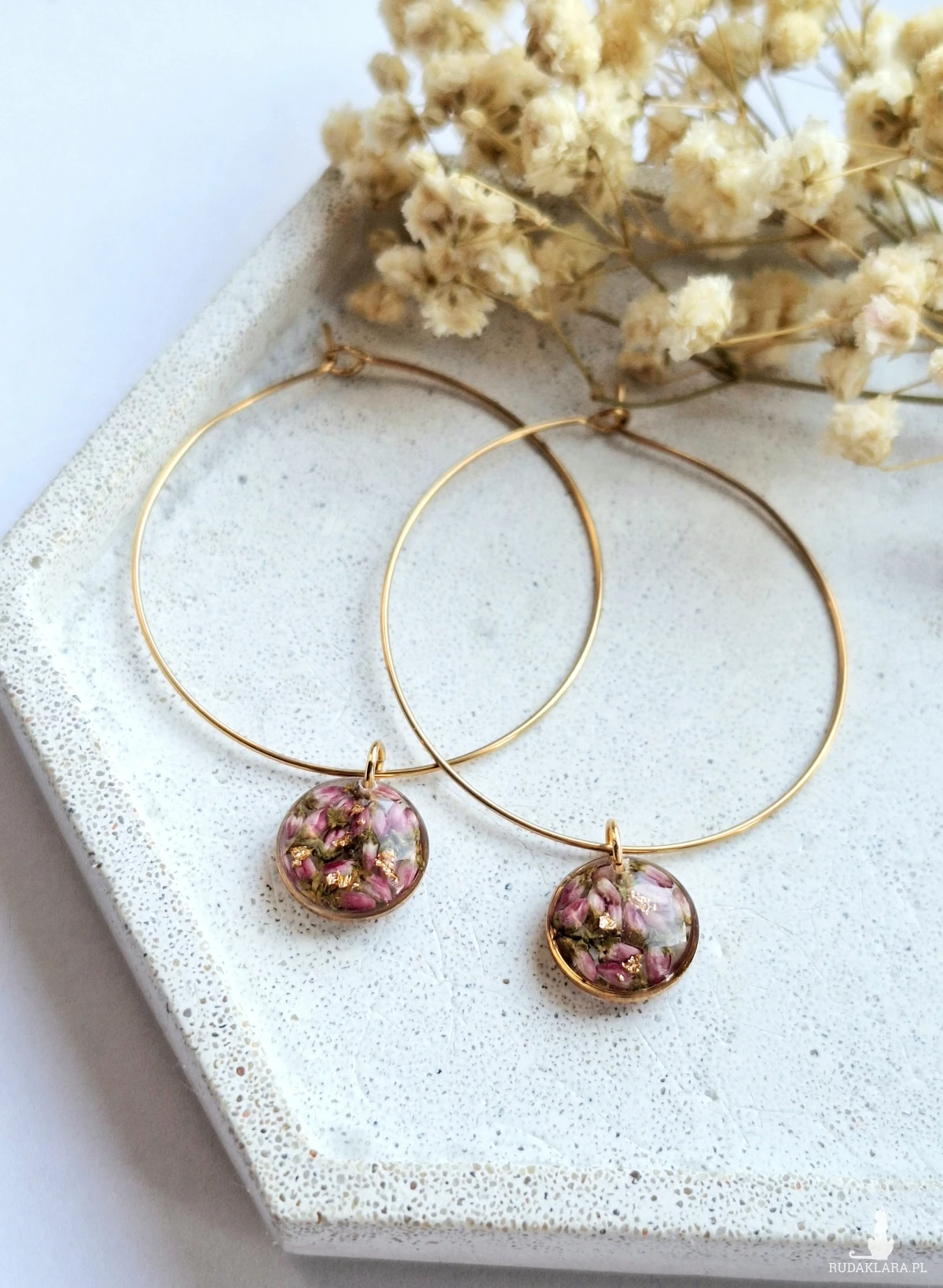 Urocze kolczyki z zatopionymi kwiatami wrzosa i płatkami złota. Wykonane z wysokiej klasy żywicy, która nie zmienia koloru pod wpływem promieniowania UV oraz wysokiej jakości stali chirurgicznej.