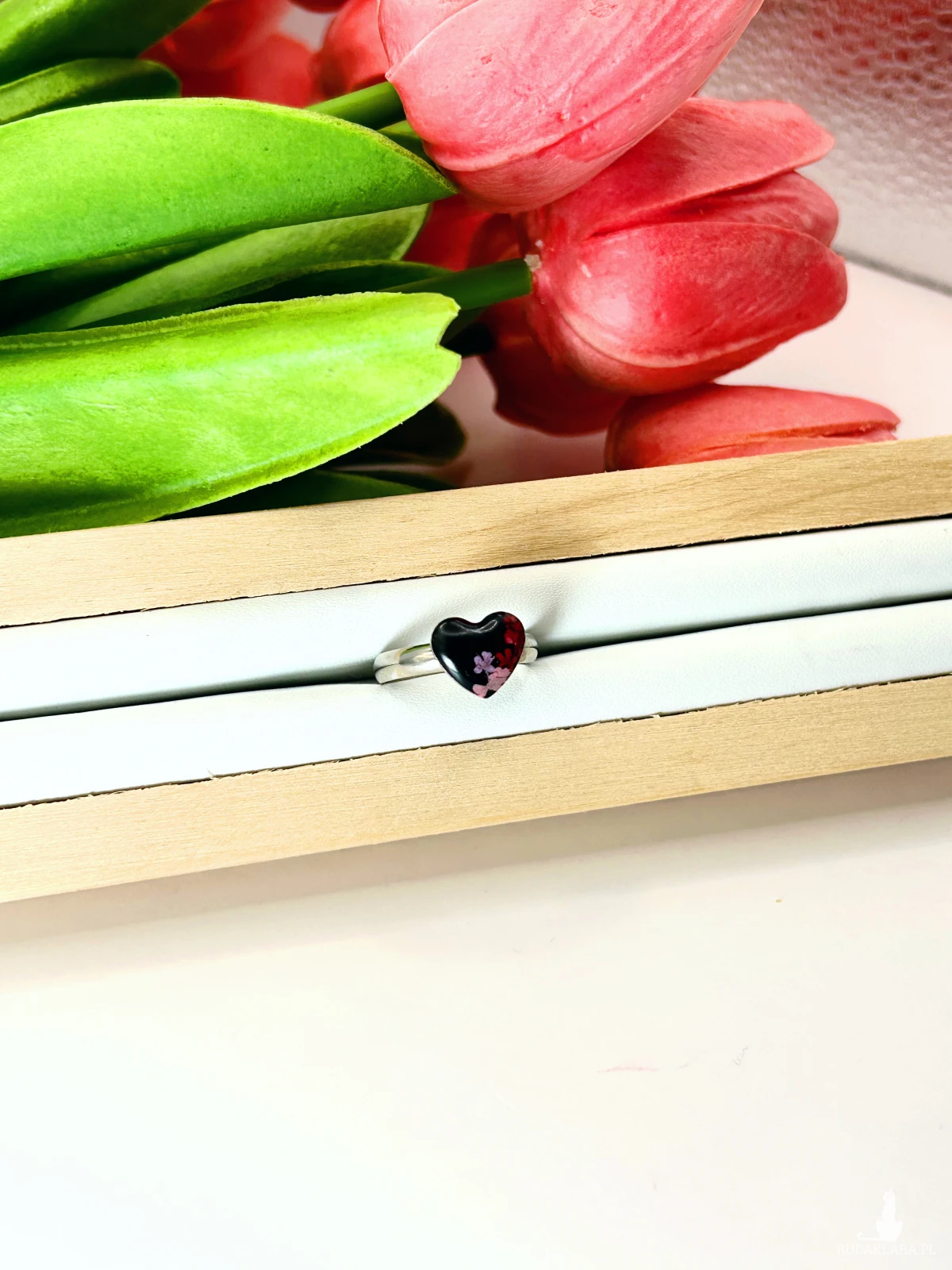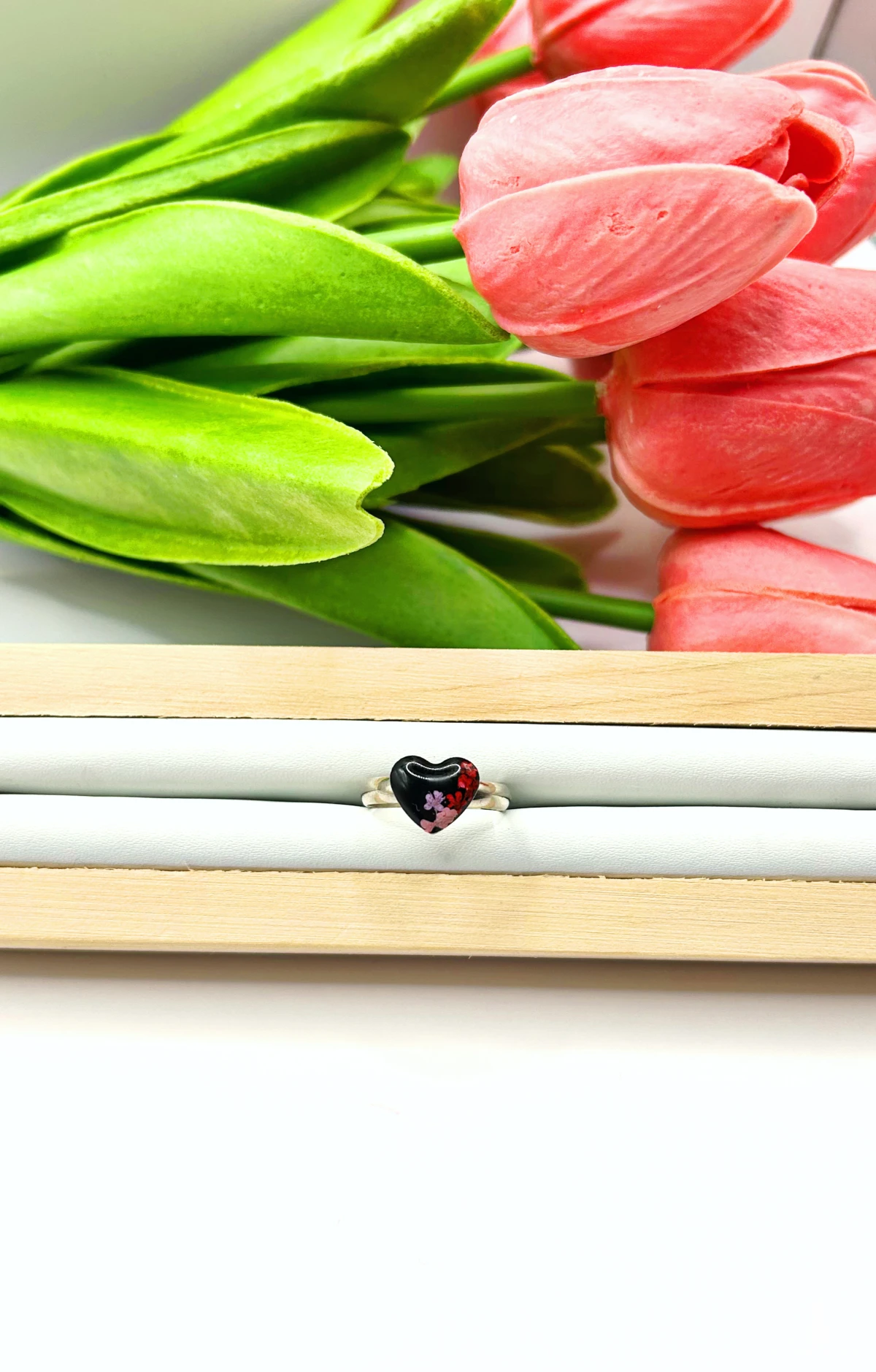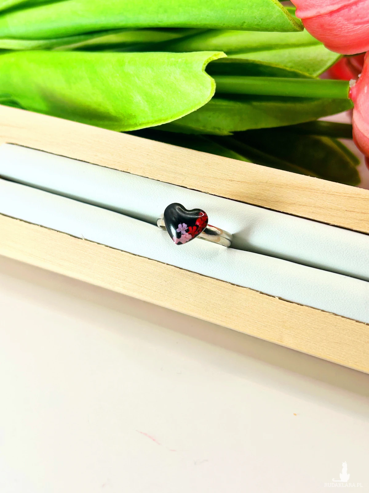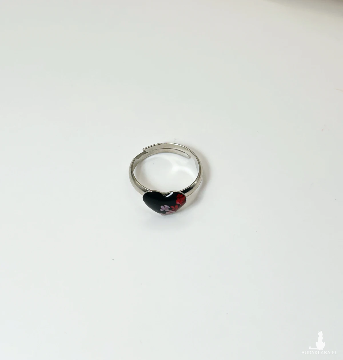 Ręcznie wykonany pierścionek w kształcie serca z kwiatami dzikiej marchwi na czarnym tle.