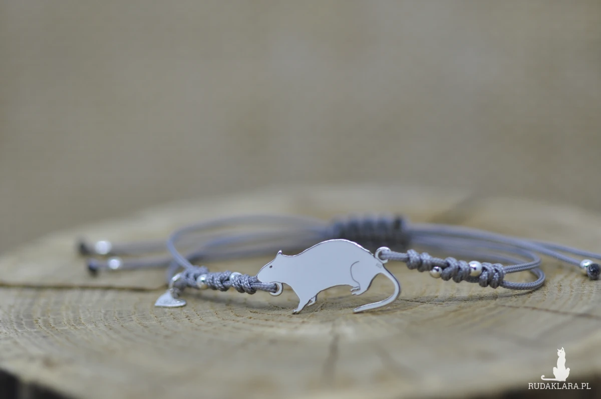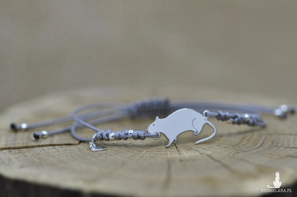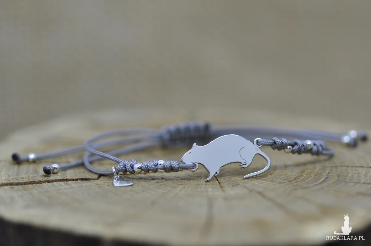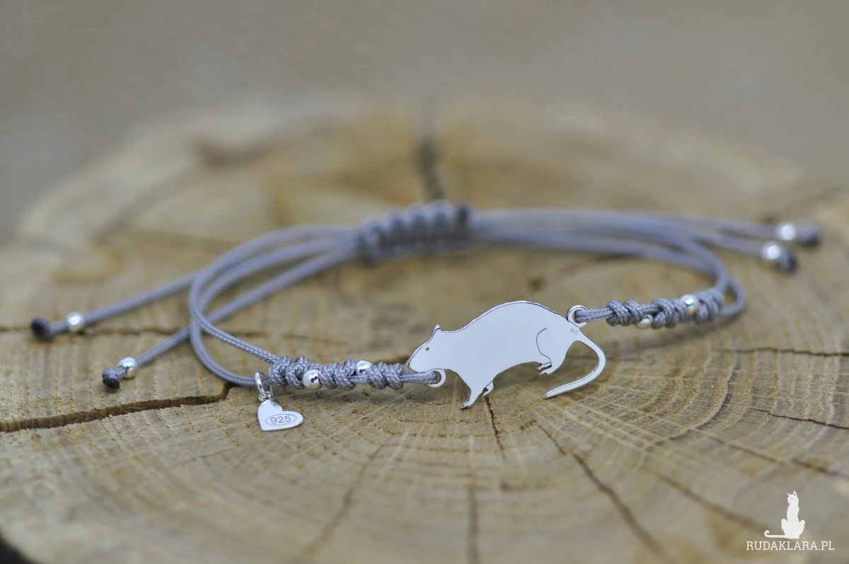Szczurek ze srebrnej blachy próby 925, wymiary: 25,1 x 15,2 mm, grubość 0,8 mm oraz srebrne dodatki.