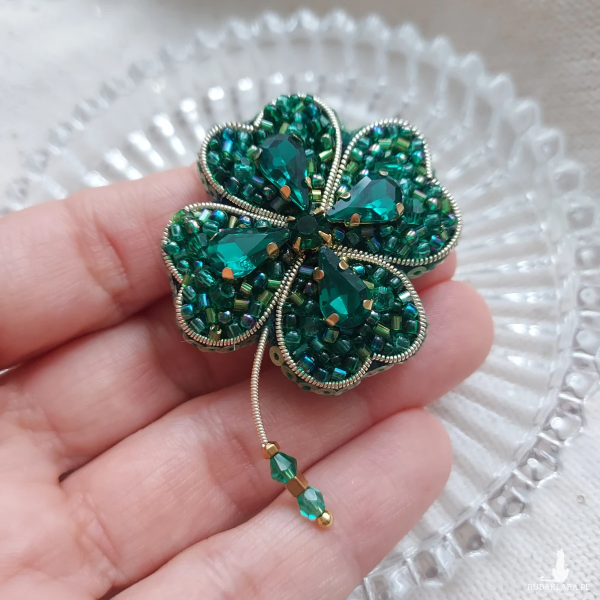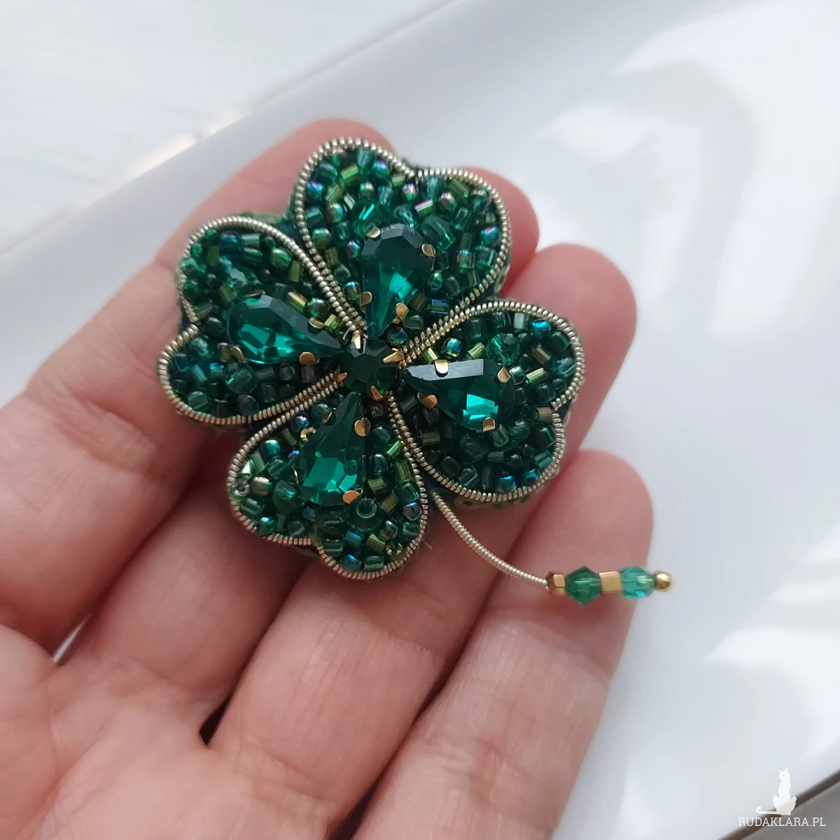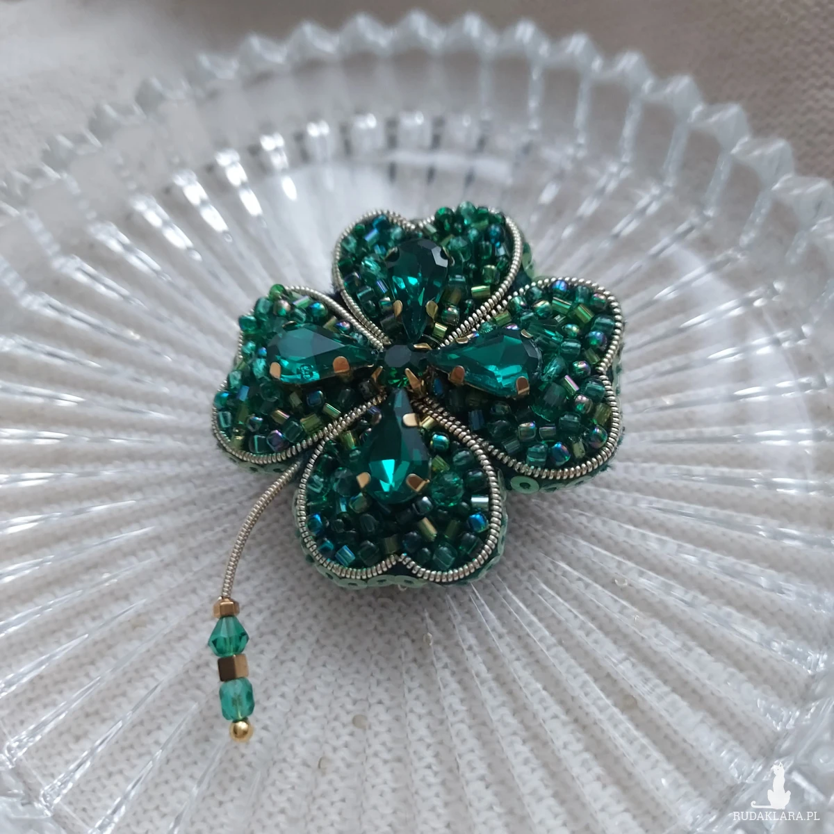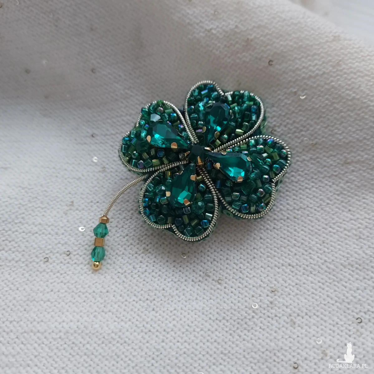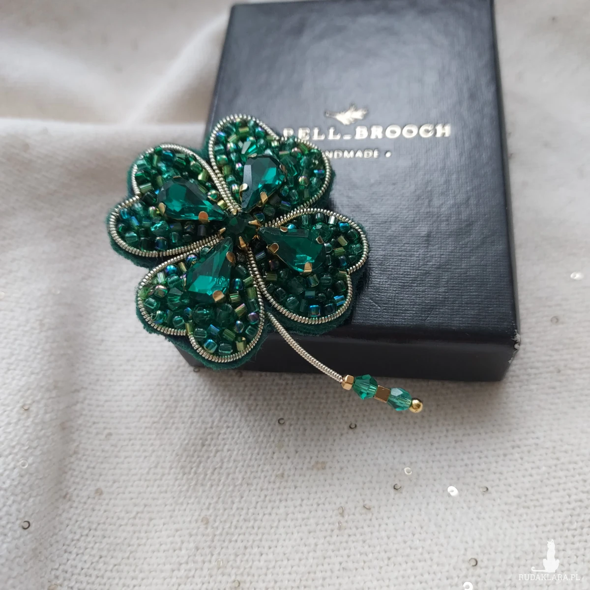 Broszka czterolistna koniczyna w kolorze szmaragdowym to wyjątkowy wiosenny dodatek biżuteryjny.
