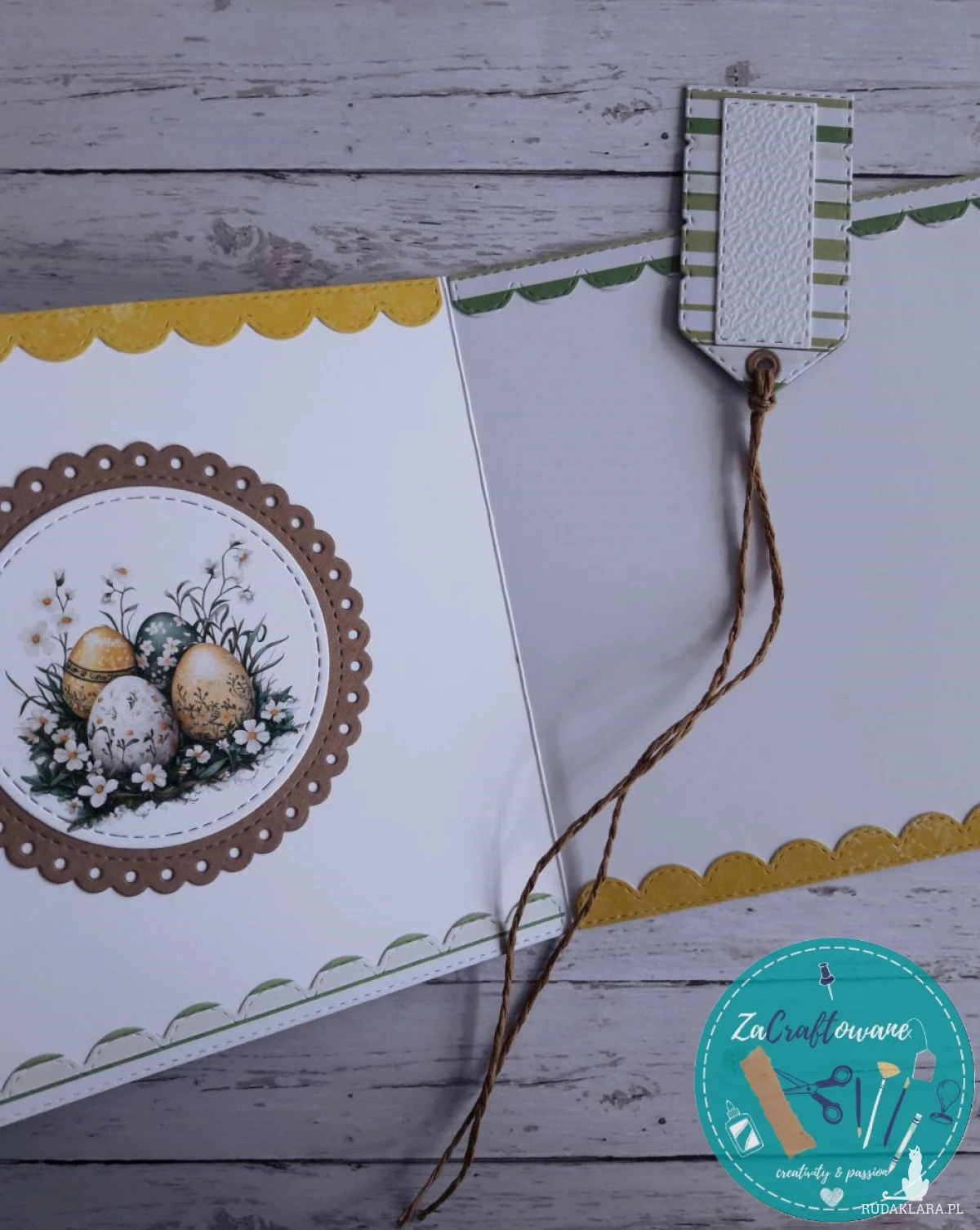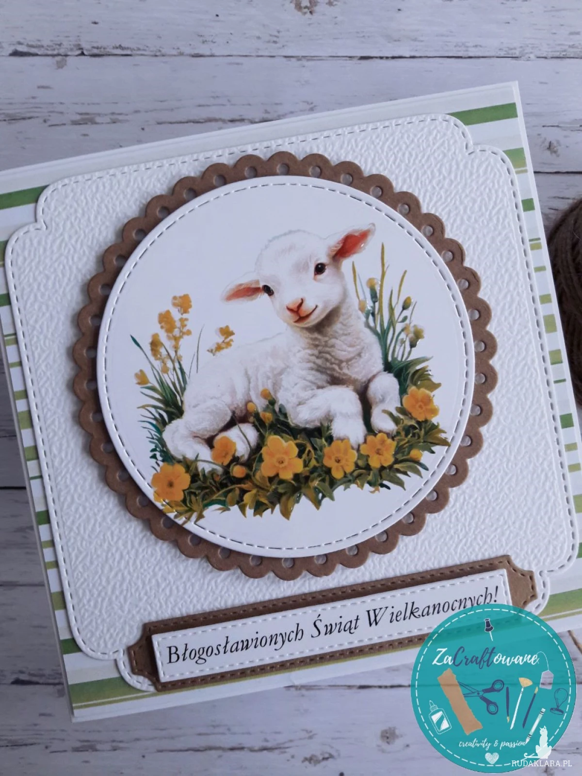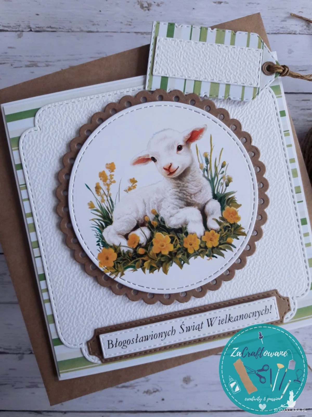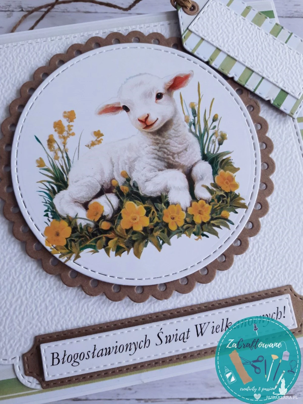 Ręcznie robiona kartka wielkanocna z barankiem wykonana metodą scrapbookingu, z dbałością o każdy szczegół.