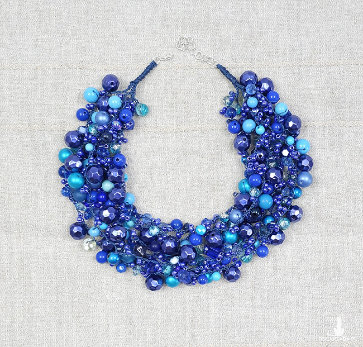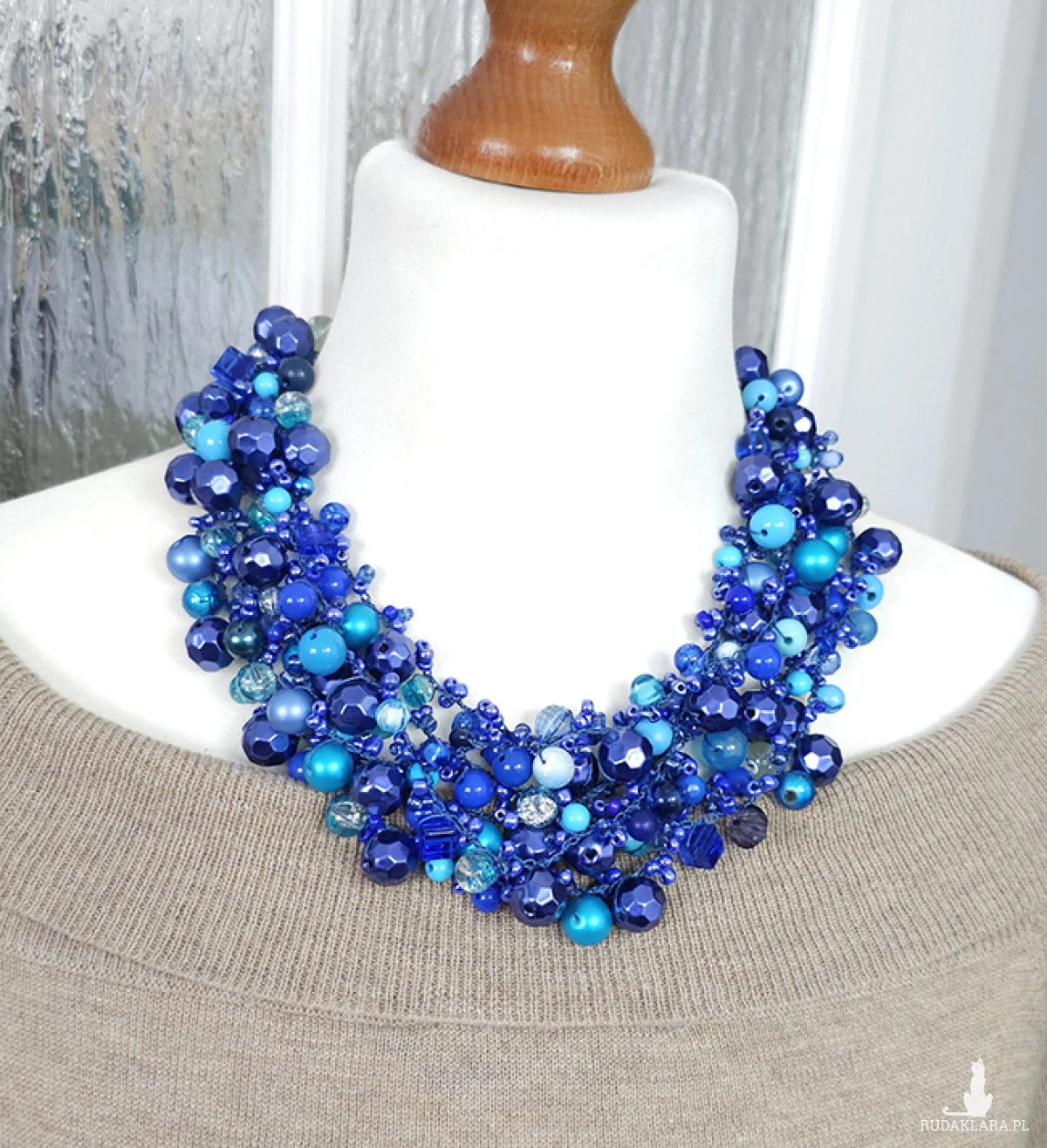 Elegancki naszyjnik w odcieniach granatu i niebieskiego. Jego subtelny blask i staranne wykonanie sprawiają, że jest idealnym dodatkiem na specjalne okazje oraz codzienne wyjścia. Kolia ta łączy w sobie nowoczesny design z klasycznym stylem, co czyni ją uniwersalnym wyborem dla każdej kobiety.