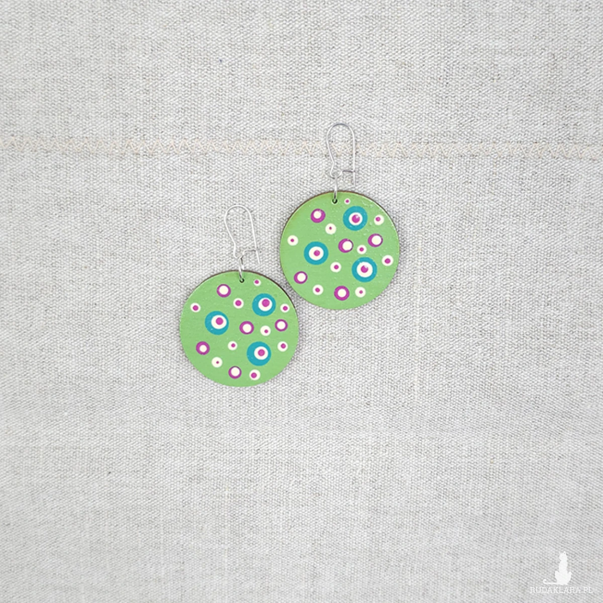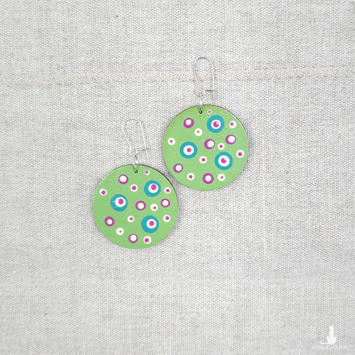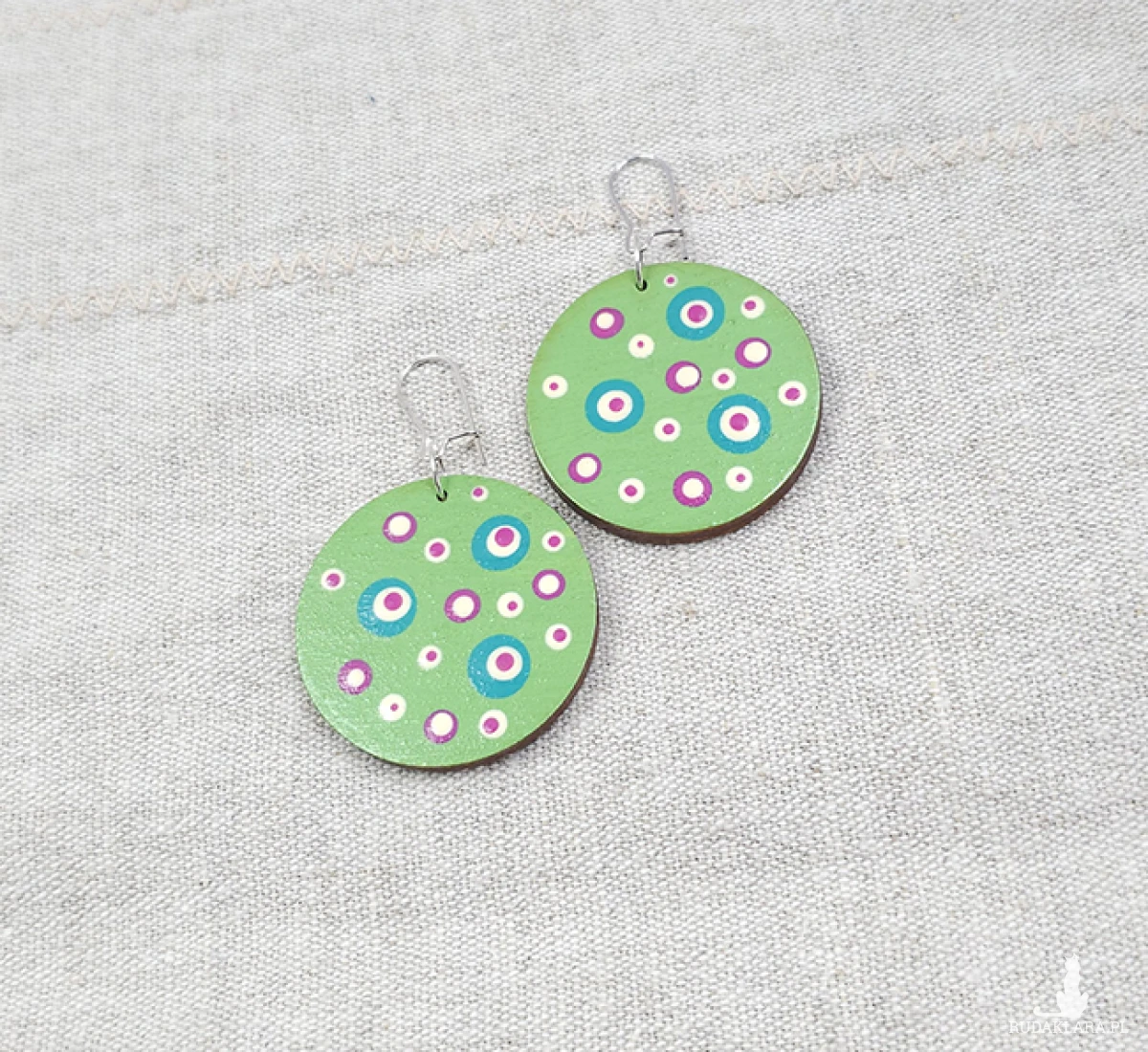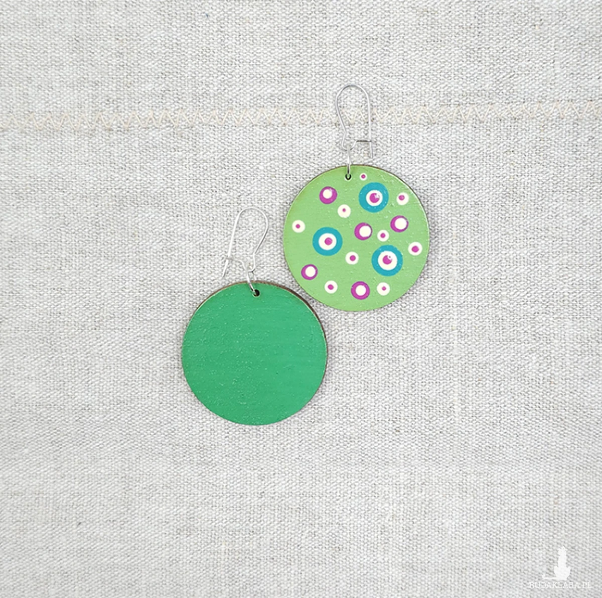 Baza drewniana, farby akrylowe, zabezpieczone nietoksycznym, bezzapachowym lakierem.