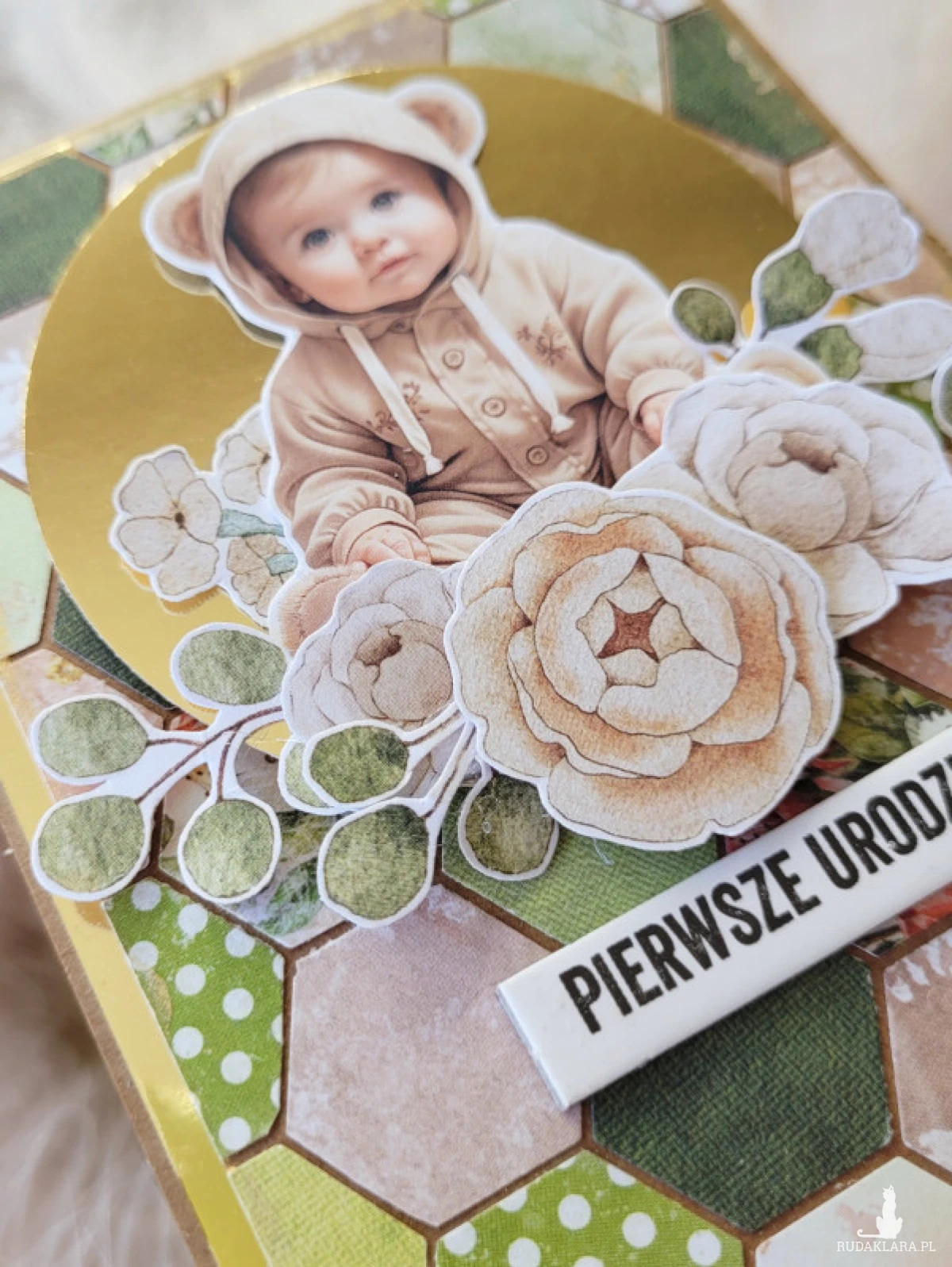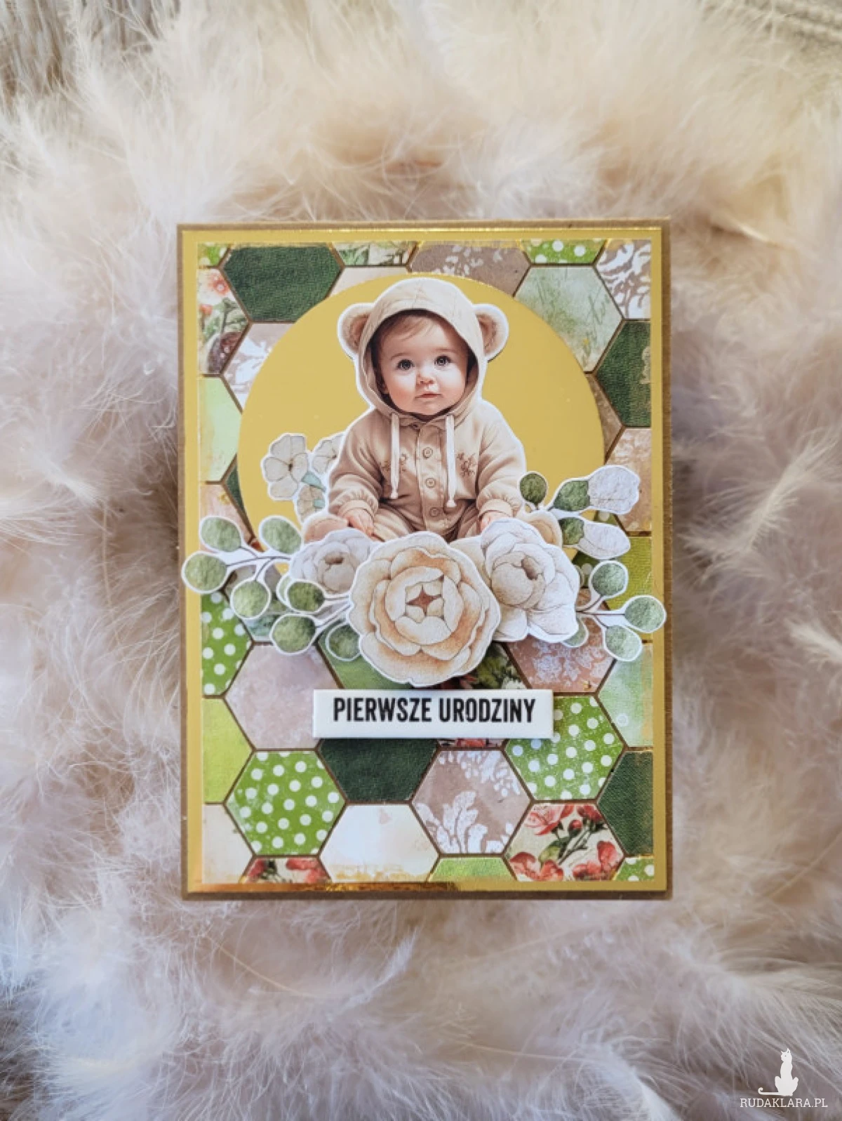 Wyjątkowa kartka stworzona z myślą o pierwszych urodzinach maluszka. Utrzymana w naturalnych barwach, z motywem uroczego dziecka w kapturku z uszkami, otoczonego kwiatami. Ciepła kolorystyka, złote detale i patchworkowy wzór w kształcie plastrów miodu nadają jej niepowtarzalnego uroku.