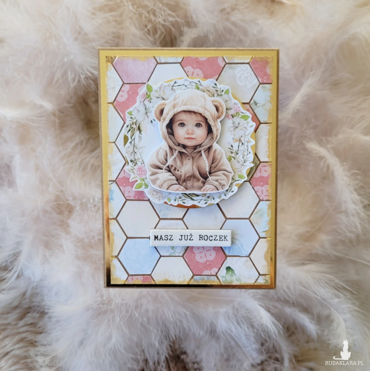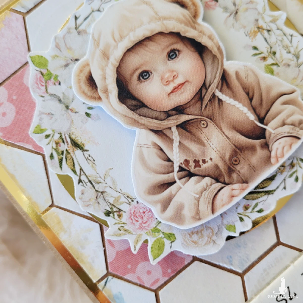 Kartka utrzymana jest w ciepłej, naturalnej kolorystyce. Głównym elementem jest ilustracja uroczego dziecka w miękkiej bluzie z uszkami, otoczonego delikatnym, kwiatowym motywem. Tło kartki zdobi wzór w formie plastrów miodu, który łączy odcienie beżu, różu i złota, nadając jej elegancji i wyjątkowego charakteru. Dzięki warstwowej kompozycji i przestrzennym dekoracjom kartka wygląda niezwykle efektownie.