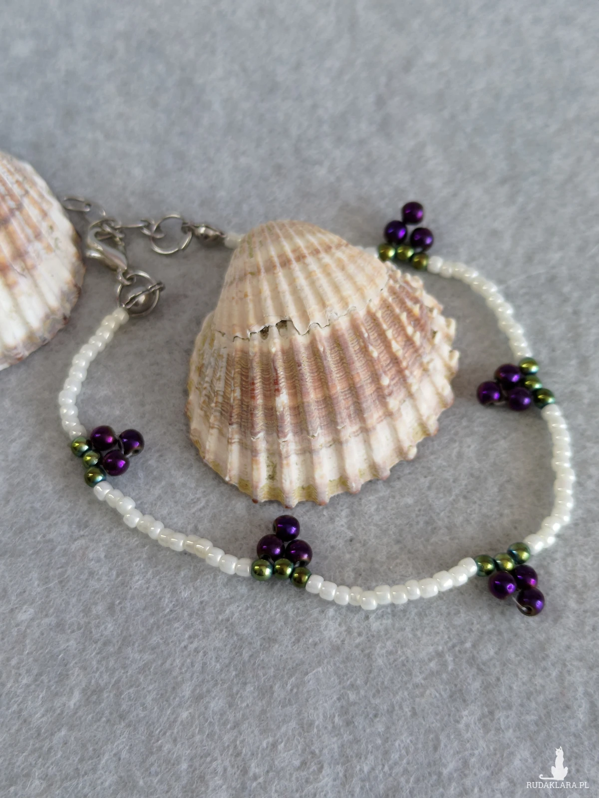 Bransoletka wykonana jest z koralików toho w kolorze perłowym, winogrona to 3 maleńkie hematyty z ogonkiem z zielonego hematytu. Będzie idealnym dodatkiem do każdej stylizacji. Bransoletka posiada zapięcie ze stali chirurgicznej,