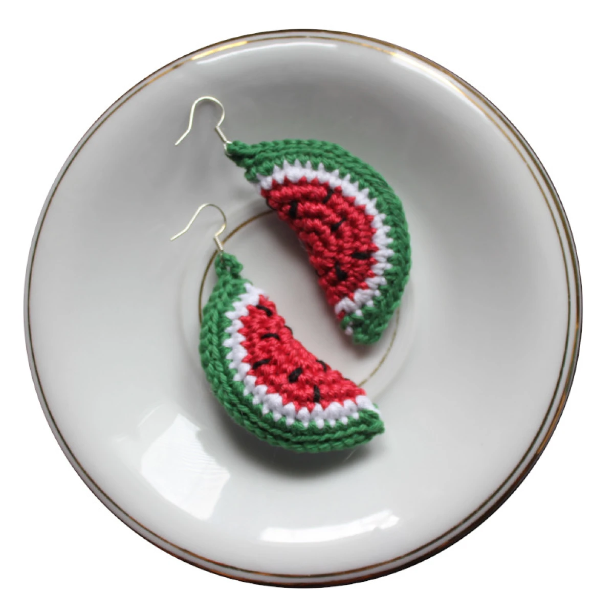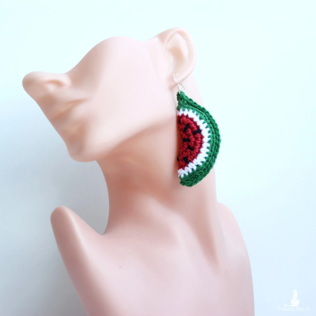 Kolczyki Arbuzy, albo raczej kawałki arbuza, zrobione na szydełku.