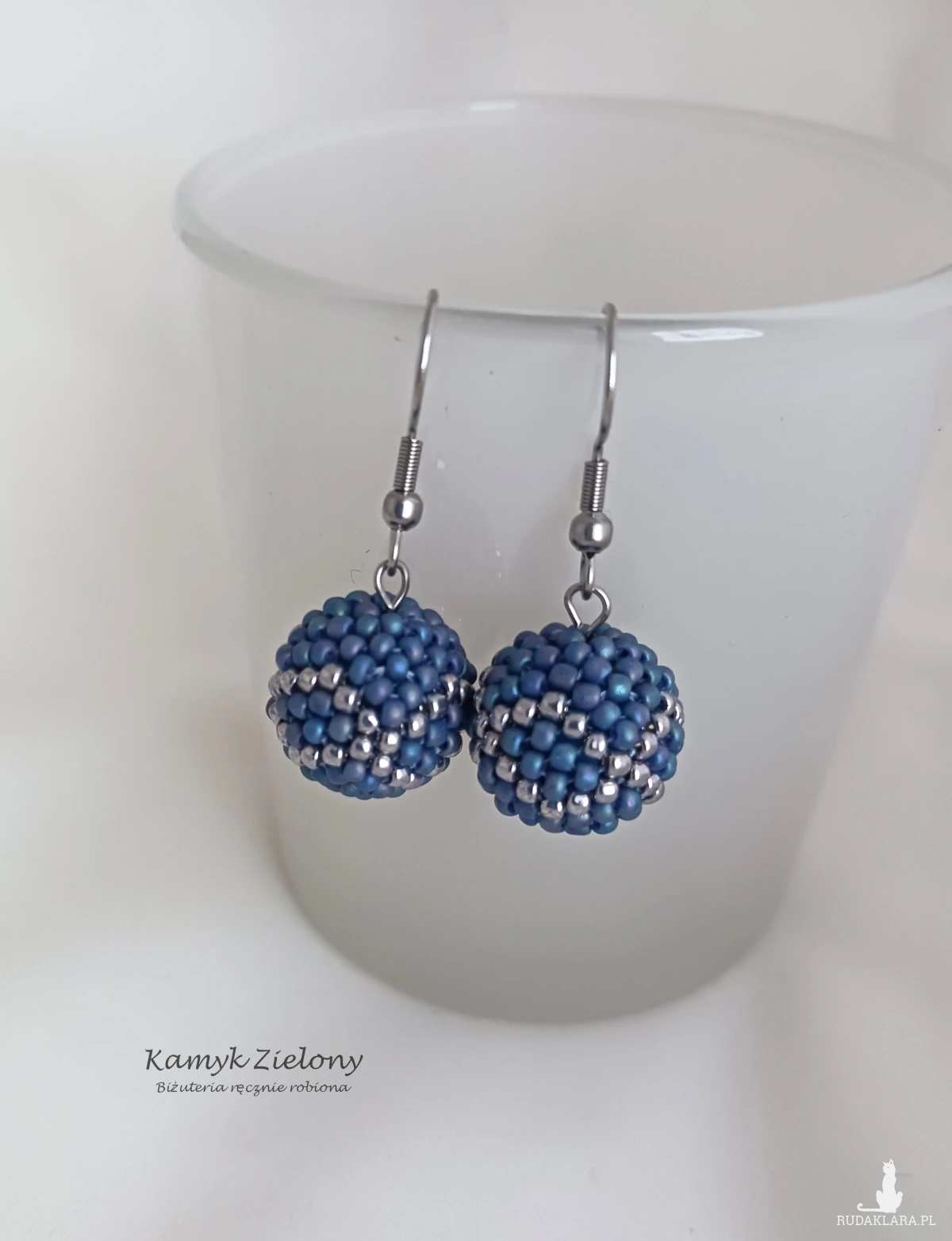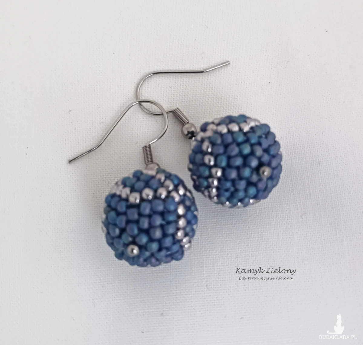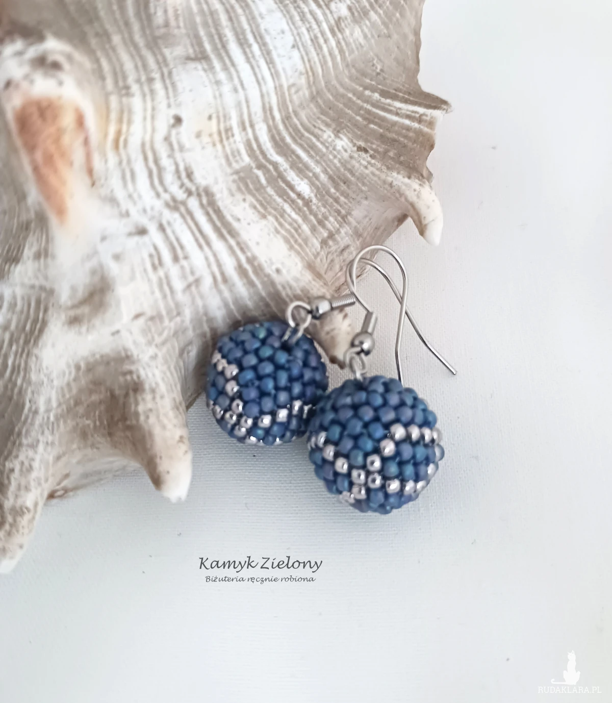 Wiszące kolczyki wykonane ręcznie z drobniutkich, szklanych koralików Toho w niebieskim kolorze o satynowym połysku oraz koralików w kolorze srebrnym, o niebieskawym odcieniu.